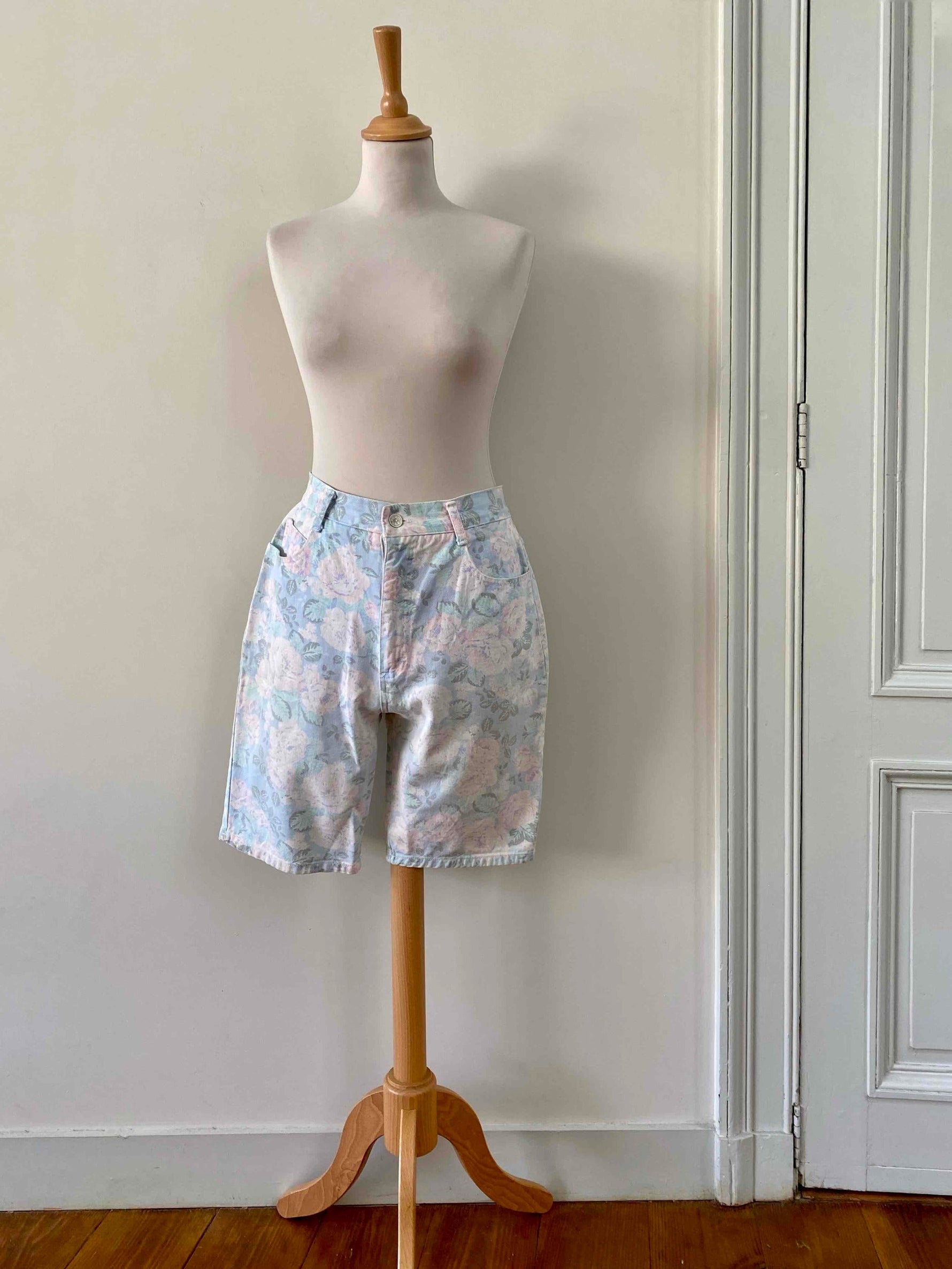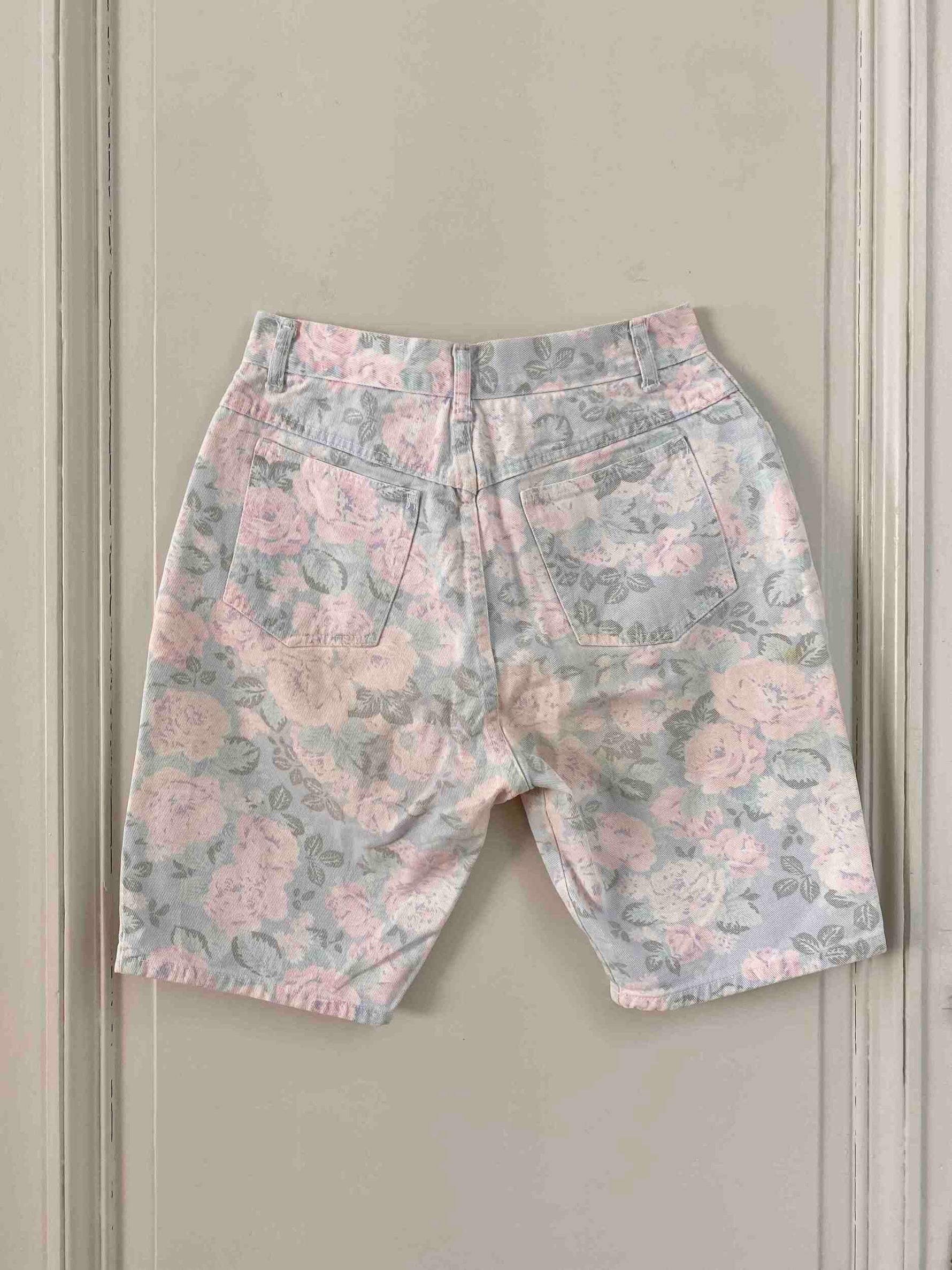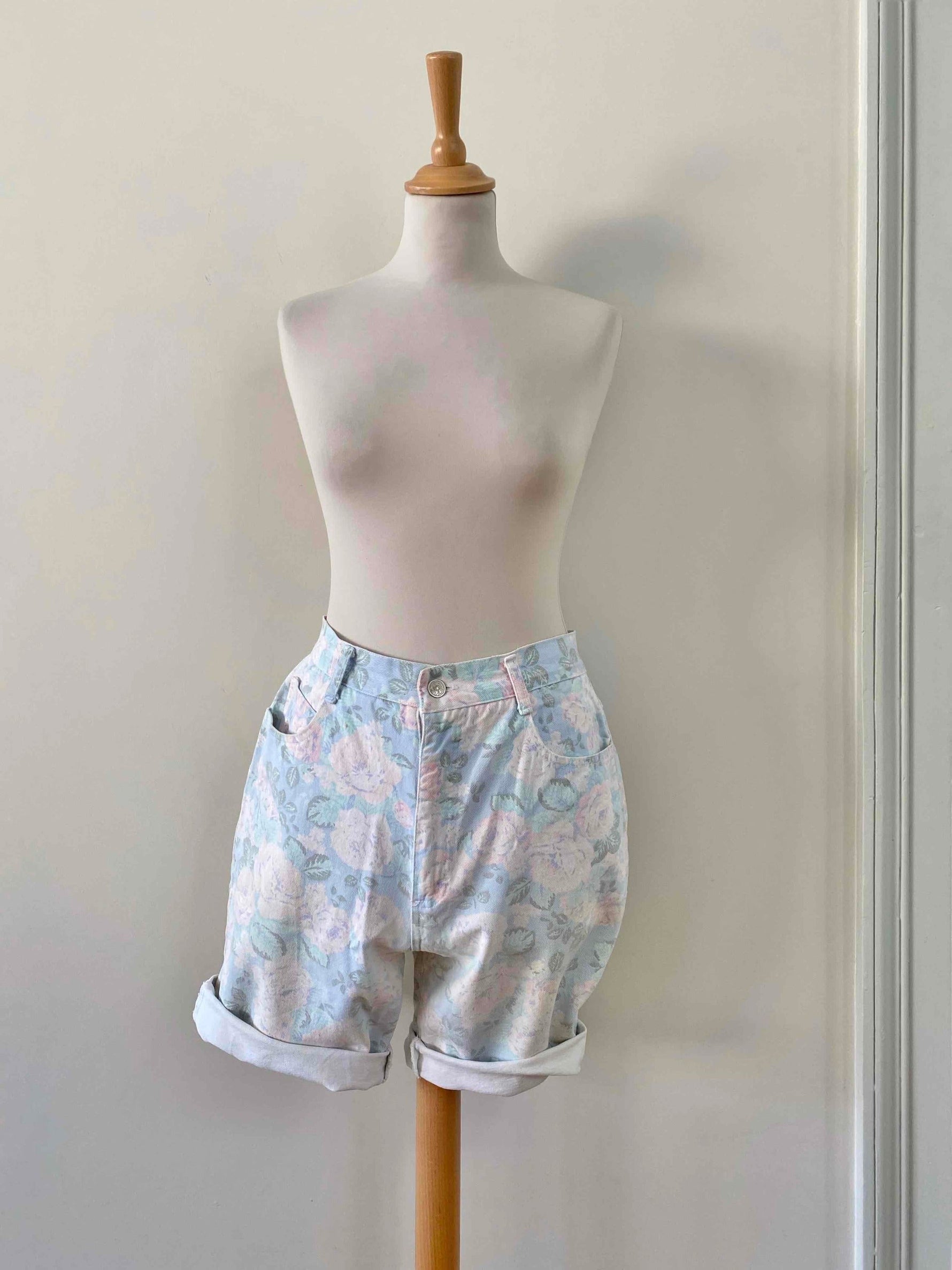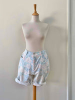 Floral print denim cotton canvas shorts, pastel floral print, Bermuda style, made in the USA, hips 48cm.