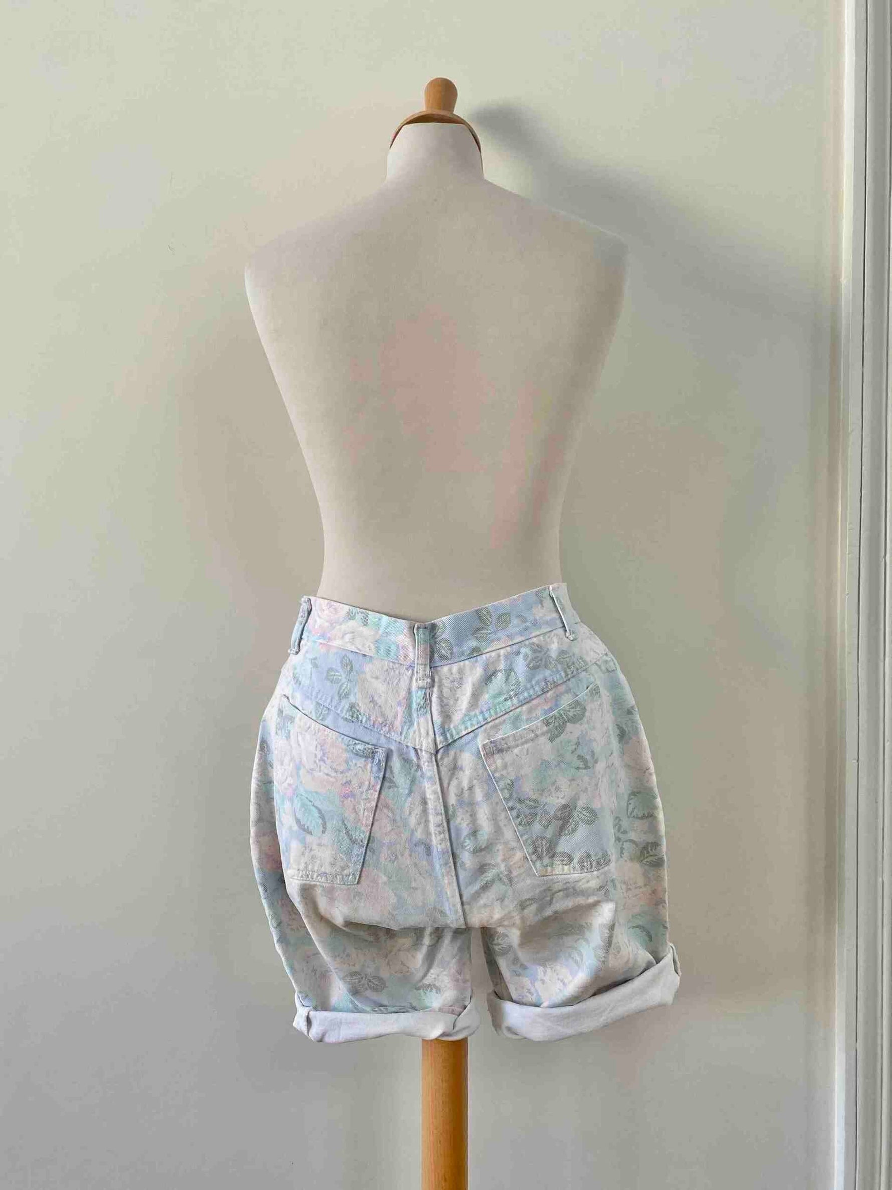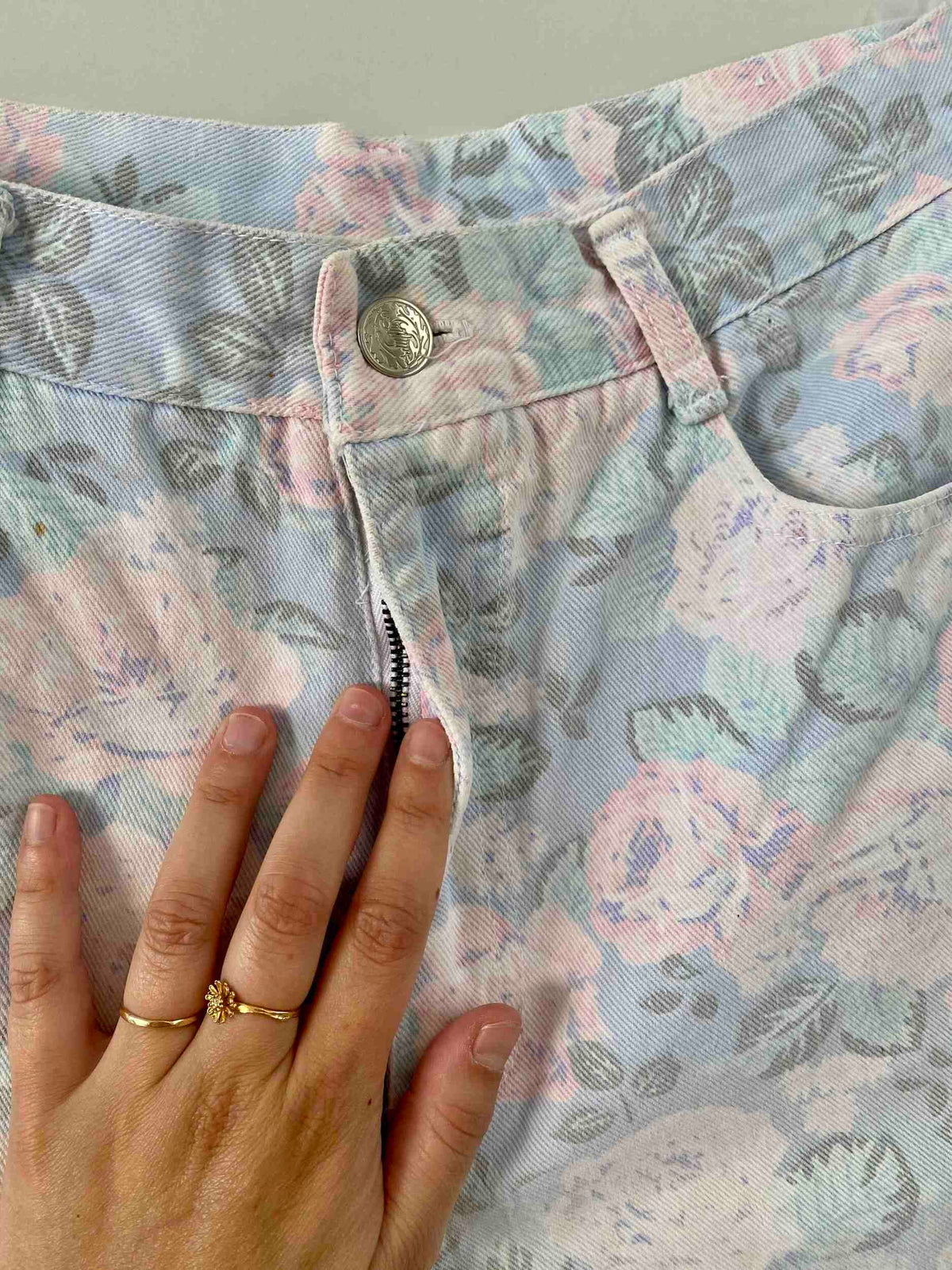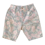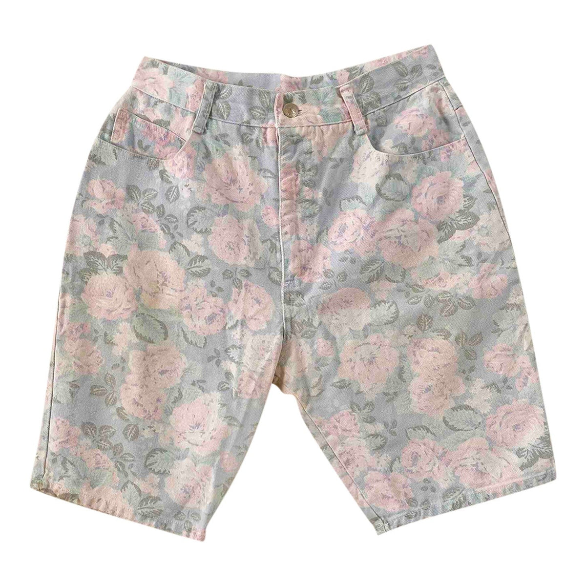 Floral print denim cotton canvas shorts, pastel floral print, Bermuda style, made in the USA, hips 48cm.