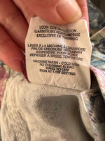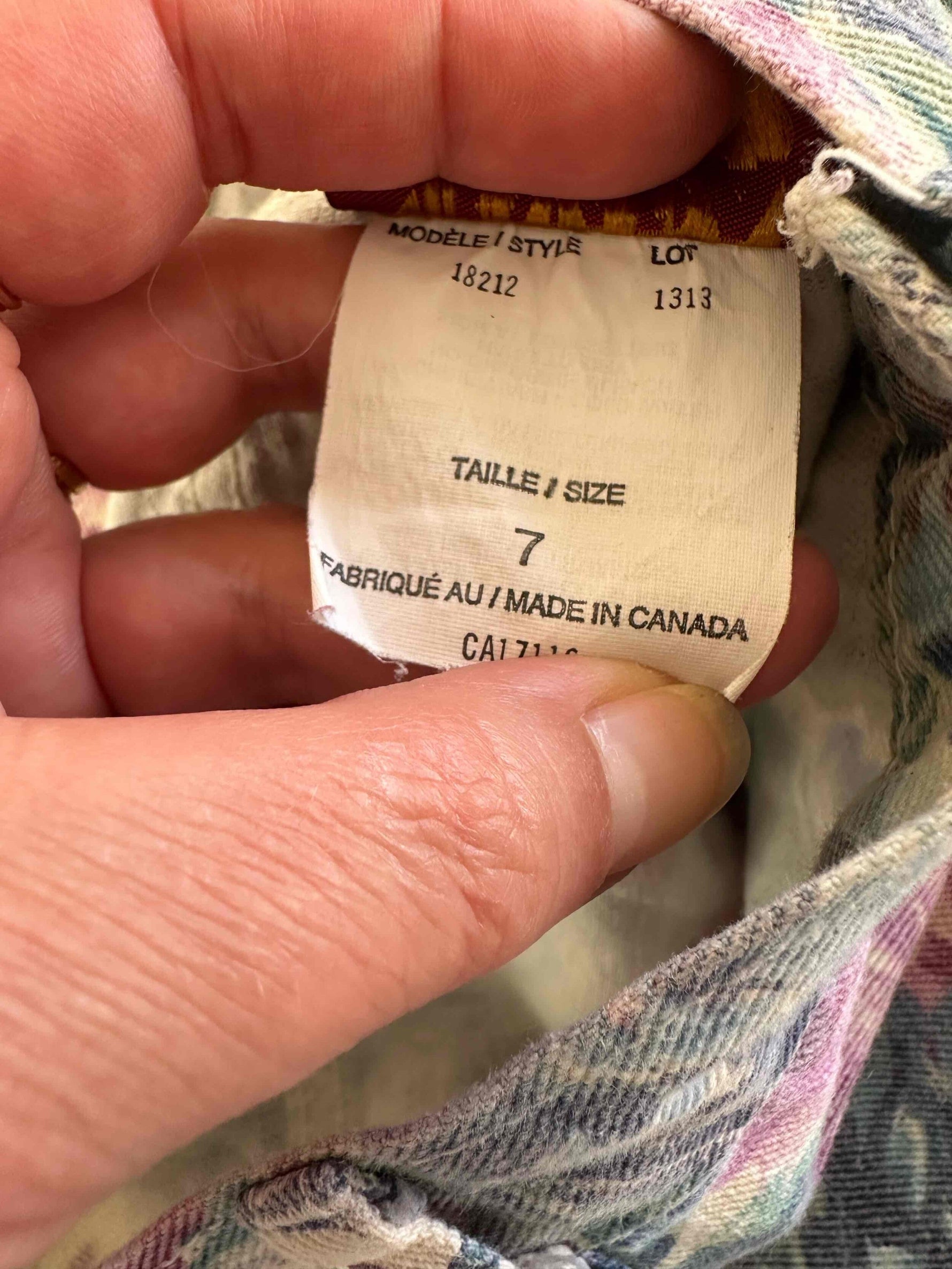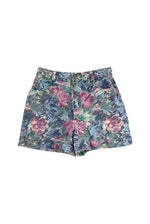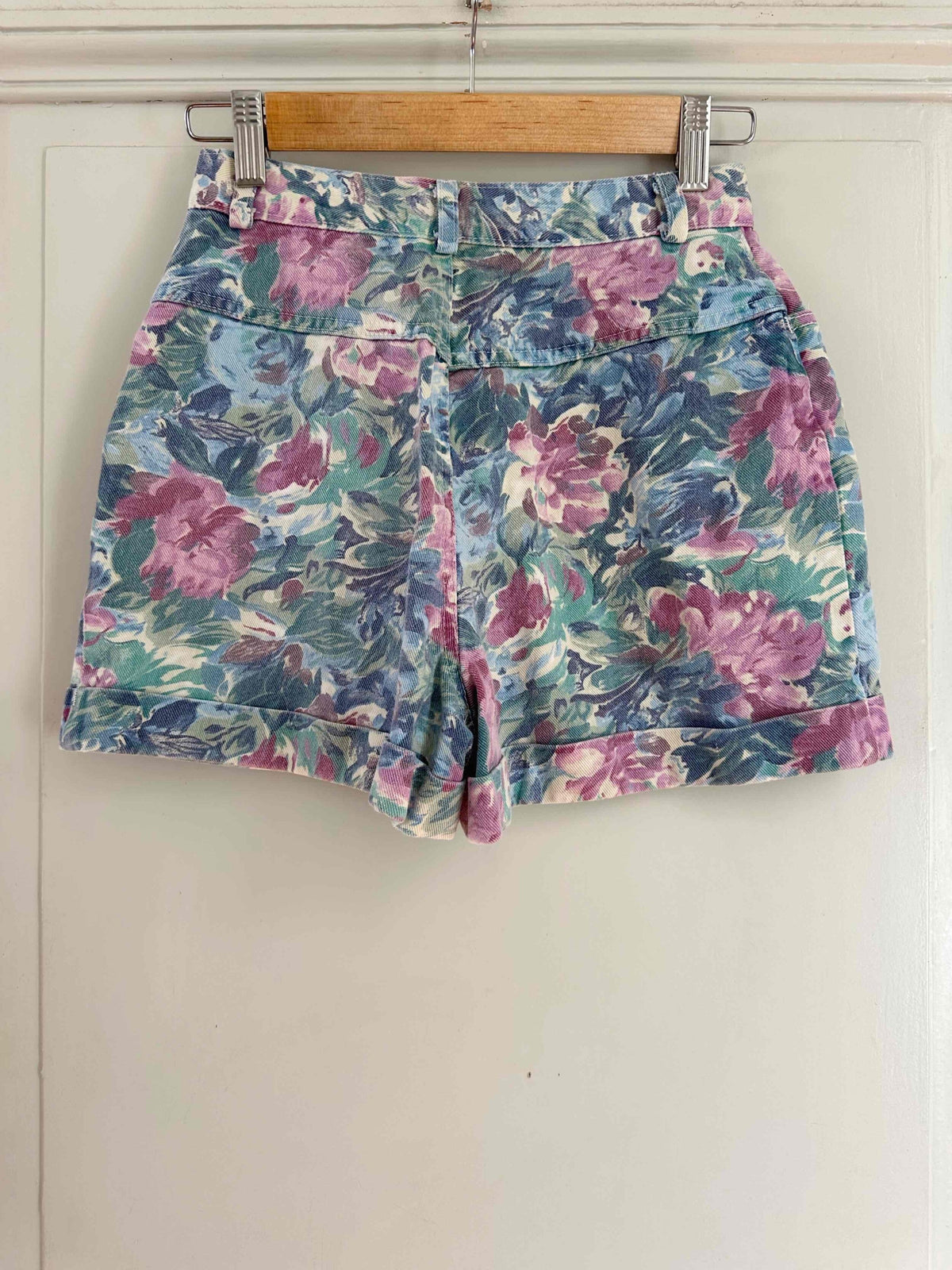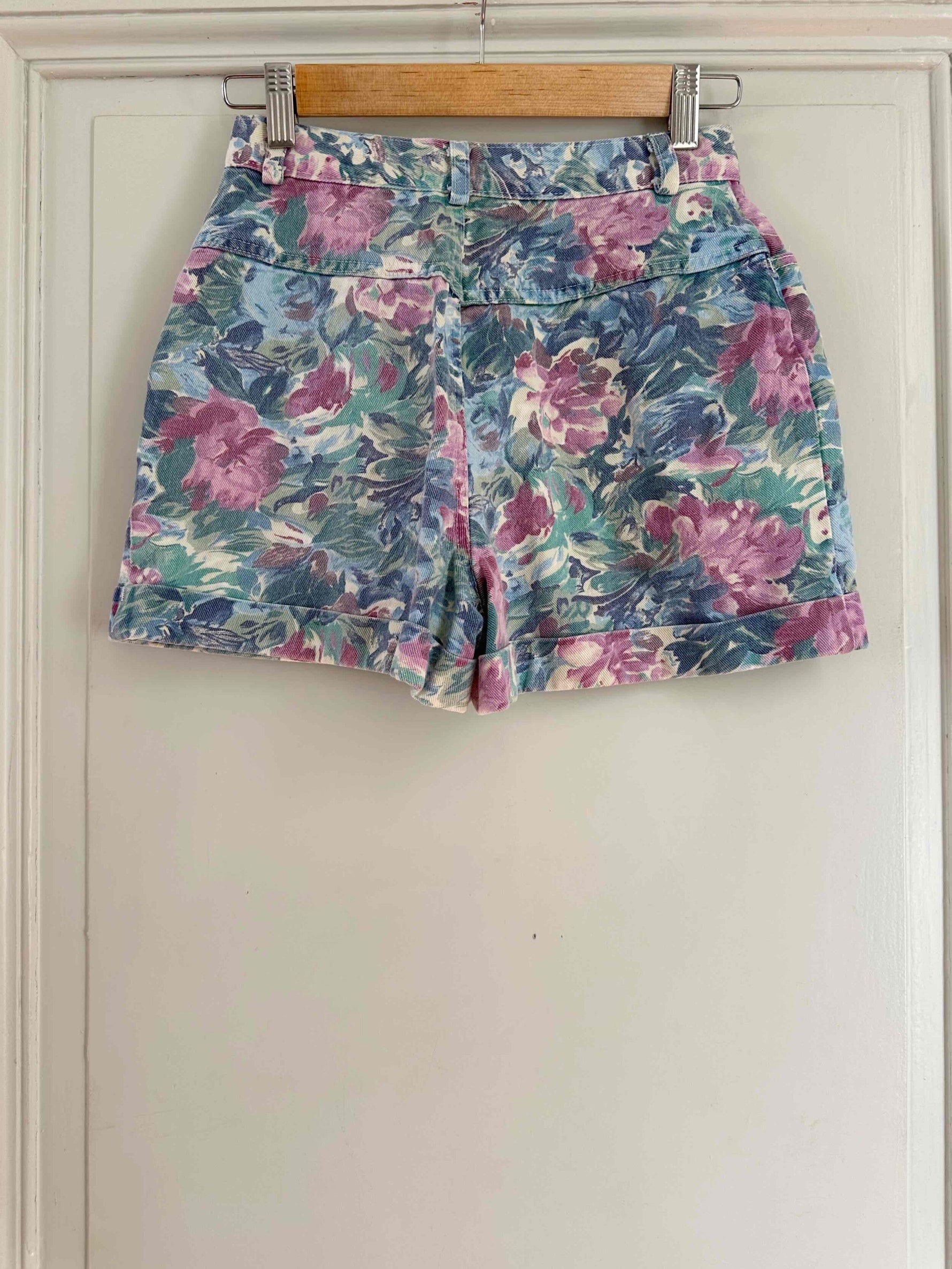Unit price perFloral denim shorts, made of 100% watercolor floral print denim in shades of blue, lilac, and pink, with rolled hems, made in Canada, size 34.