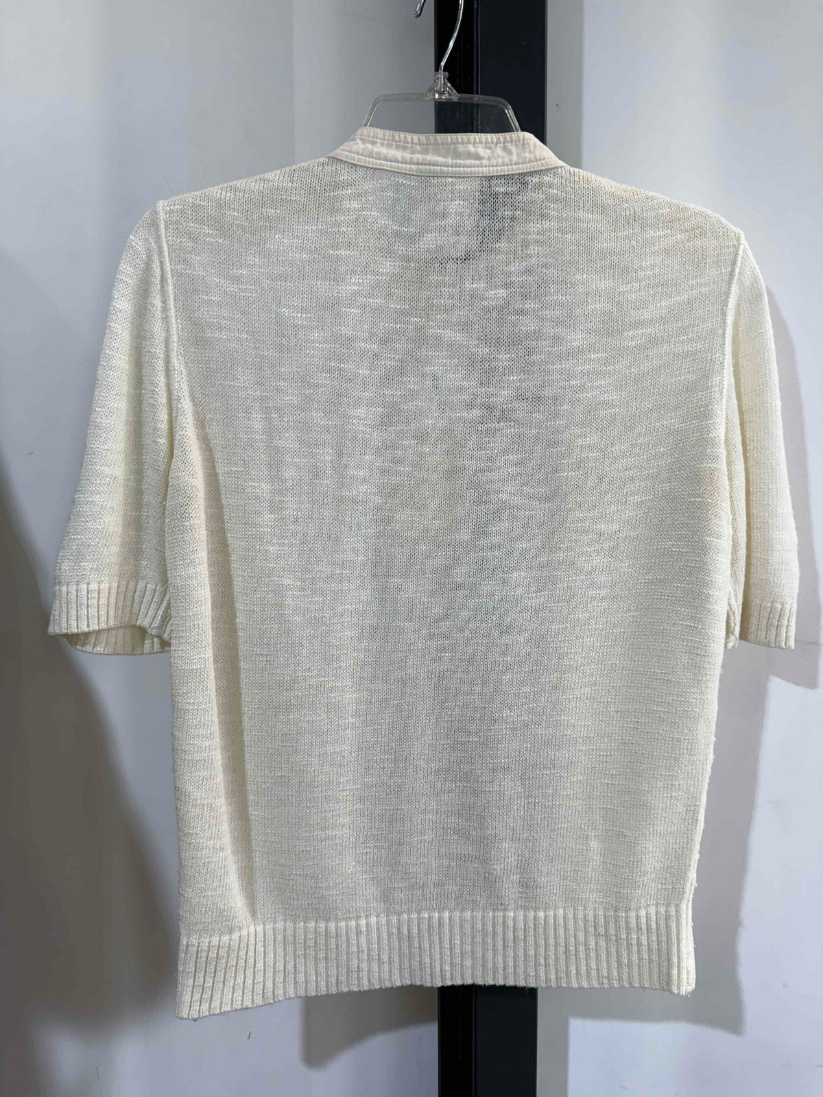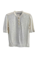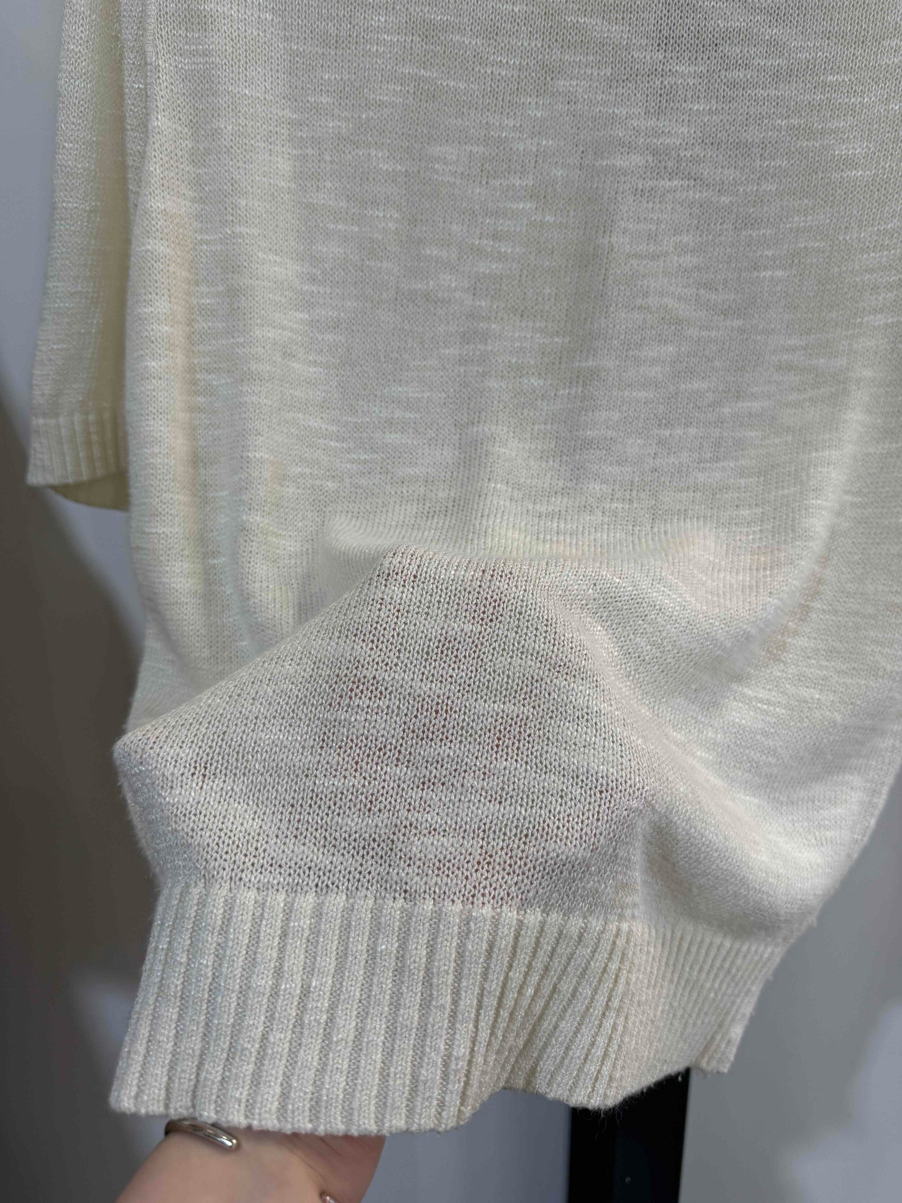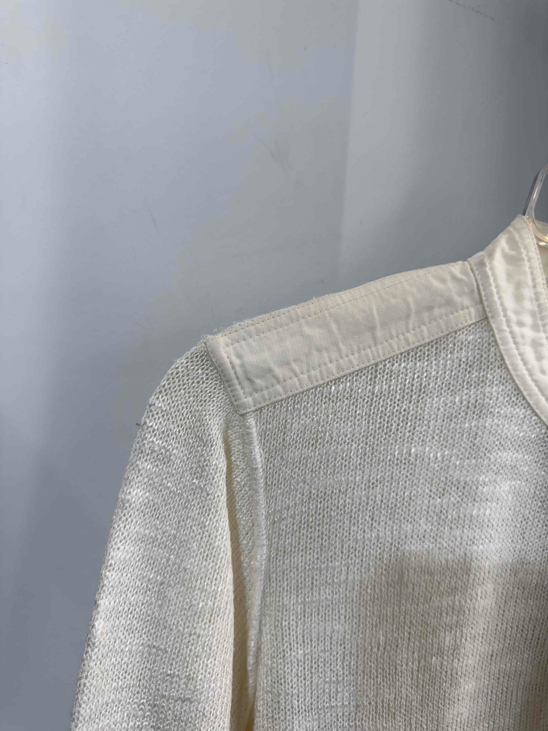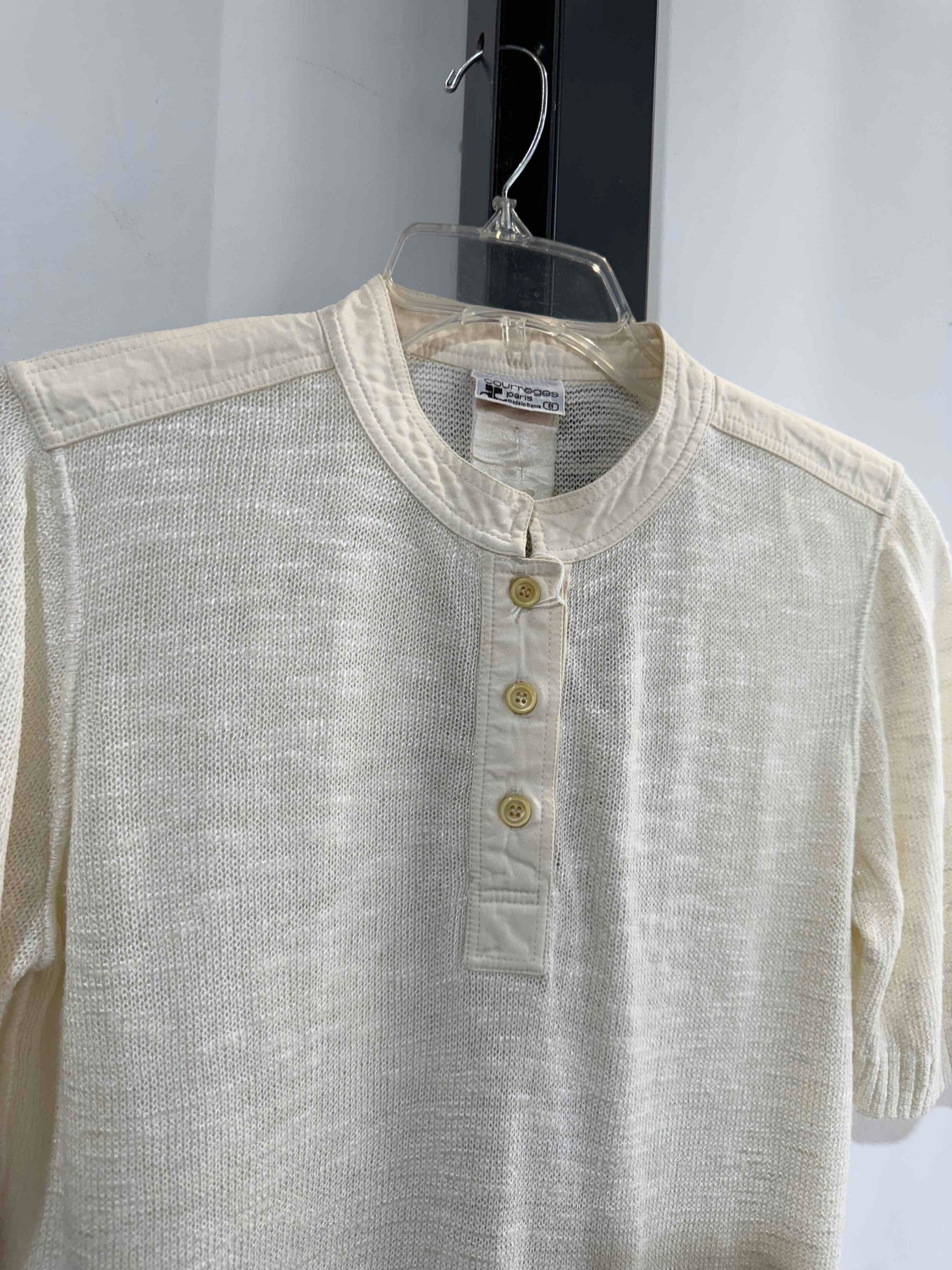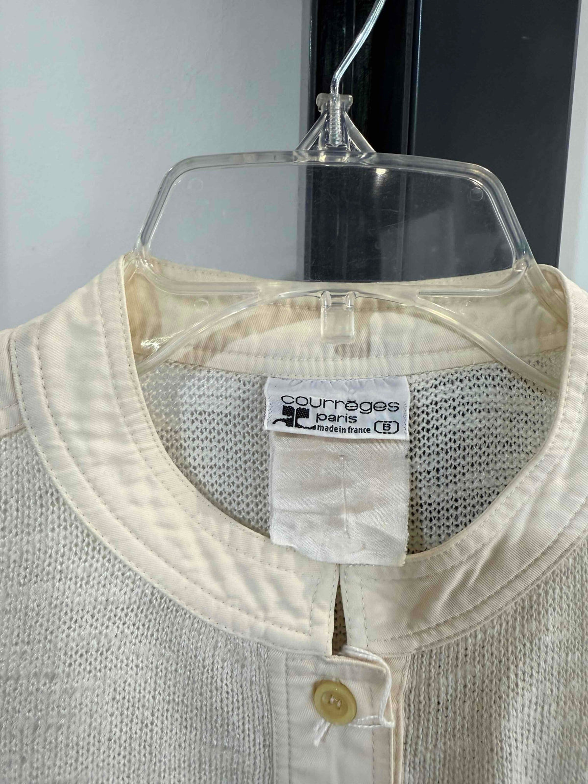 Unit price perVintage off-white/ivory knit t-shirt by Courrèges. Composition label faded (cotton blend). Excellent condition. Sheer, mottled knit. Short sleeves. Made in France.