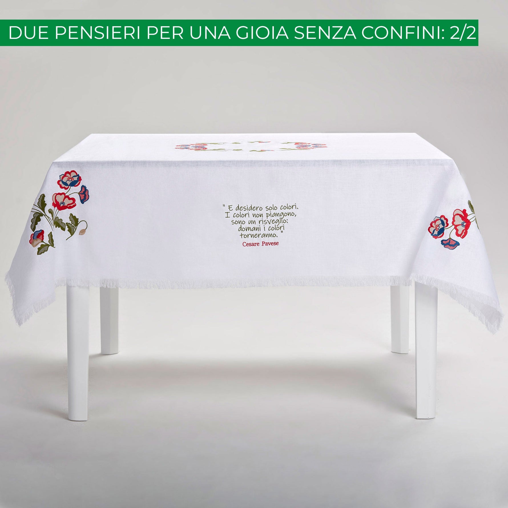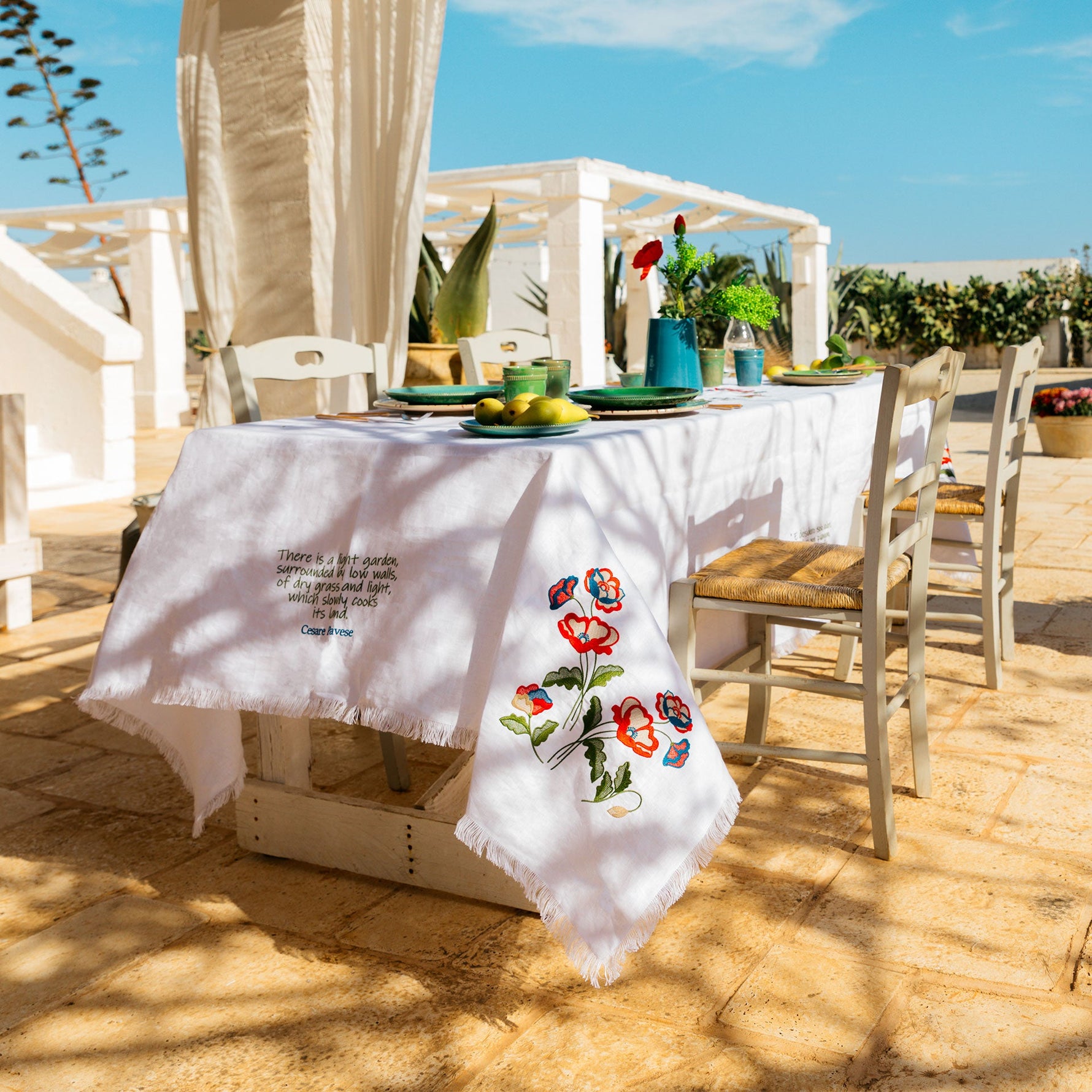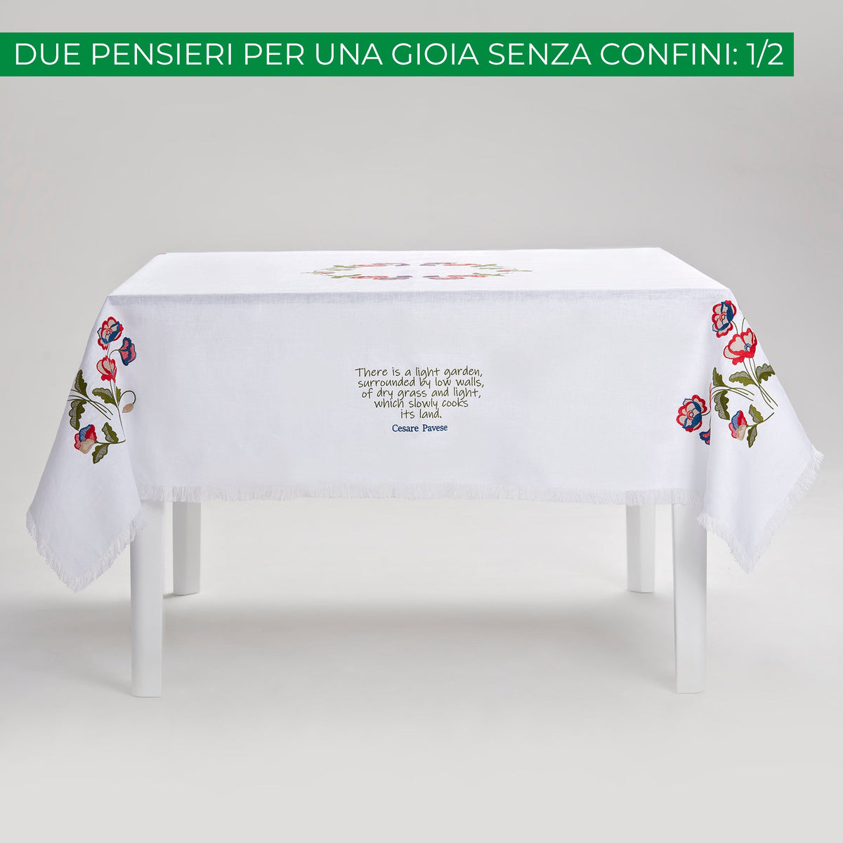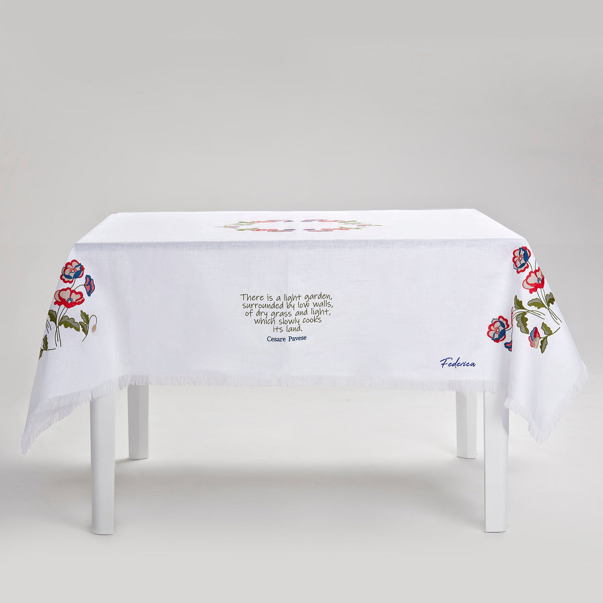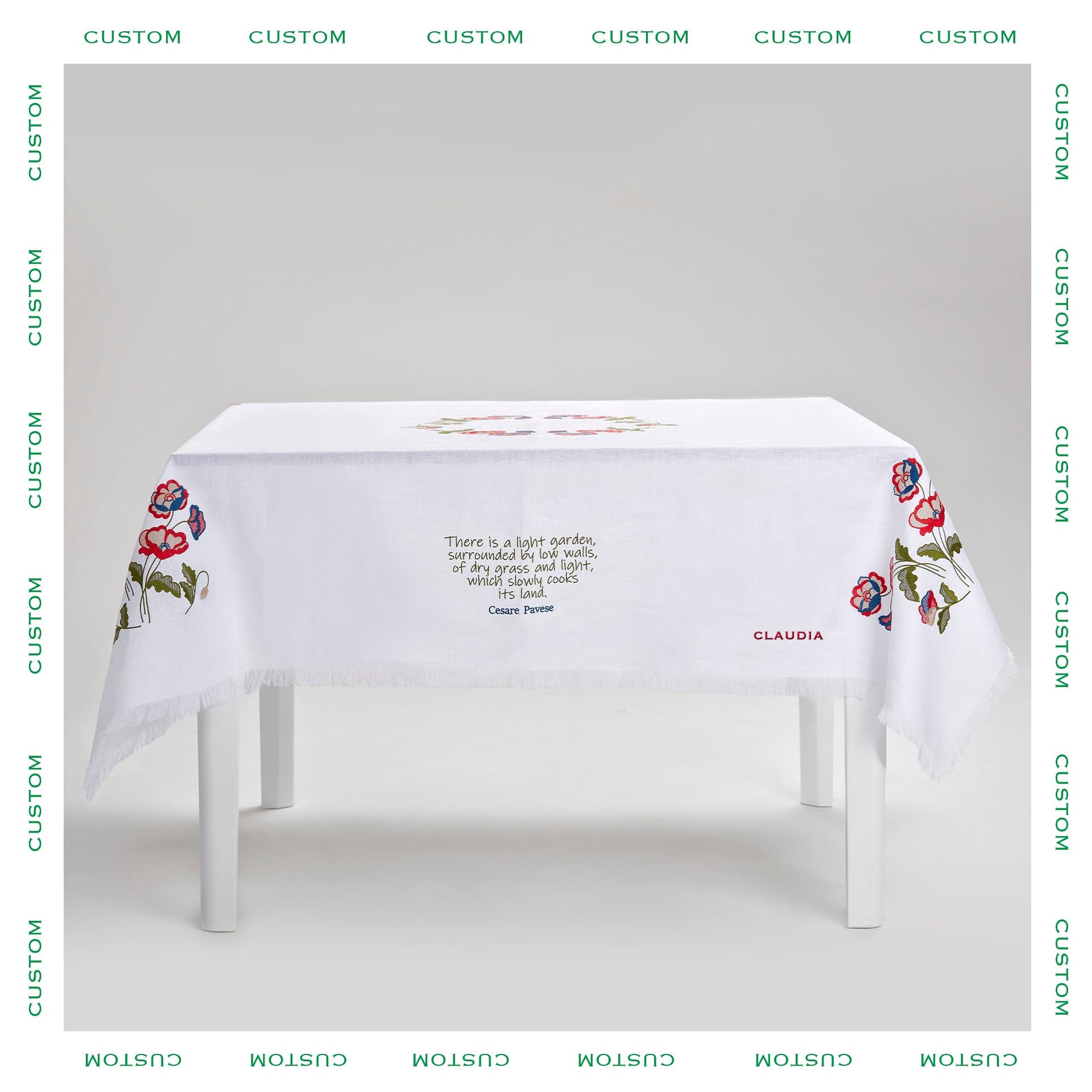 Tovaglia artigianale ricamata in Italia con cotone makò su lino certificato Masters of linen.