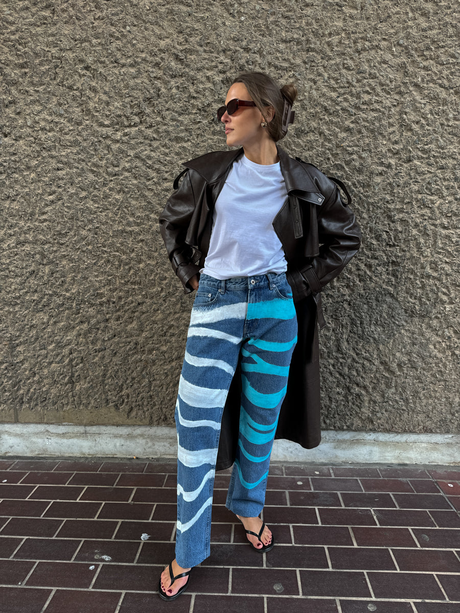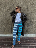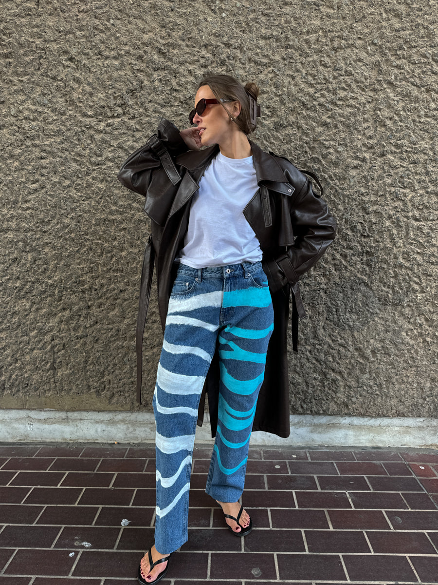 Discover our upcycled striped art jeans , decorated with white and blue fabric paint on each leg. Each piece is unique as it's made from reclaimed vintage denim , which may result in slight variations in color and fit.