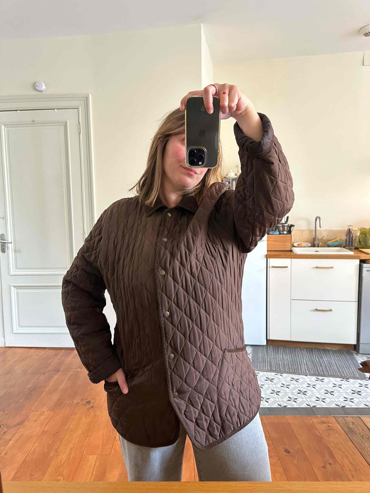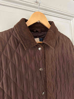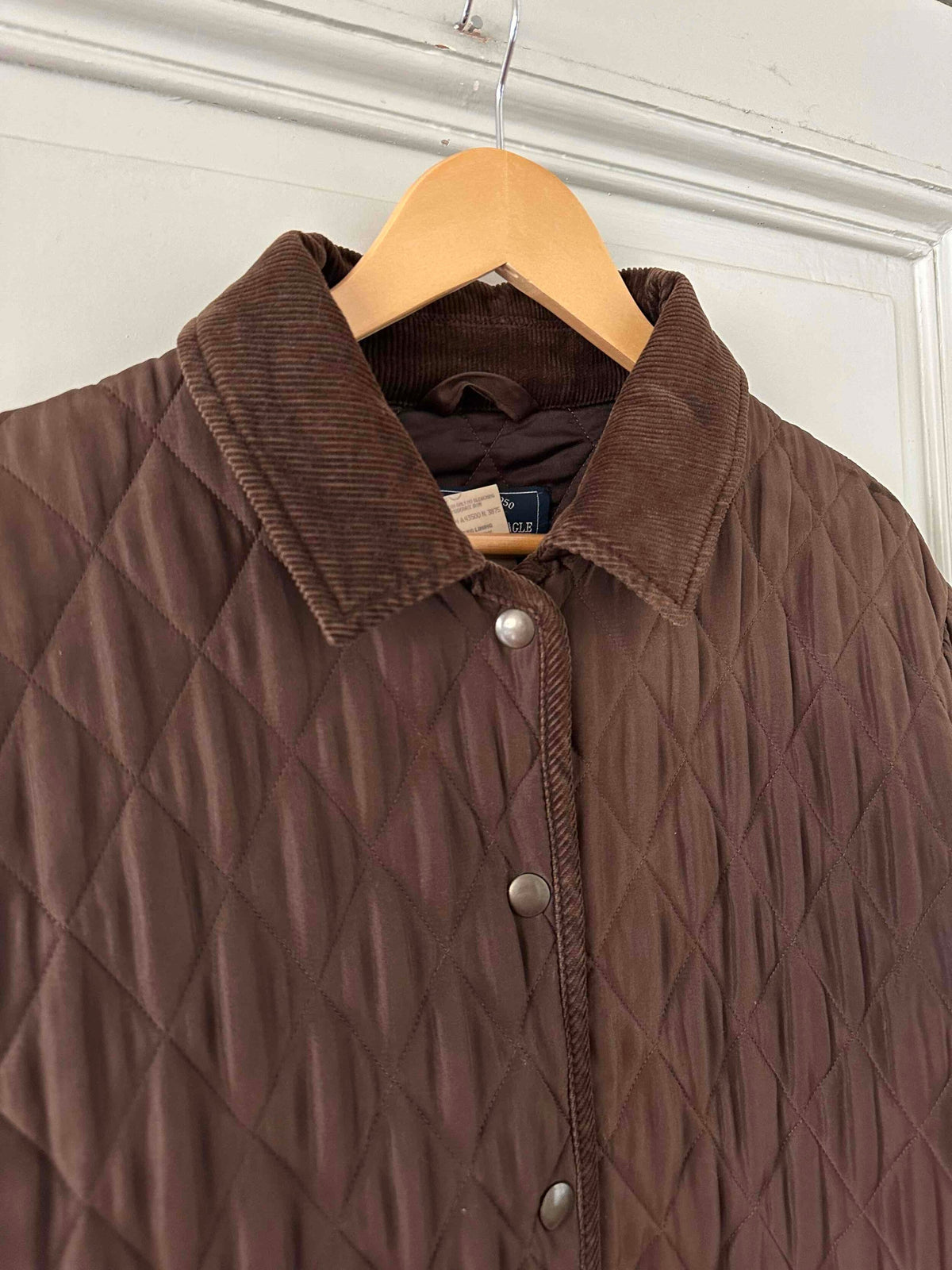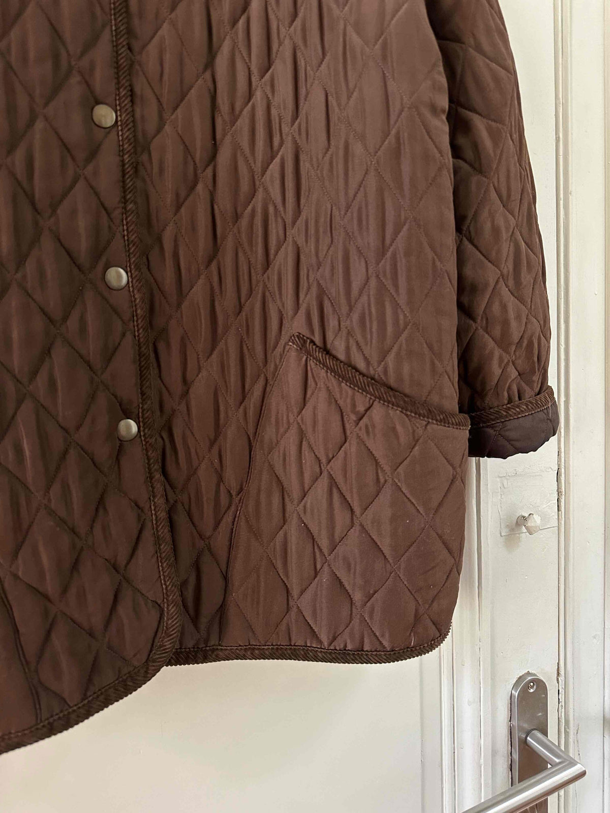 Unit price perQuilted jacket in chocolate-colored silk, quilted with wadding in a crisscross pattern, ribbed velvet collar and trim, barn jacket style, snap buttons, 1980s, made in Italy, fits sizes 38 and 40, worn here on a size 40 model.