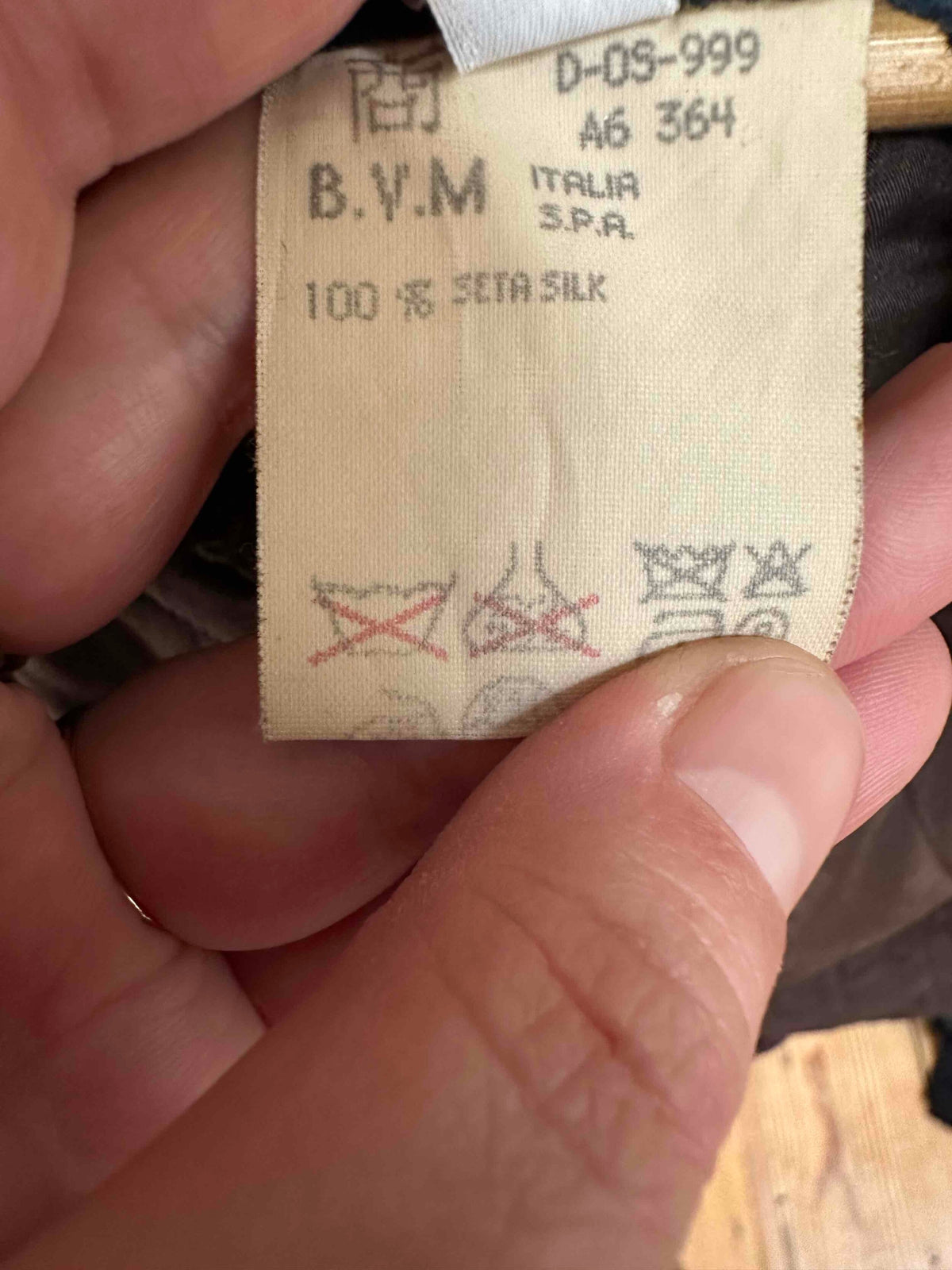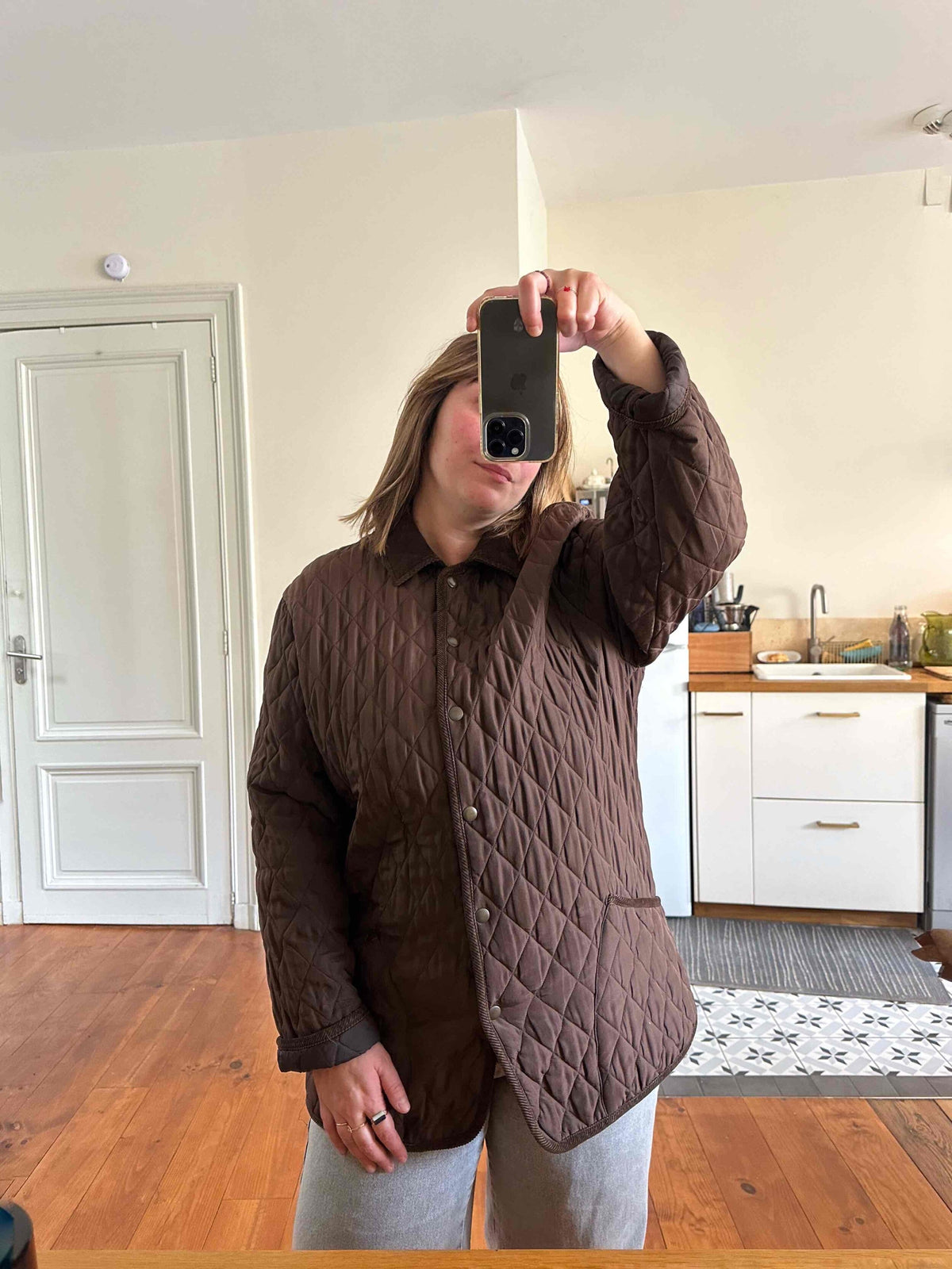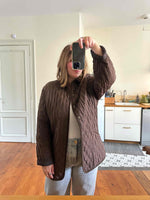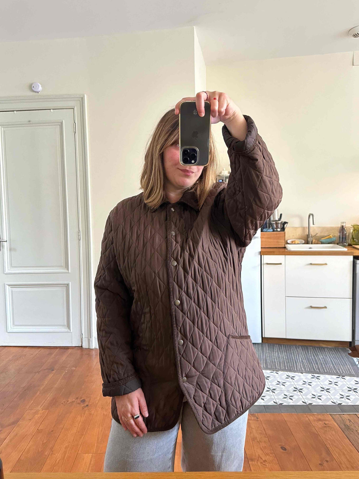 Unit price perQuilted jacket in chocolate-colored silk, quilted with wadding in a crisscross pattern, ribbed velvet collar and trim, barn jacket style, snap buttons, 1980s, made in Italy, fits sizes 38 and 40, worn here on a size 40 model.