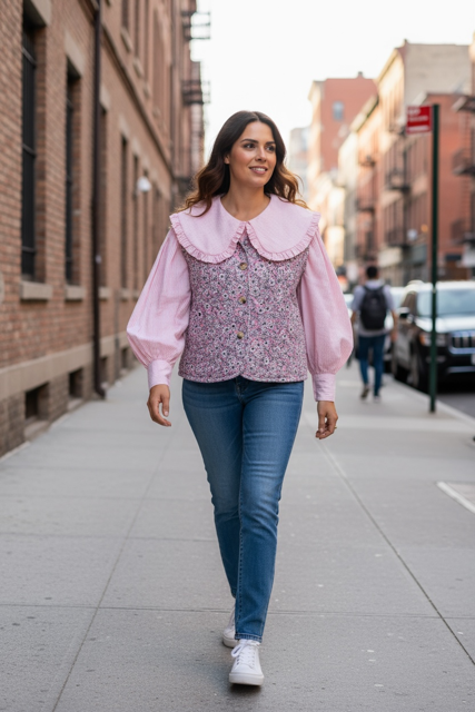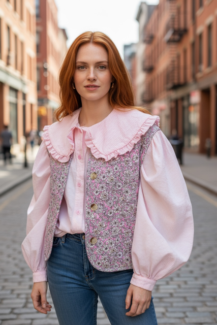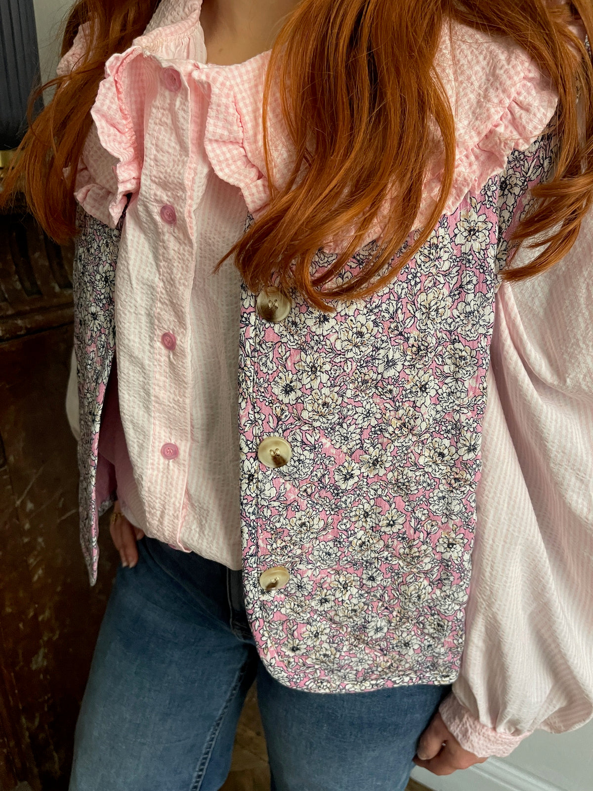 This lightweight quilted vest adds a romantic touch with its pink and white floral print. Its round buttons and comfortable fit make it perfect for layering: over a smart shirt or a more casual sweater, it instantly enhances the silhouette with softness and femininity. One size fits all. Made in China. Material: 100% polyester. Care: Machine wash at 30°C on a delicate cycle at 800 rpm.