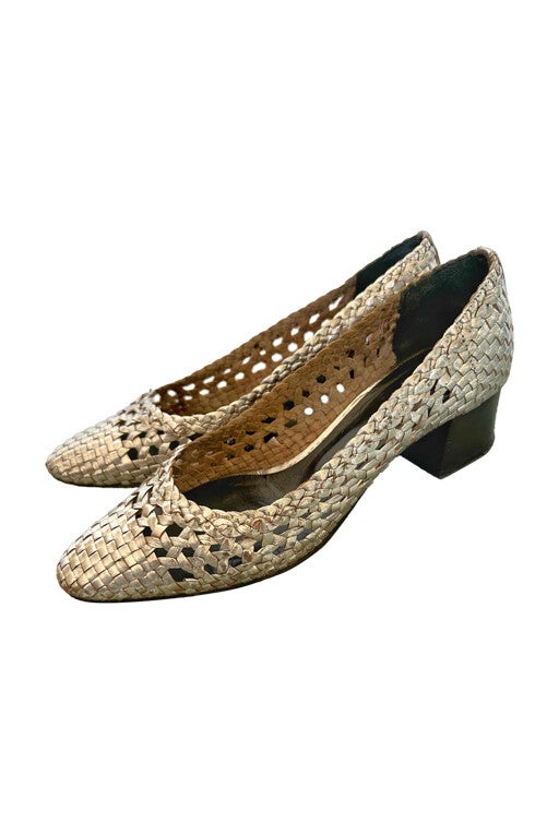 Babies tressées Carel, en cuir tressé argenté, modele Santon, pointure 36, talons 4,5cm, longueur semelle 24cm.