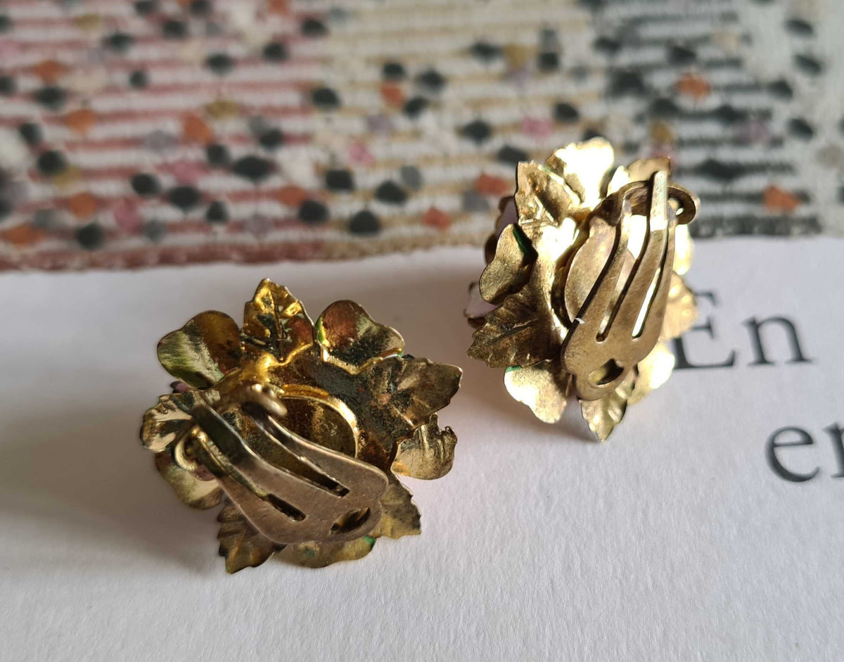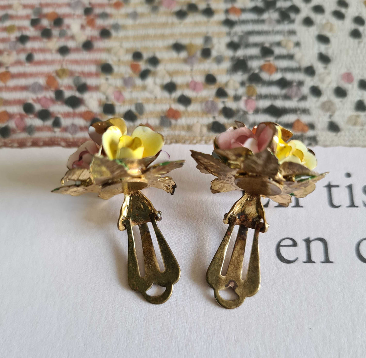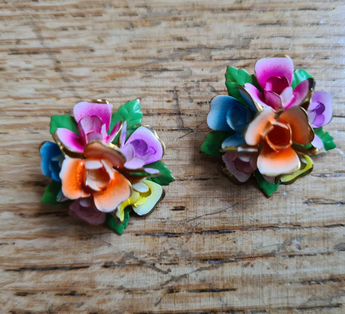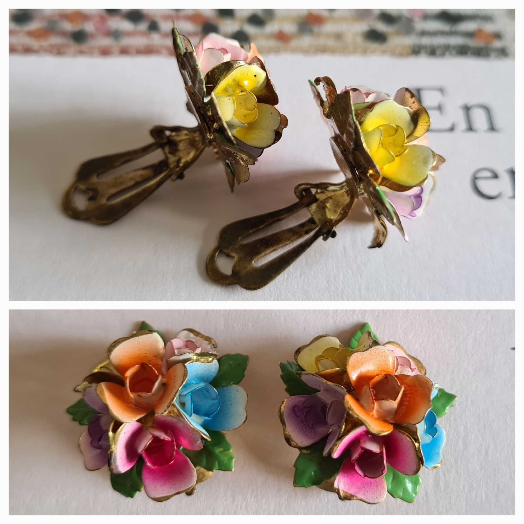 Prix unitaire parBoucles d'oreilles clips des années 70, à fleurs multicolores, en feuilles de métal émaillées.