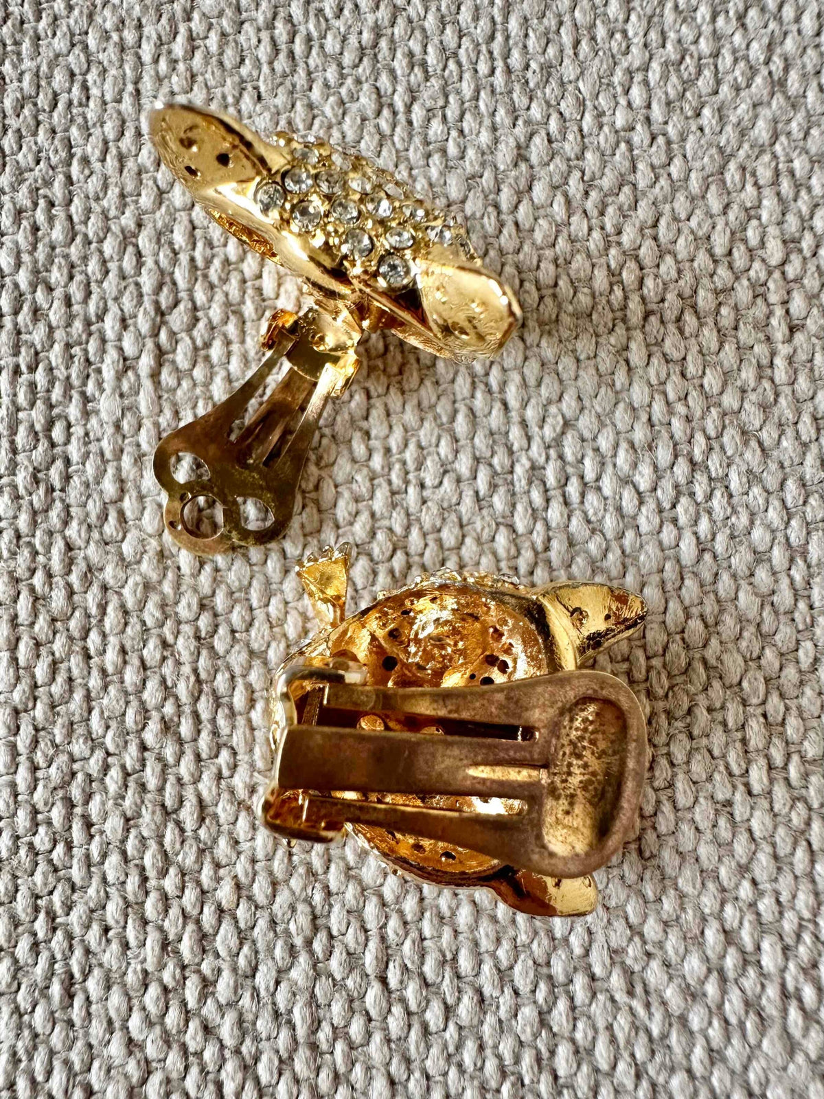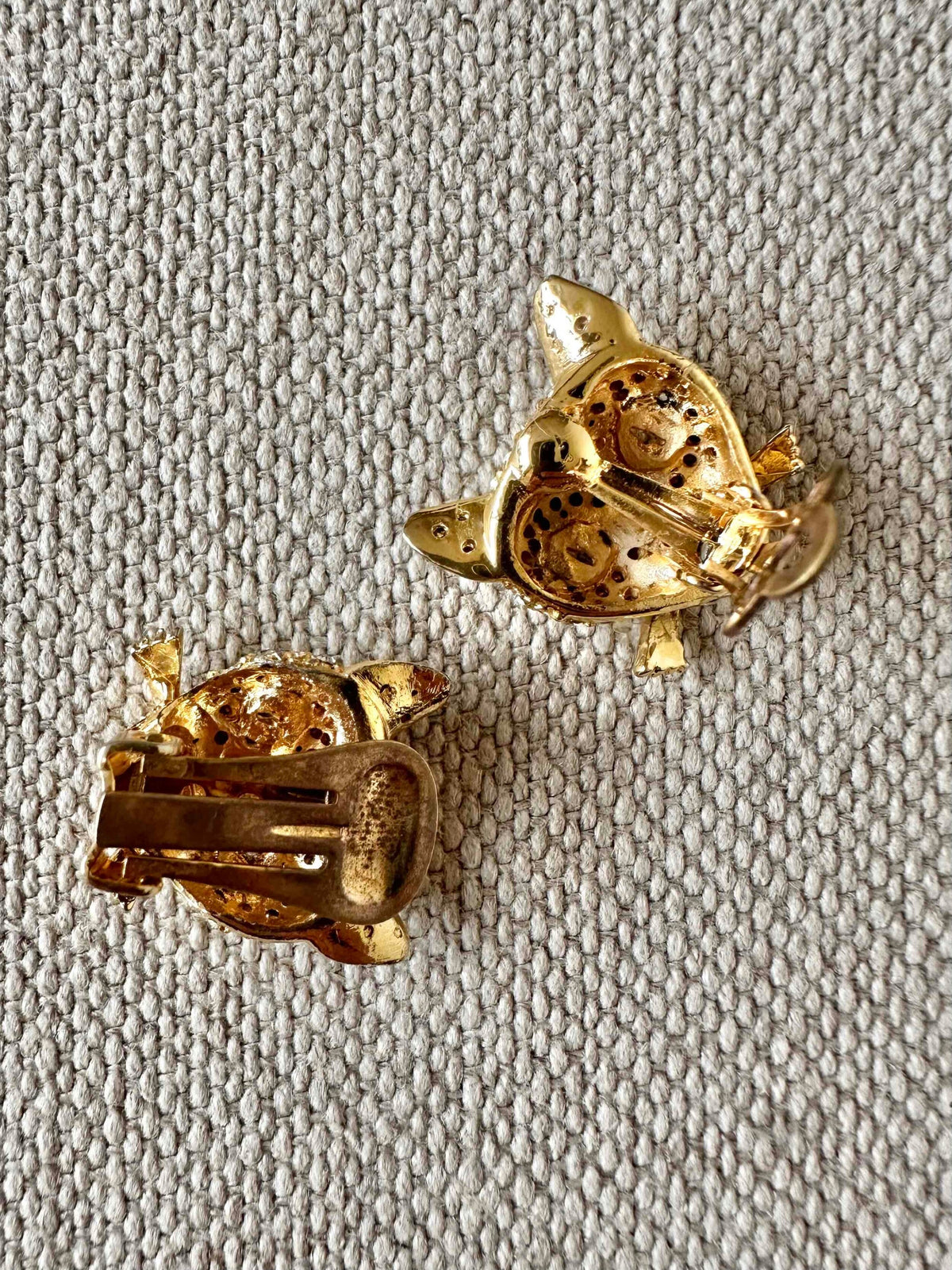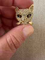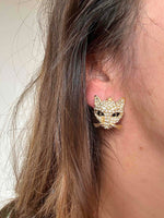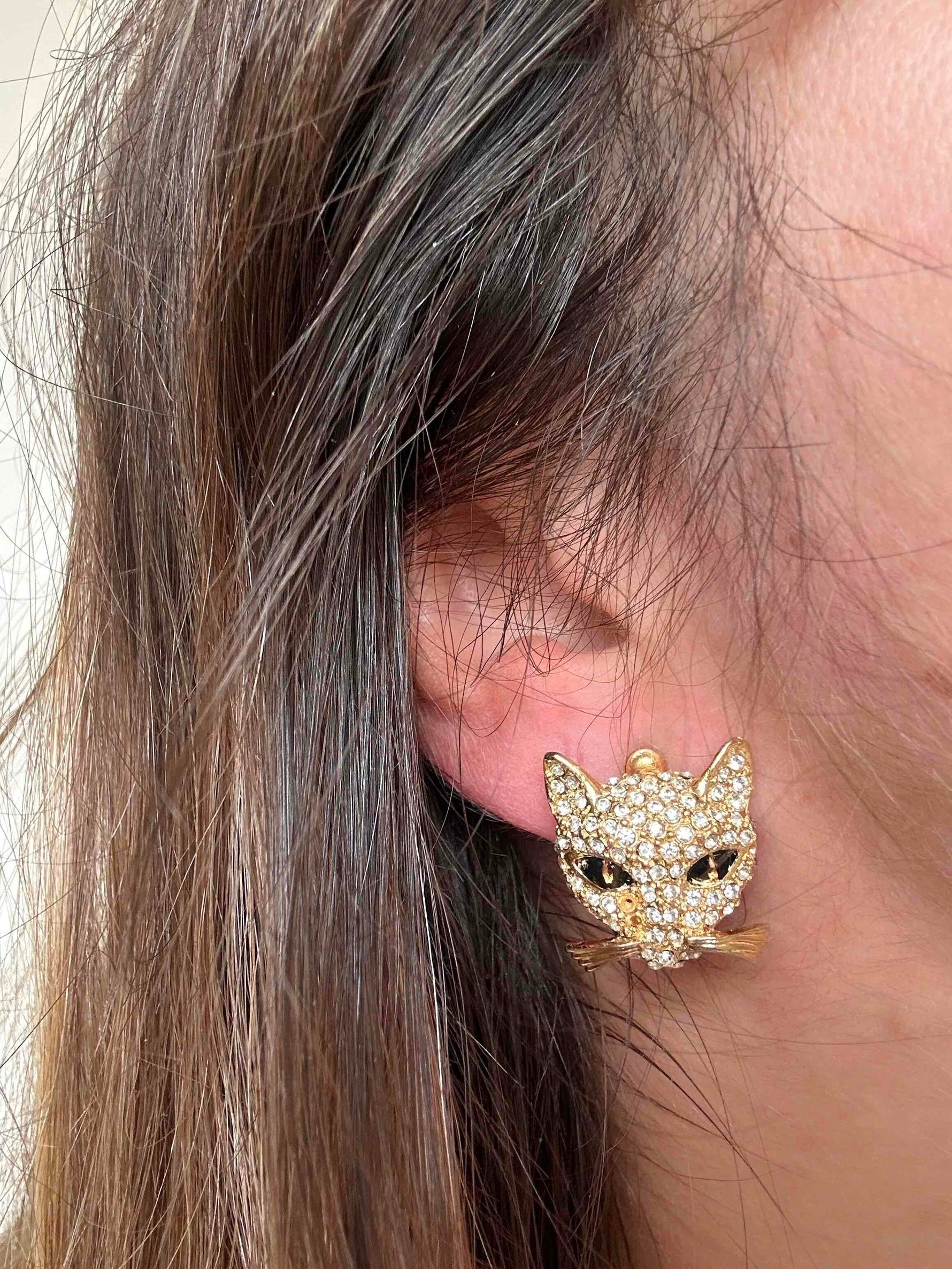 Prix unitaire parBoucles d’oreilles clips chats, en métal doré et têtes de chats entièrement incrustées de strass, yeux en émaille noire, années 80s.