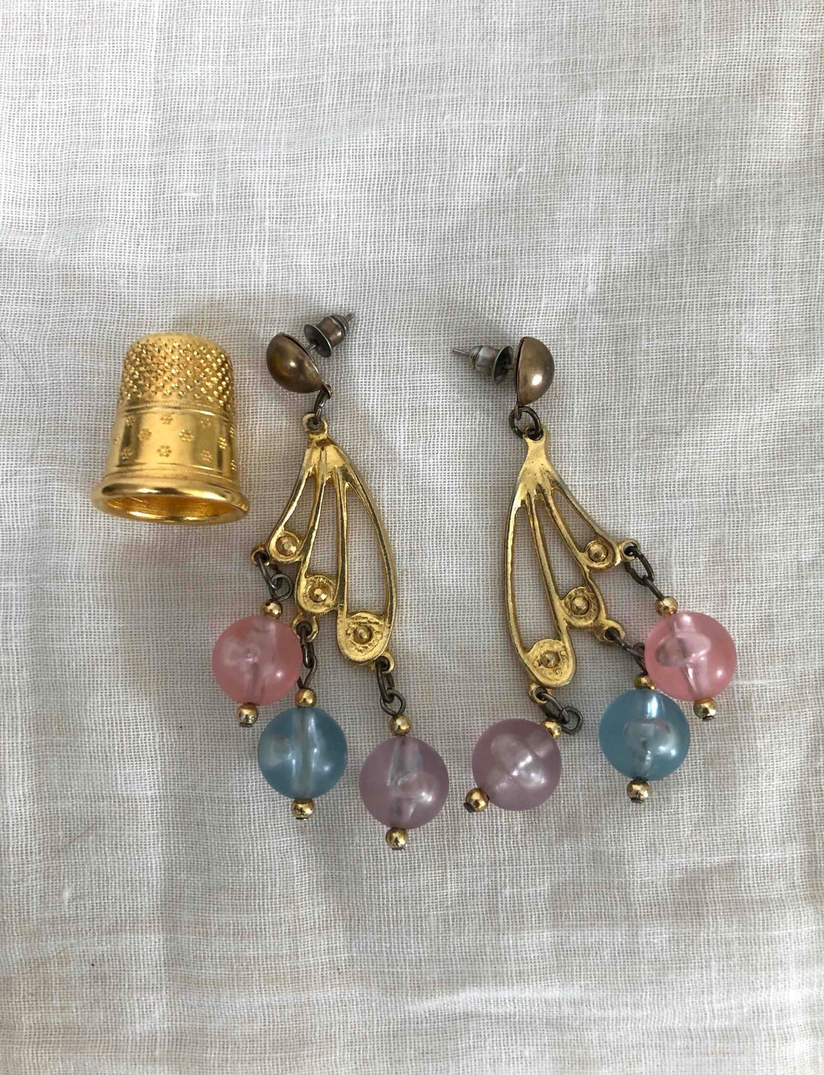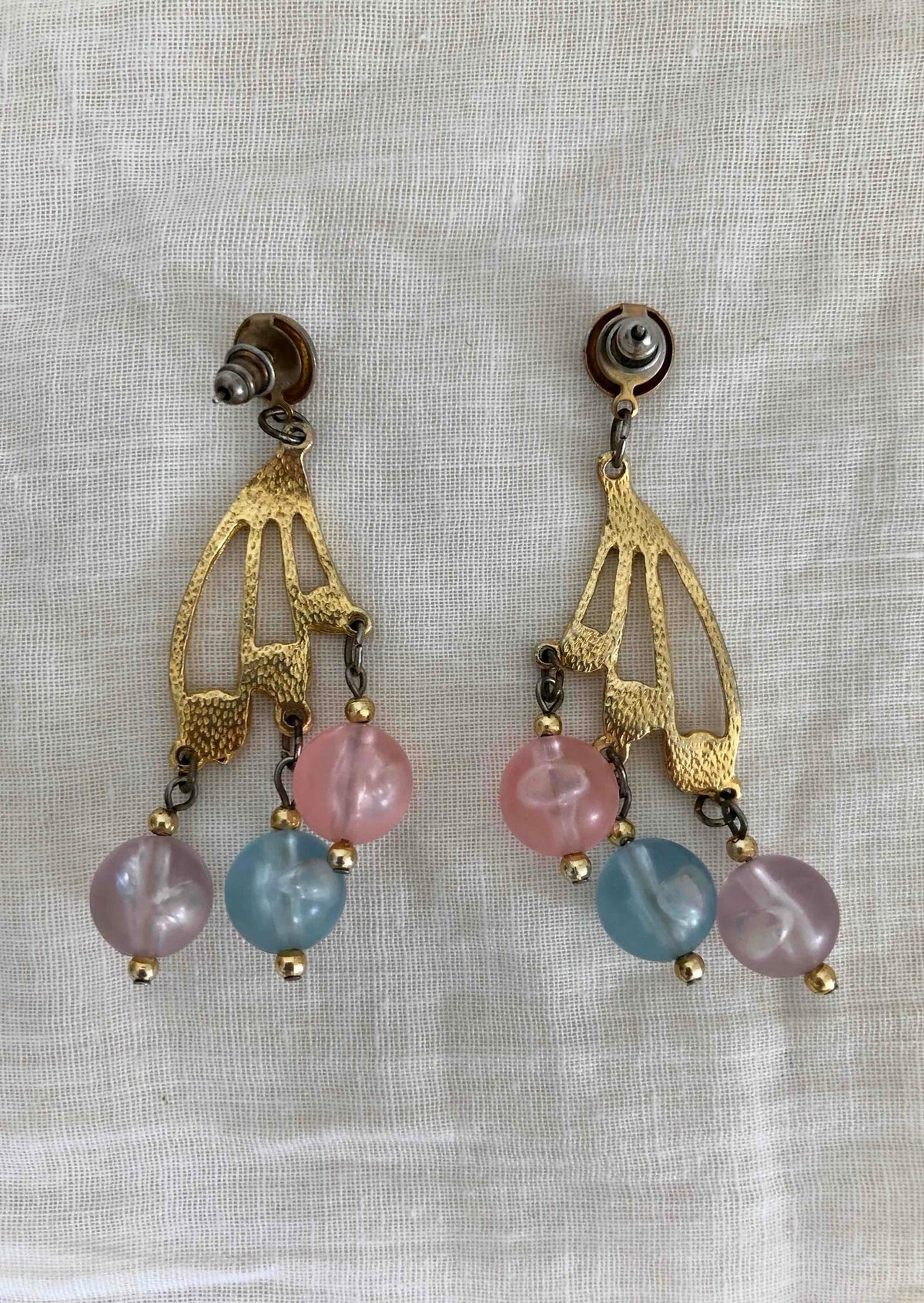 Prix unitaire parBoucles d’oreilles pastels. En métal doré avec perles fantaisies roses, lilas et bleues.