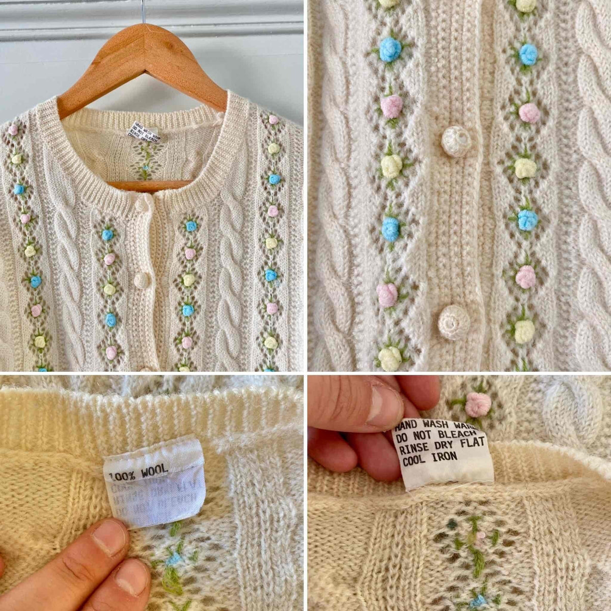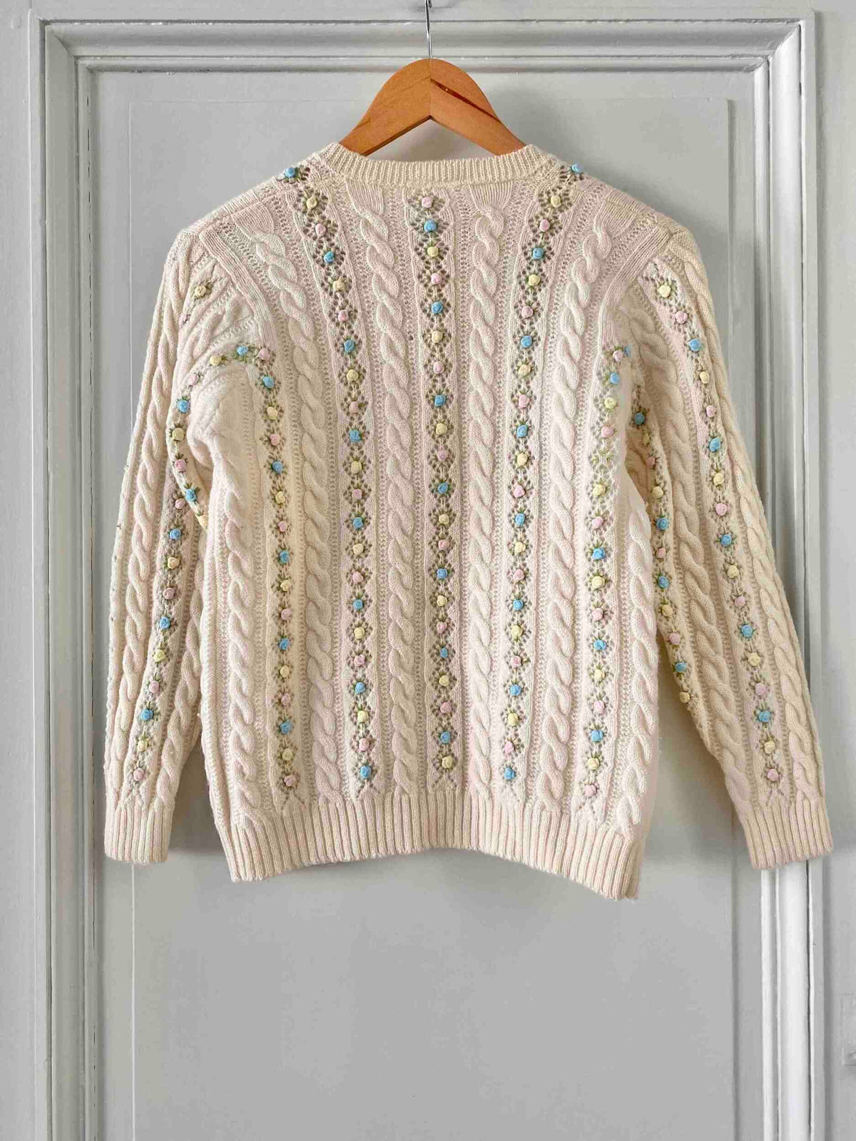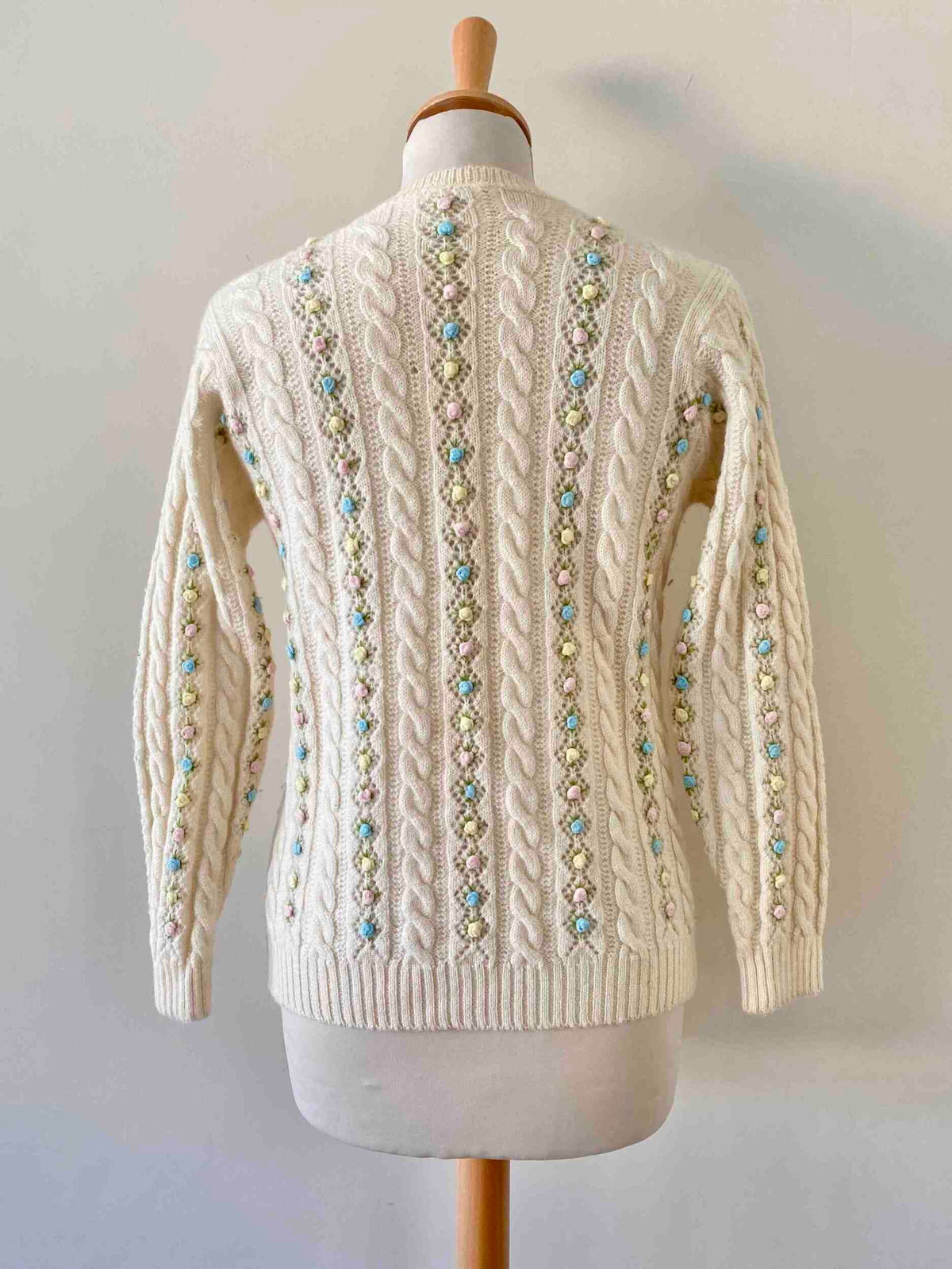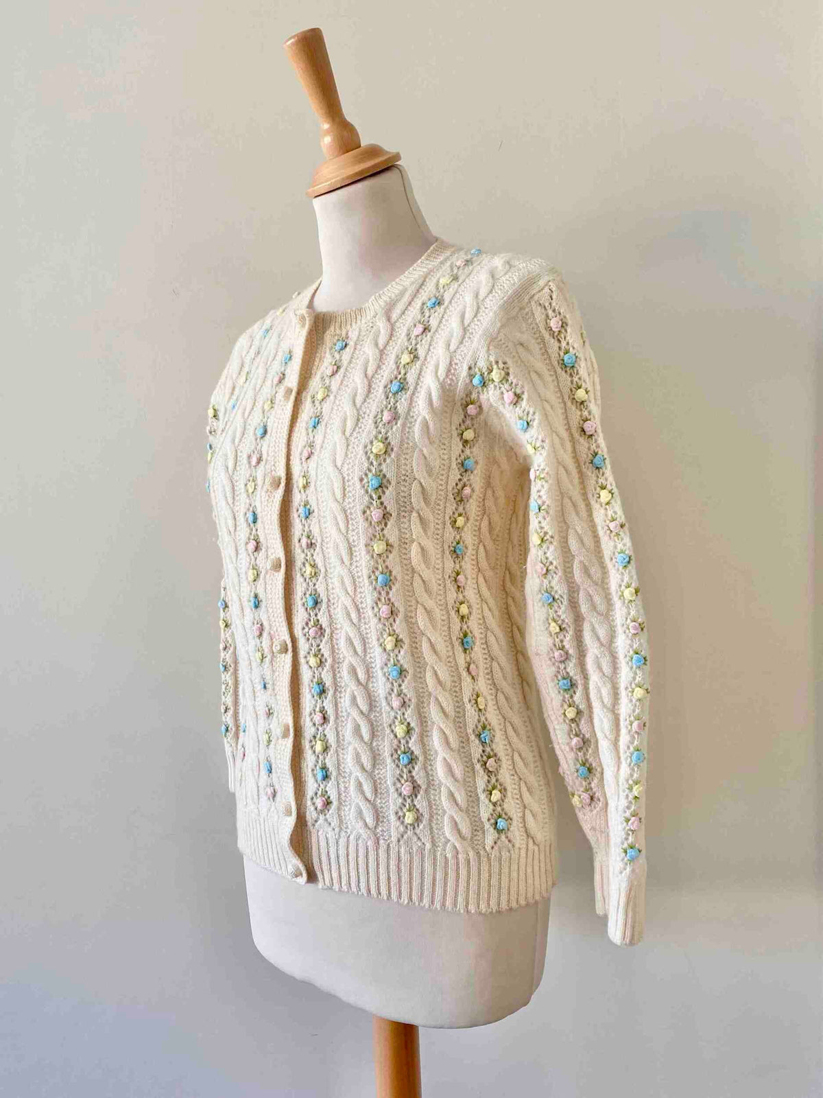Prix unitaire parCardigan Autrichien en pure laine écrue entièrement brodé de fleurs pastels bleues, jaunes, roses et vertes, boutons boules au crochet, forme boîte.