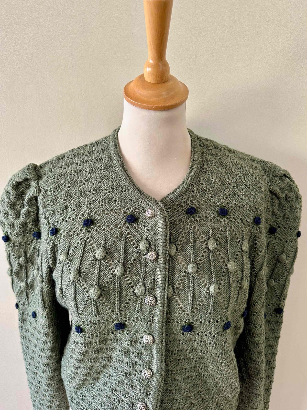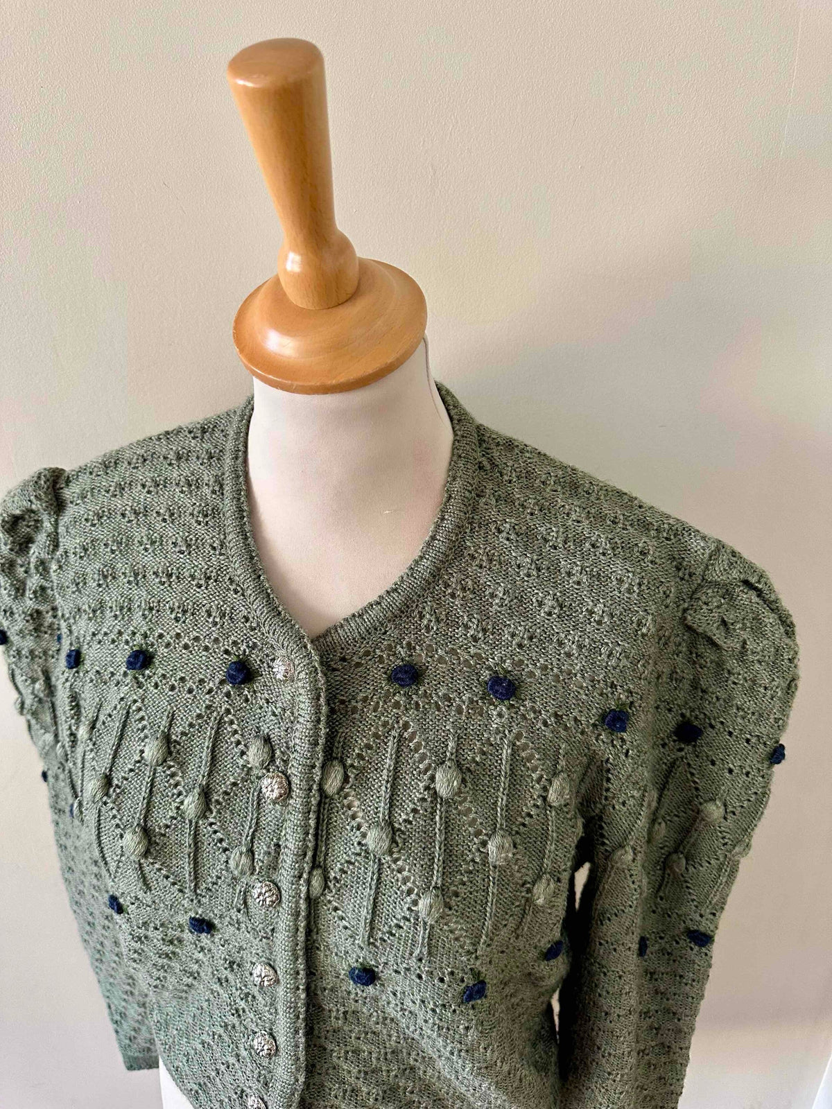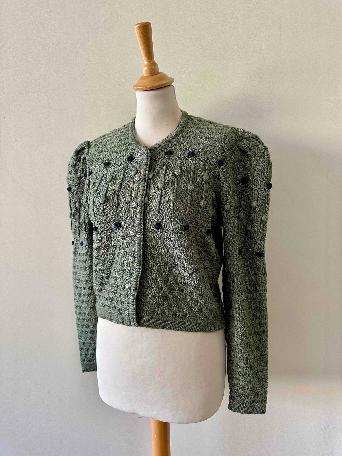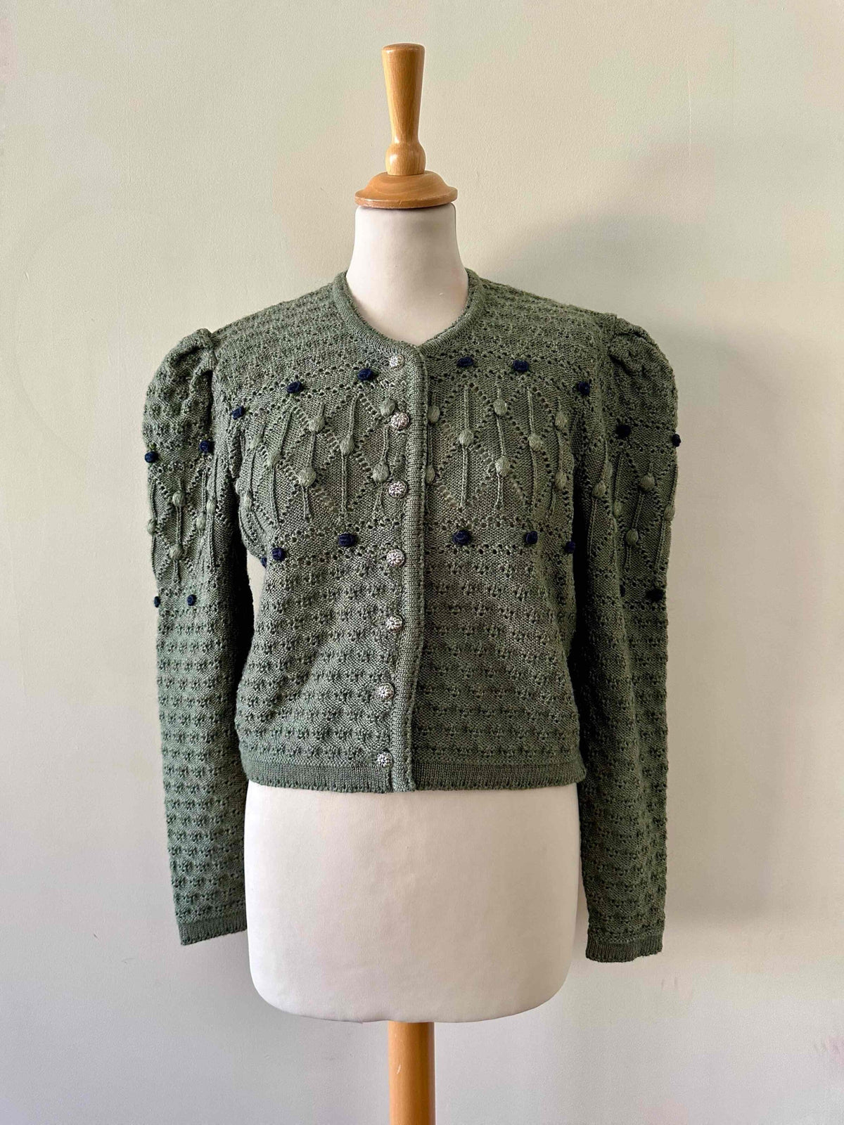 Prix unitaire parCardigan autrichien, en laine mélangée vert tilleul, brodé de fleurs bleue marines et vertes, maille popcorn pompons et nid d’abeille, manches ballons gigots, boutons bijoux argentés, fabriqué en Autriche, convient aux tailles 36 et 38 porté ici sur un mannequin T36.