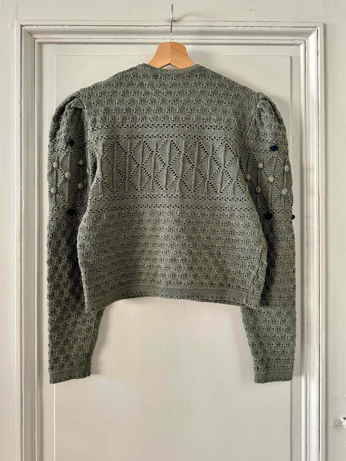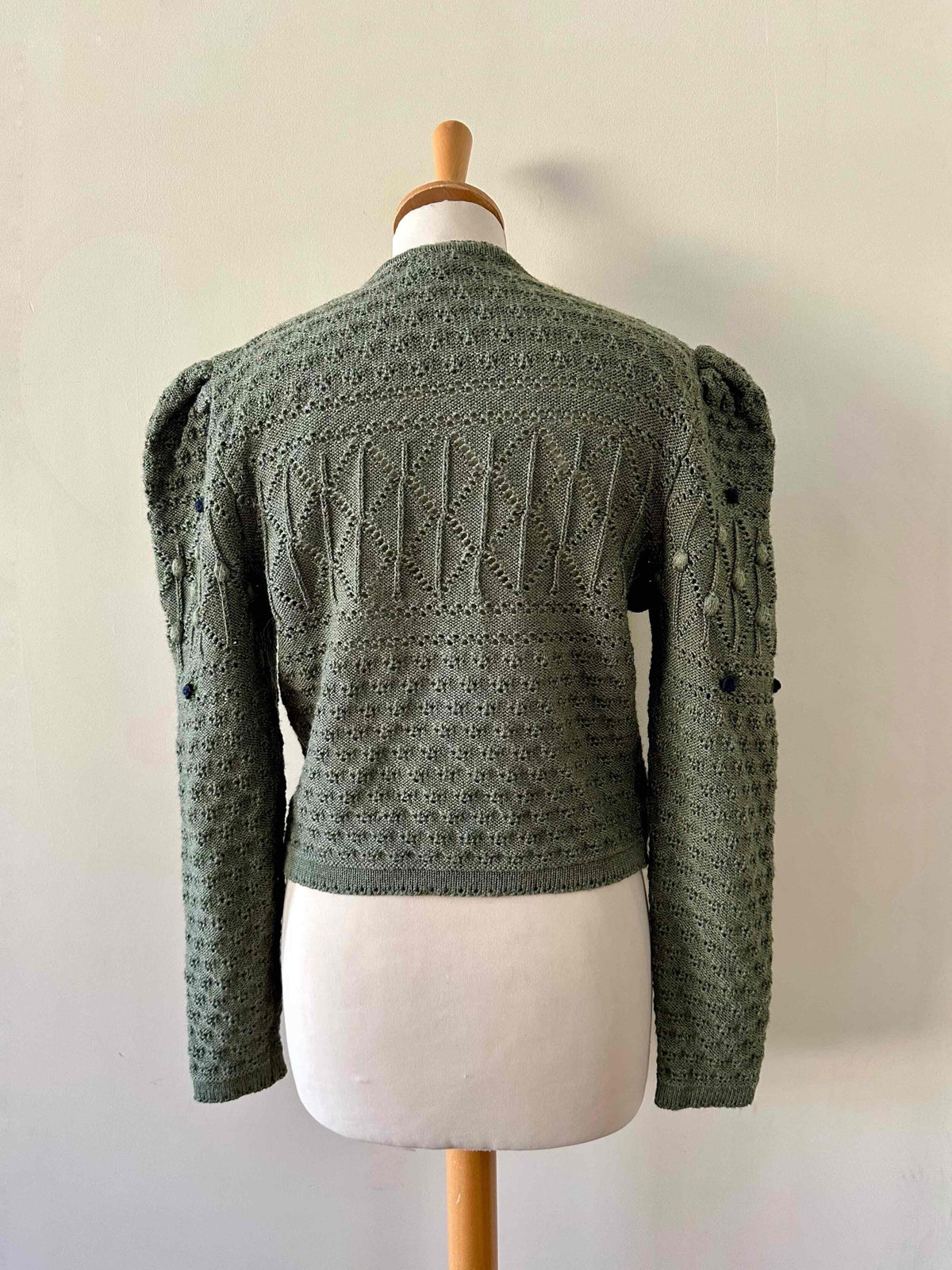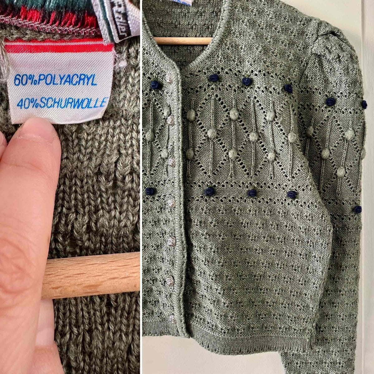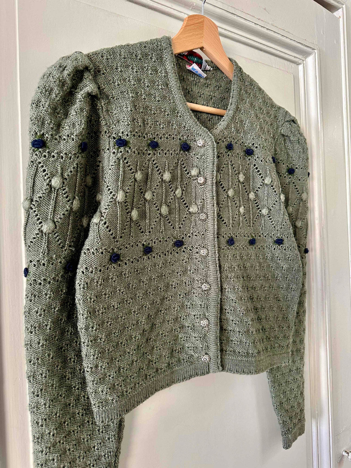 Prix unitaire parCardigan autrichien, en laine mélangée vert tilleul, brodé de fleurs bleue marines et vertes, maille popcorn pompons et nid d’abeille, manches ballons gigots, boutons bijoux argentés, fabriqué en Autriche, convient aux tailles 36 et 38 porté ici sur un mannequin T36.