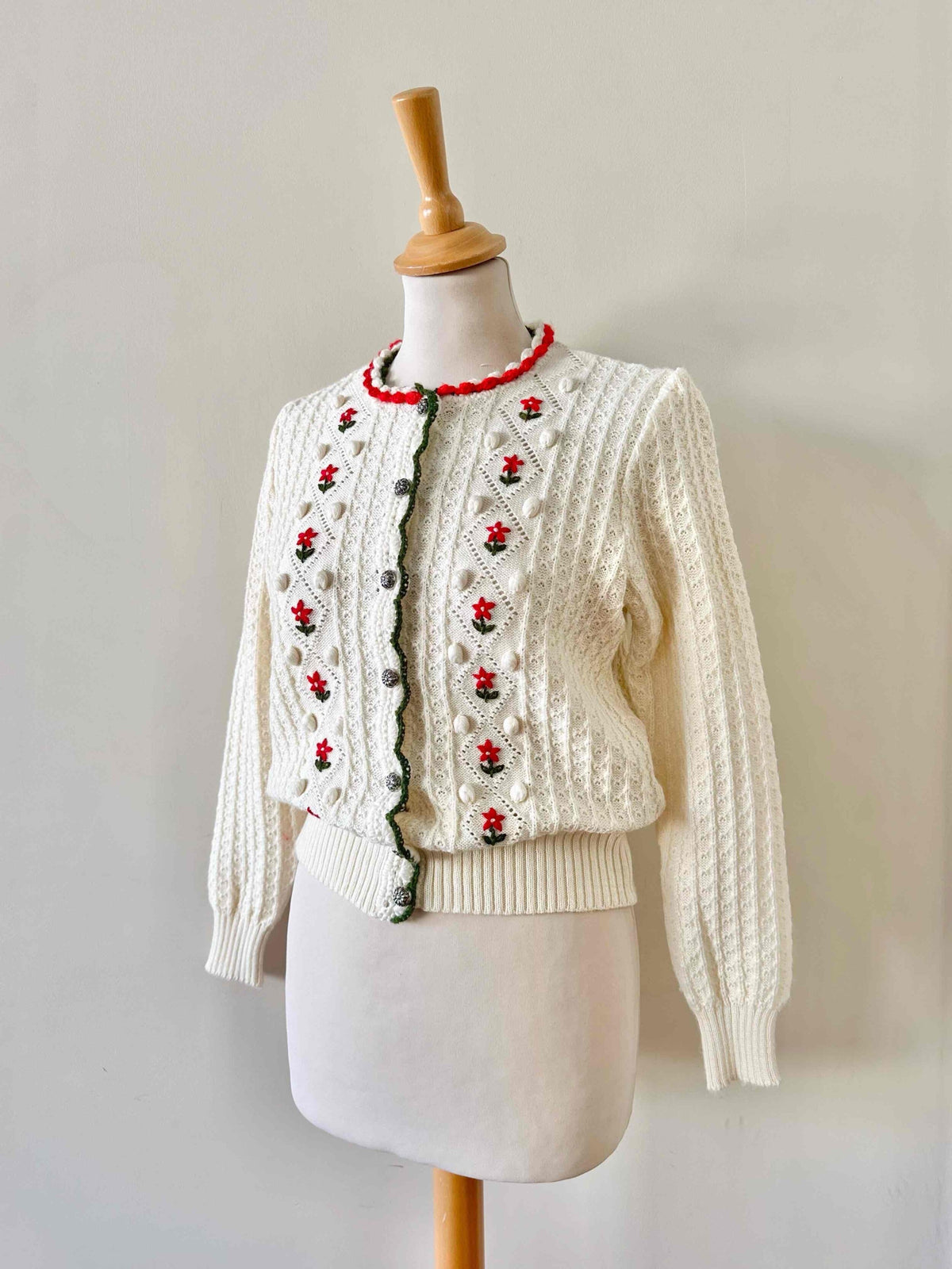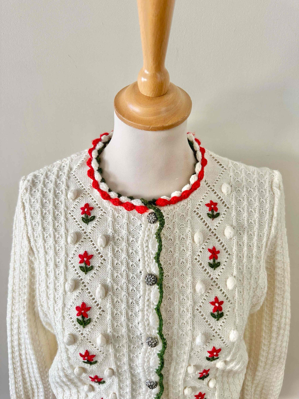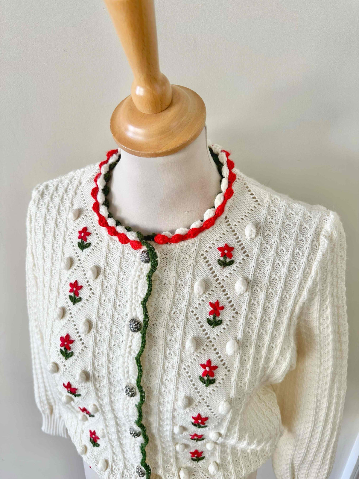 Prix unitaire parCardigan autrichien, en laine mélangée blanche maille pompons, et fleurs brodées rouges et vertes, boutons bijoux argentés, fabriqué en Autriche, taille 36 porté ici sur un mannequin T36.