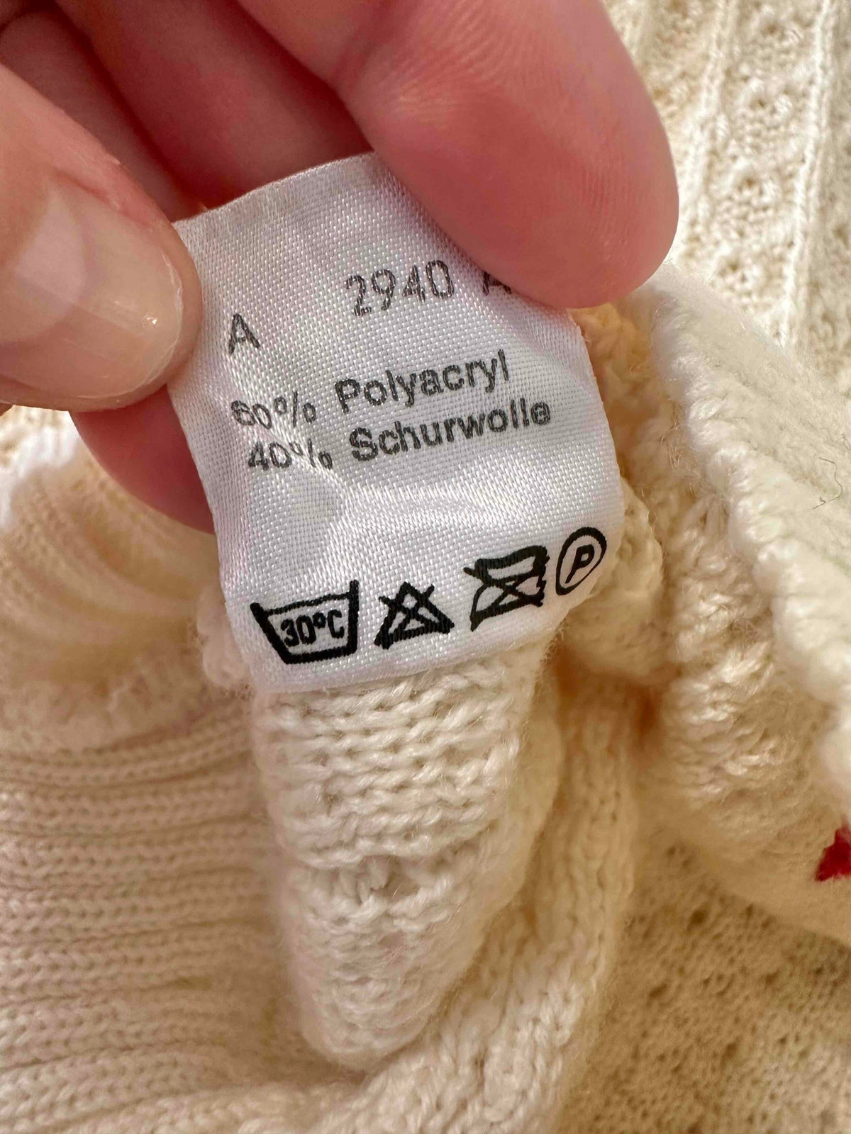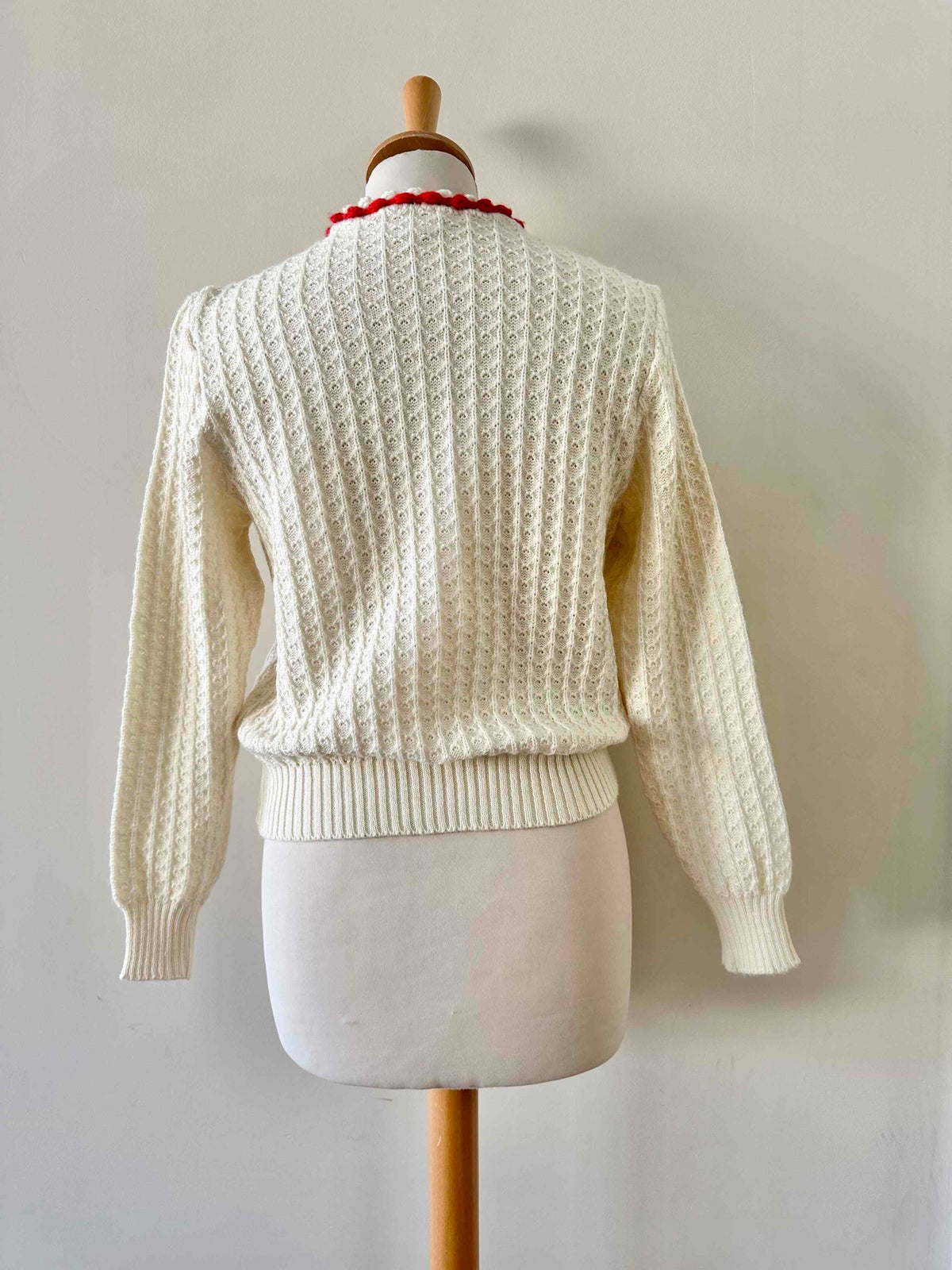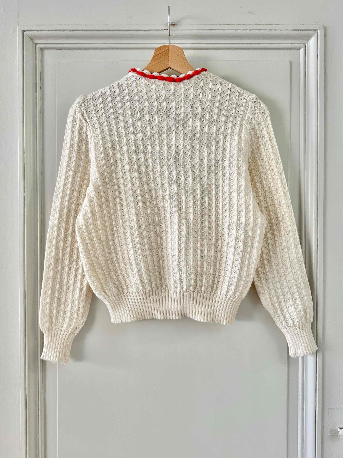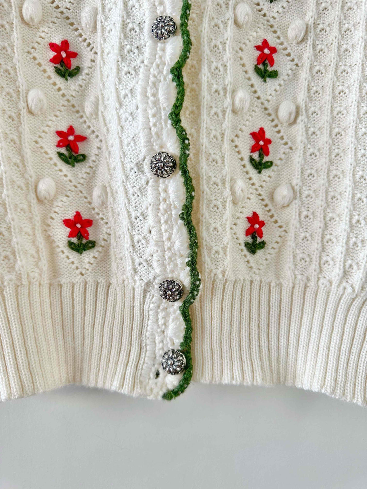 Prix unitaire parCardigan autrichien, en laine mélangée blanche maille pompons, et fleurs brodées rouges et vertes, boutons bijoux argentés, fabriqué en Autriche, taille 36 porté ici sur un mannequin T36.