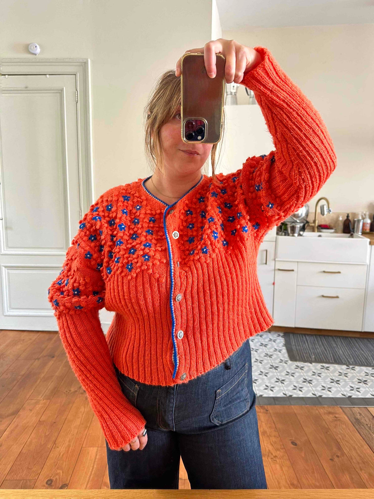 Prix unitaire parCardigan autrichien, en laine mélangée orange tangerine, maille popcorn brodée de fleurs bleues électrique et blanches, boutons bijoux argentes fleuris, manches ballons et poignets longs à revers, tricoté mains, années 70s, convient aux tailles 38,40 et 42 porté ici sur une personne T40.