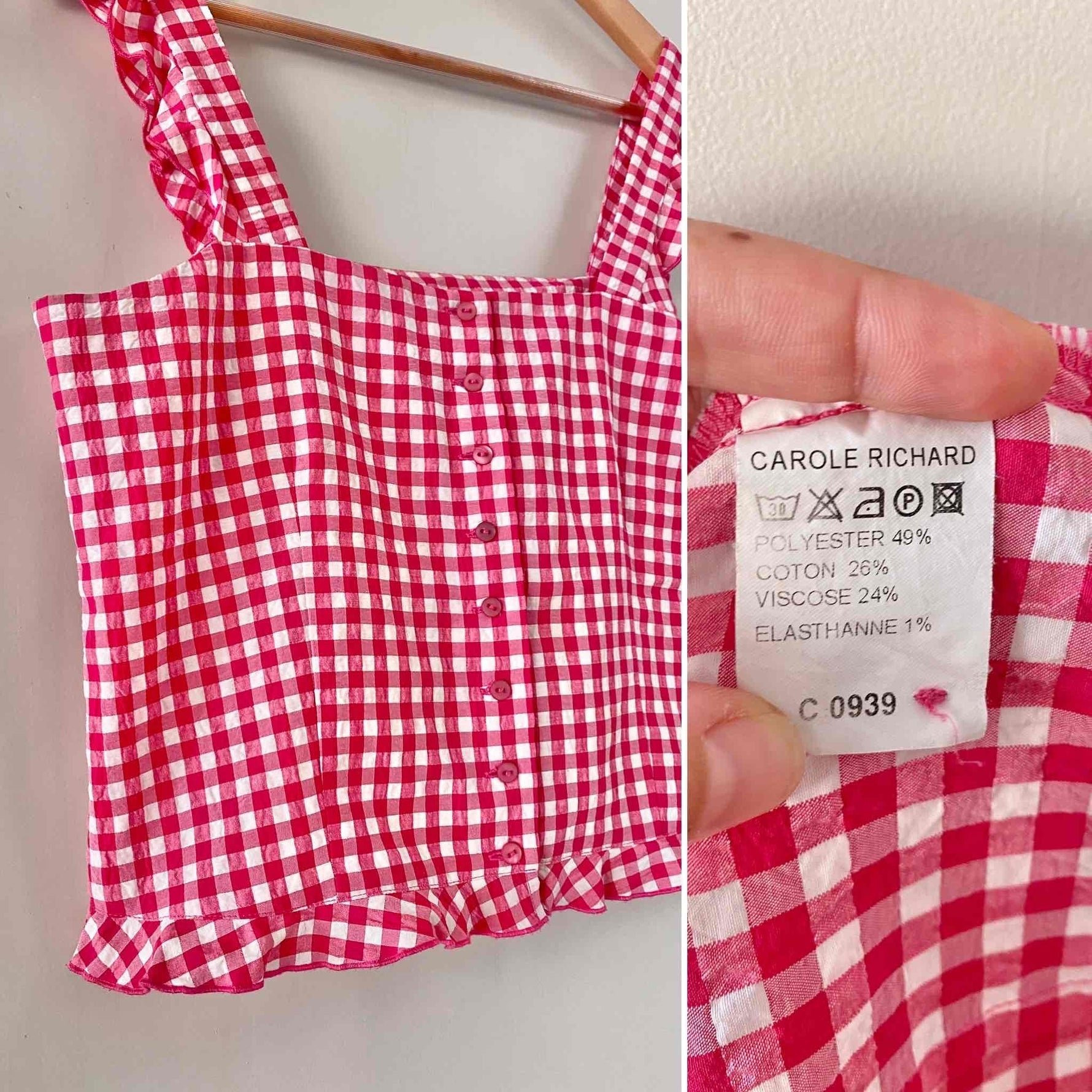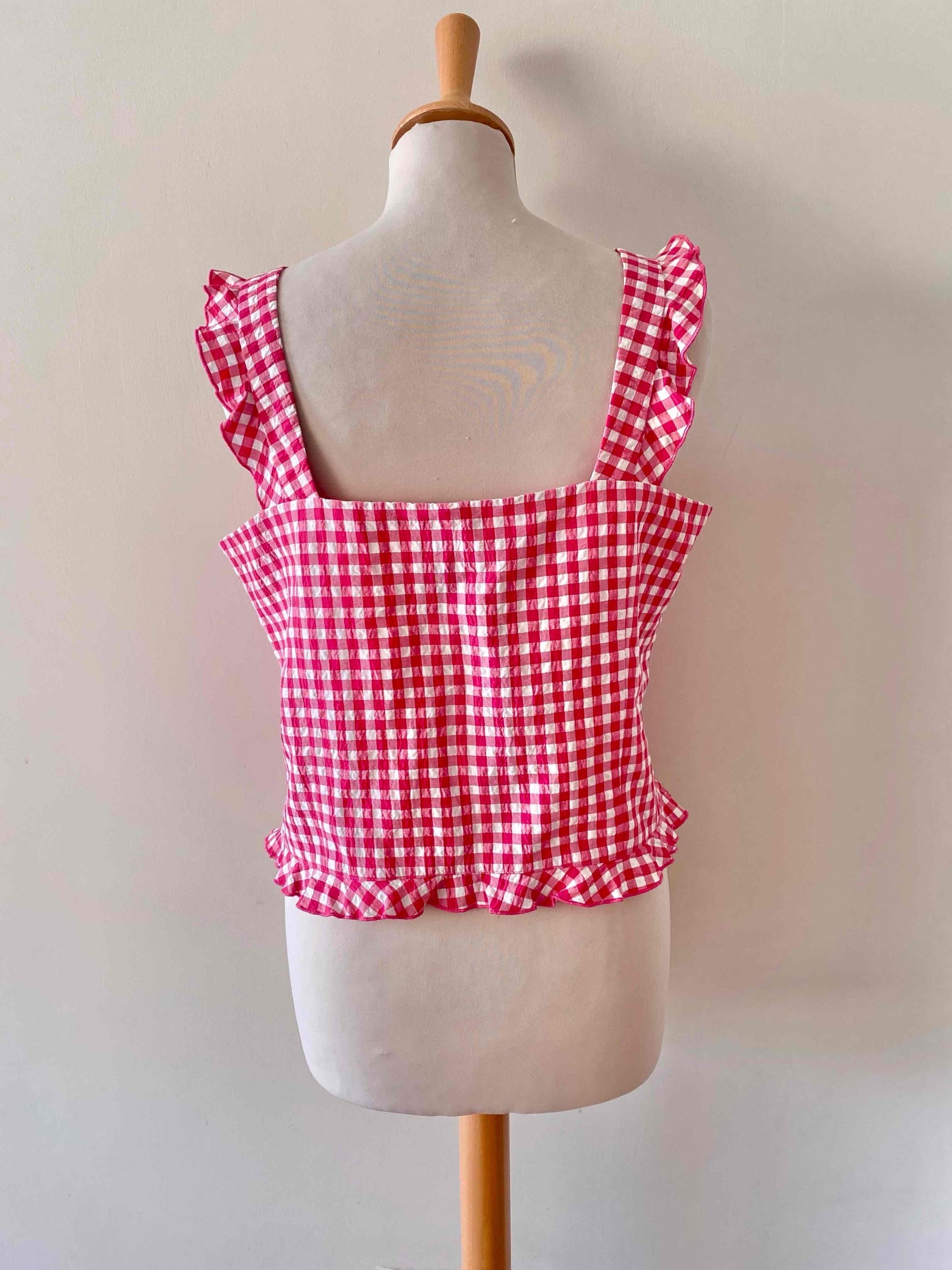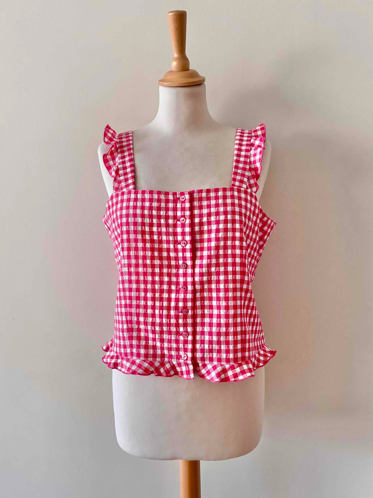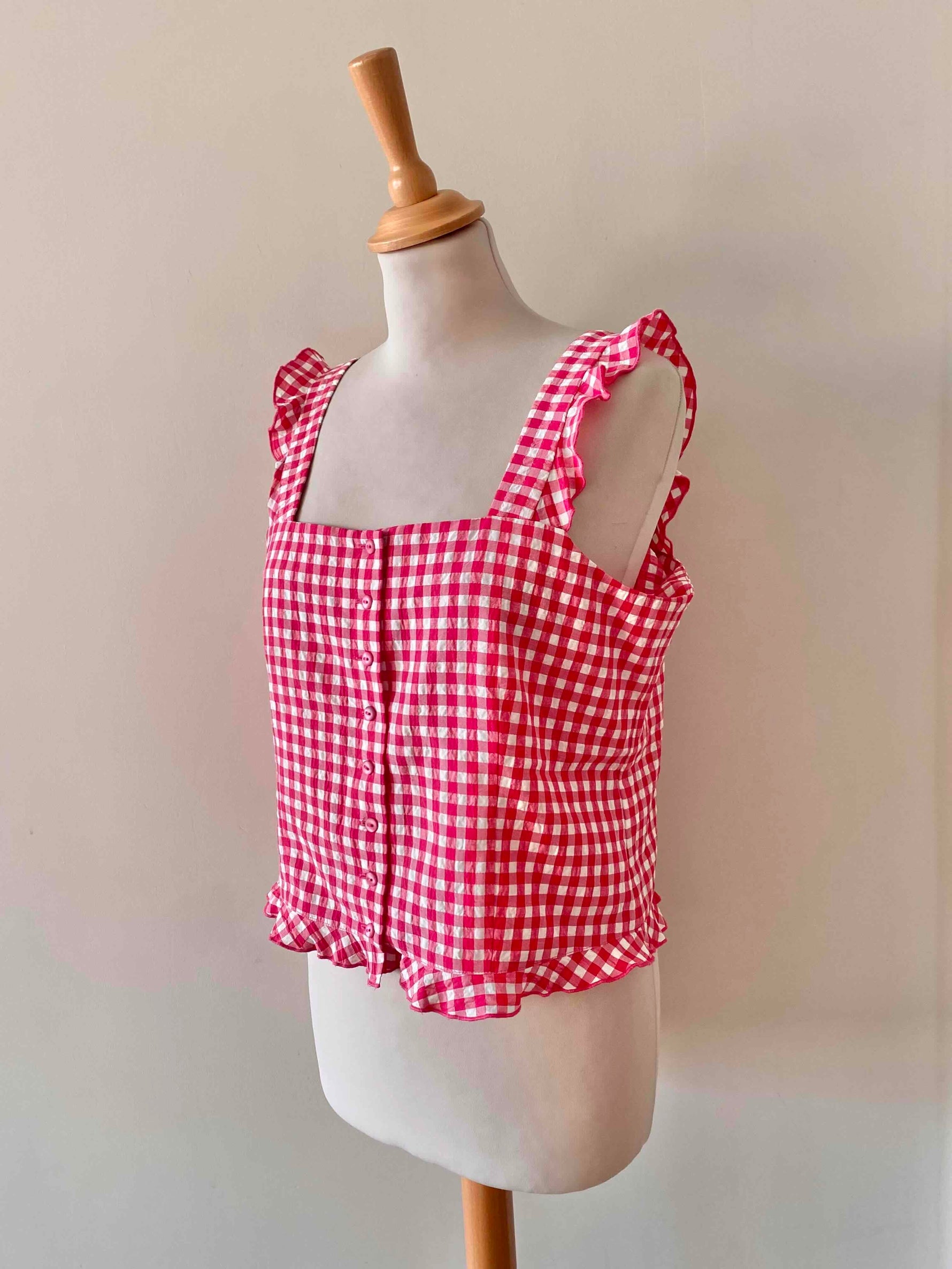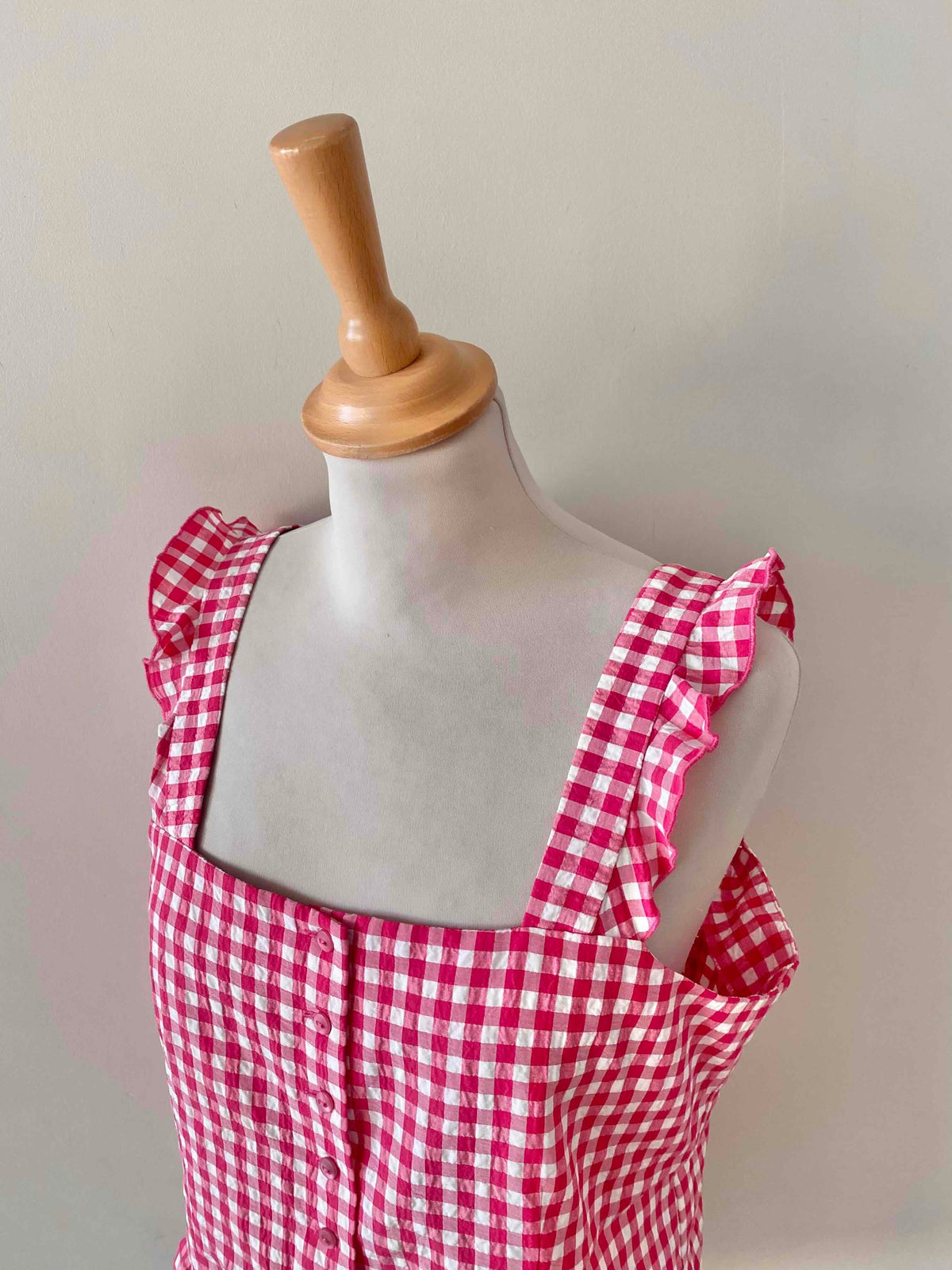 Prix unitaire parCrop top vichy, en searsucker coton effet gaufré à carreaux vichy blancs et roses fuschias, boutonné devant, encolure carrée corsage, bretelles et bas volantés, fabriqué en France, taille 38 porté ici sur un mannequin T36.