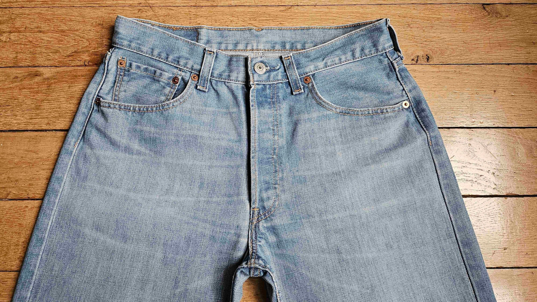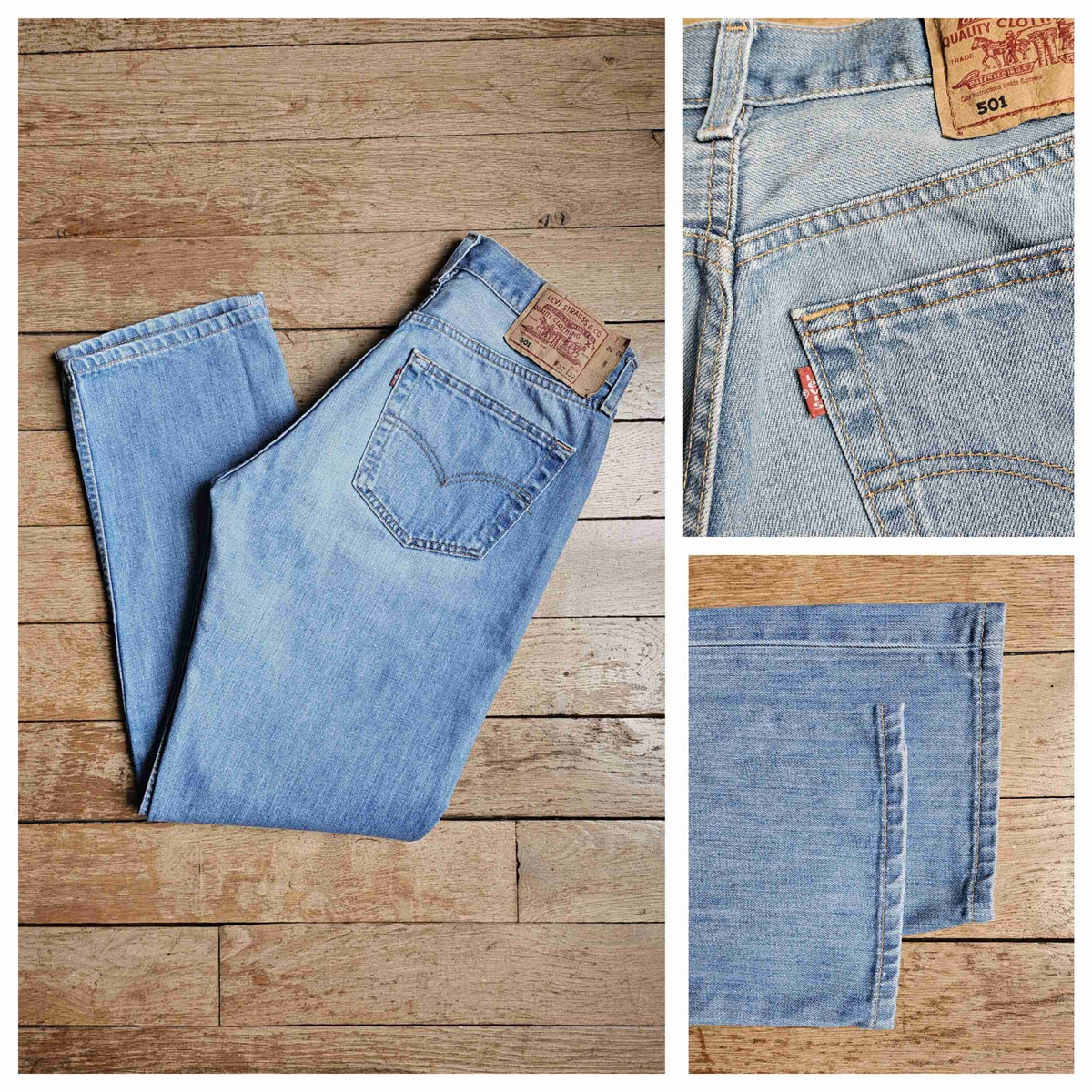 Prix unitaire parJean Levi's 501 W32 L32 bleu clair. Ourlets d'origine. 100 % coton. Longueur extérieur jambe 102 cm. Hauteur fourche 28.5 cm.
