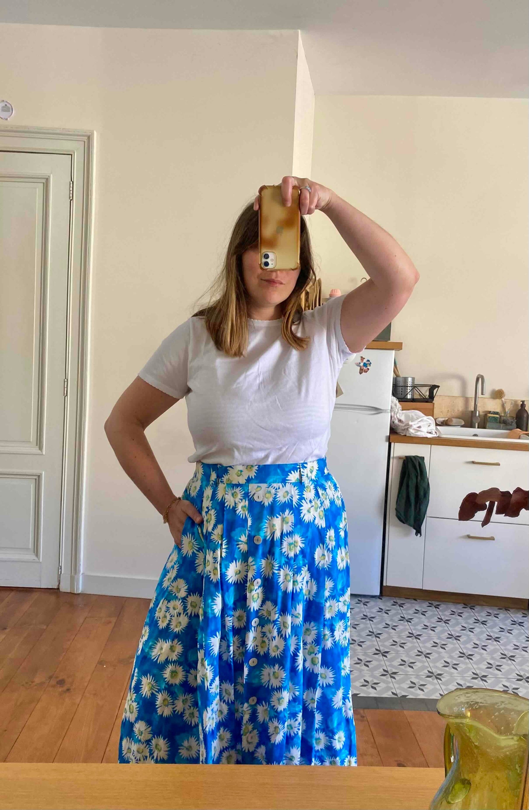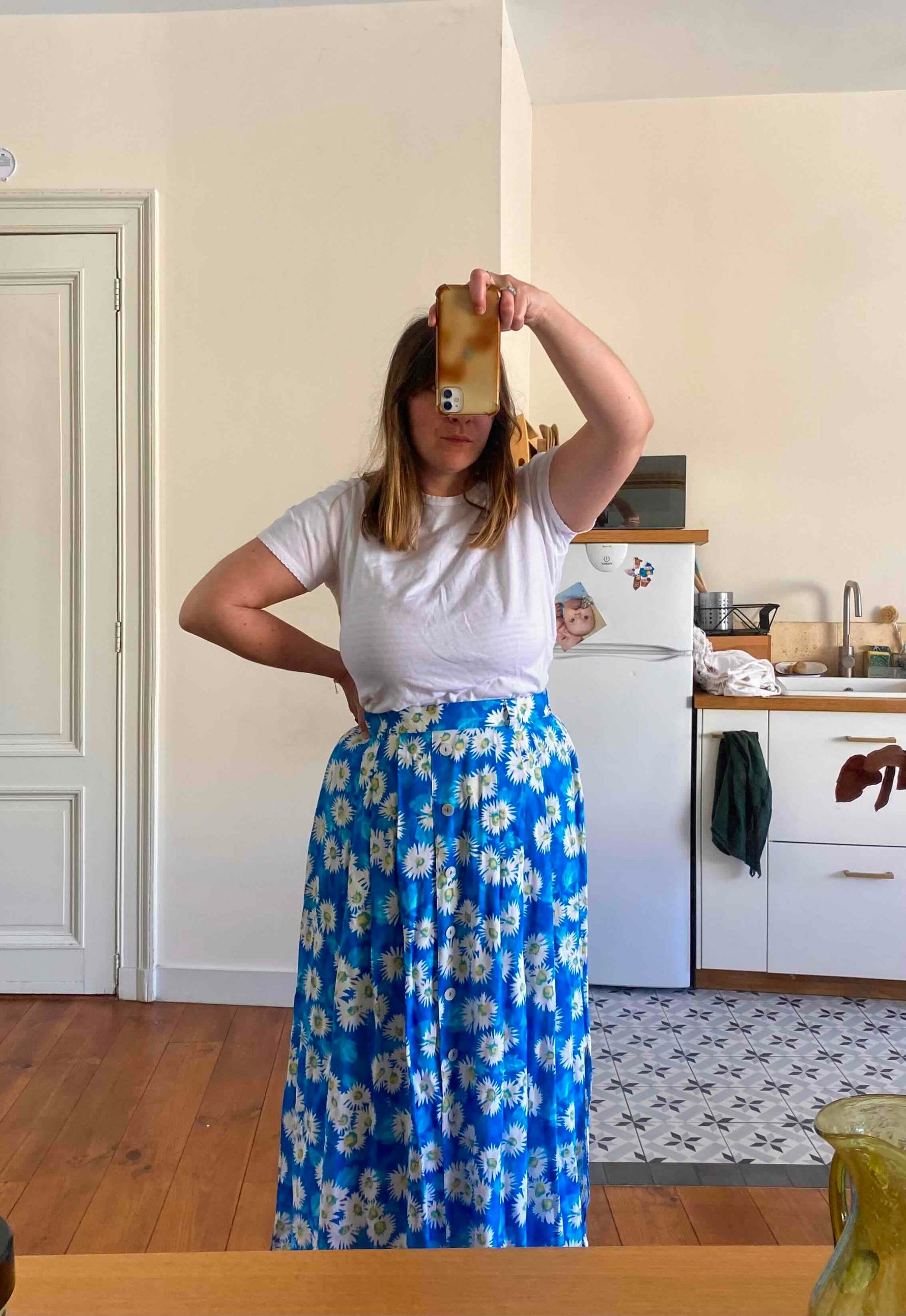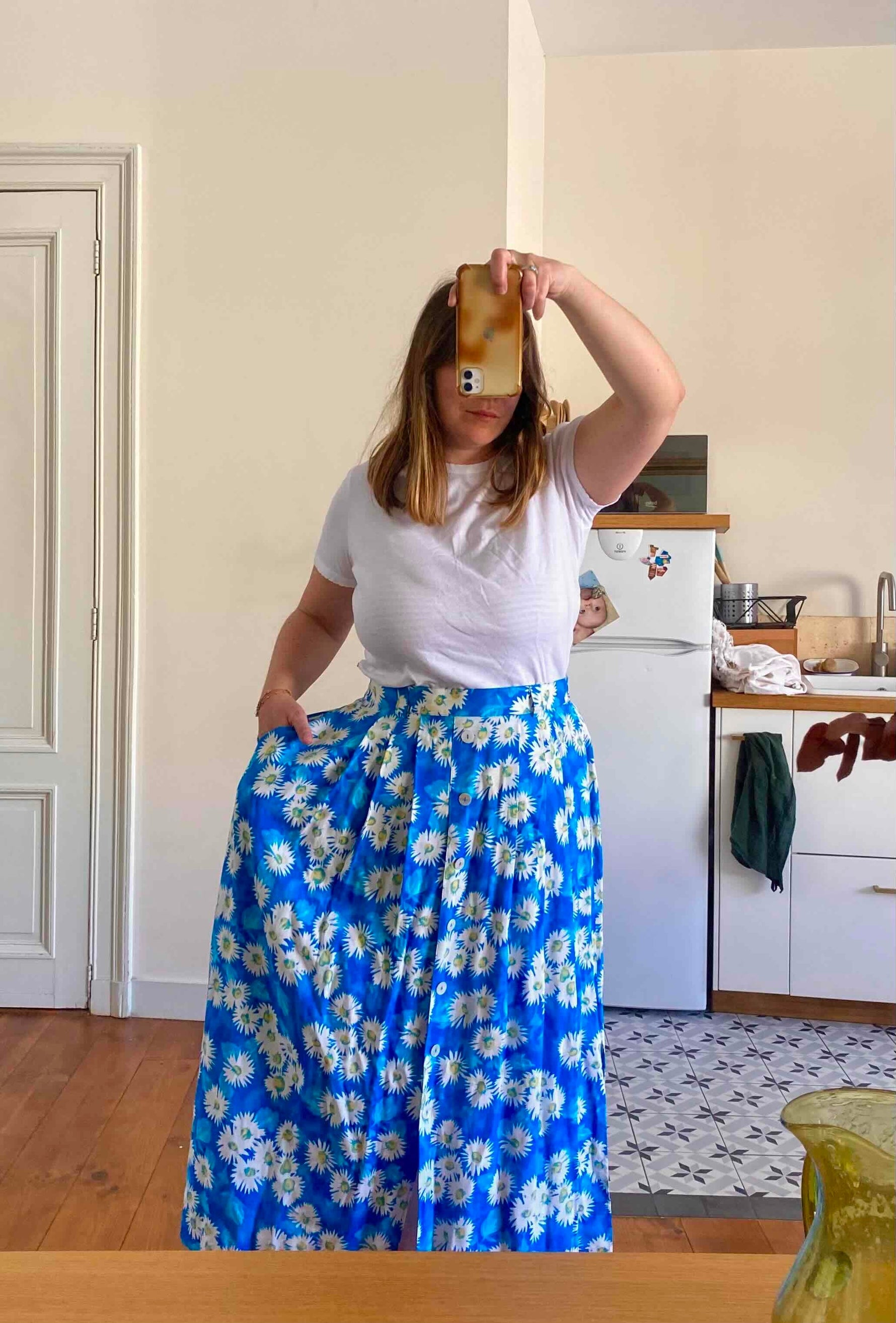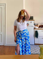 Prix unitaire parJupe longue à fleurs en viscose bleue azur imprimée fleurs de marguerites blanches et vertes, effet boutonné devant, fendue sur les côtés, poches côtés, taille dos légèrement élastique à bouton et fermeture éclaire, taille 40 portée ici sur une personne T40.