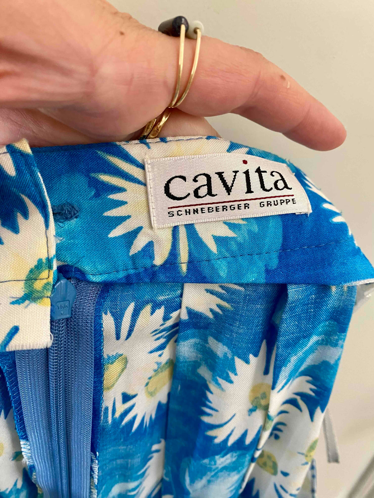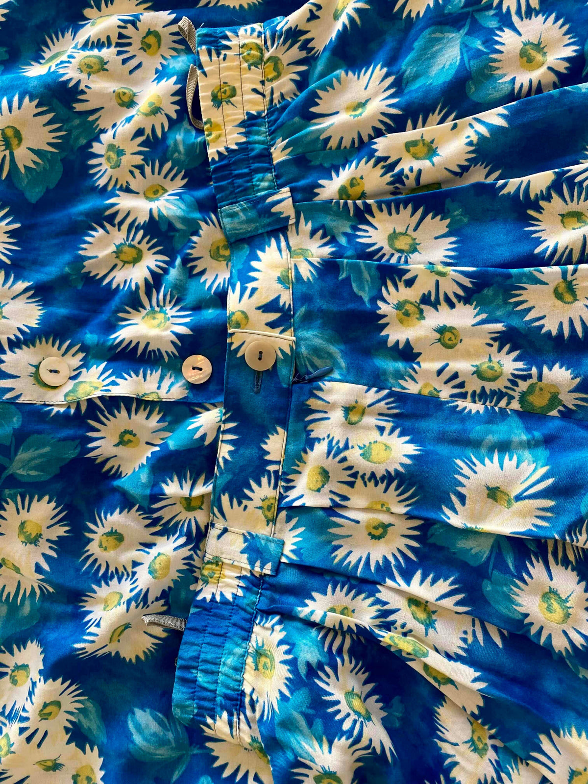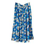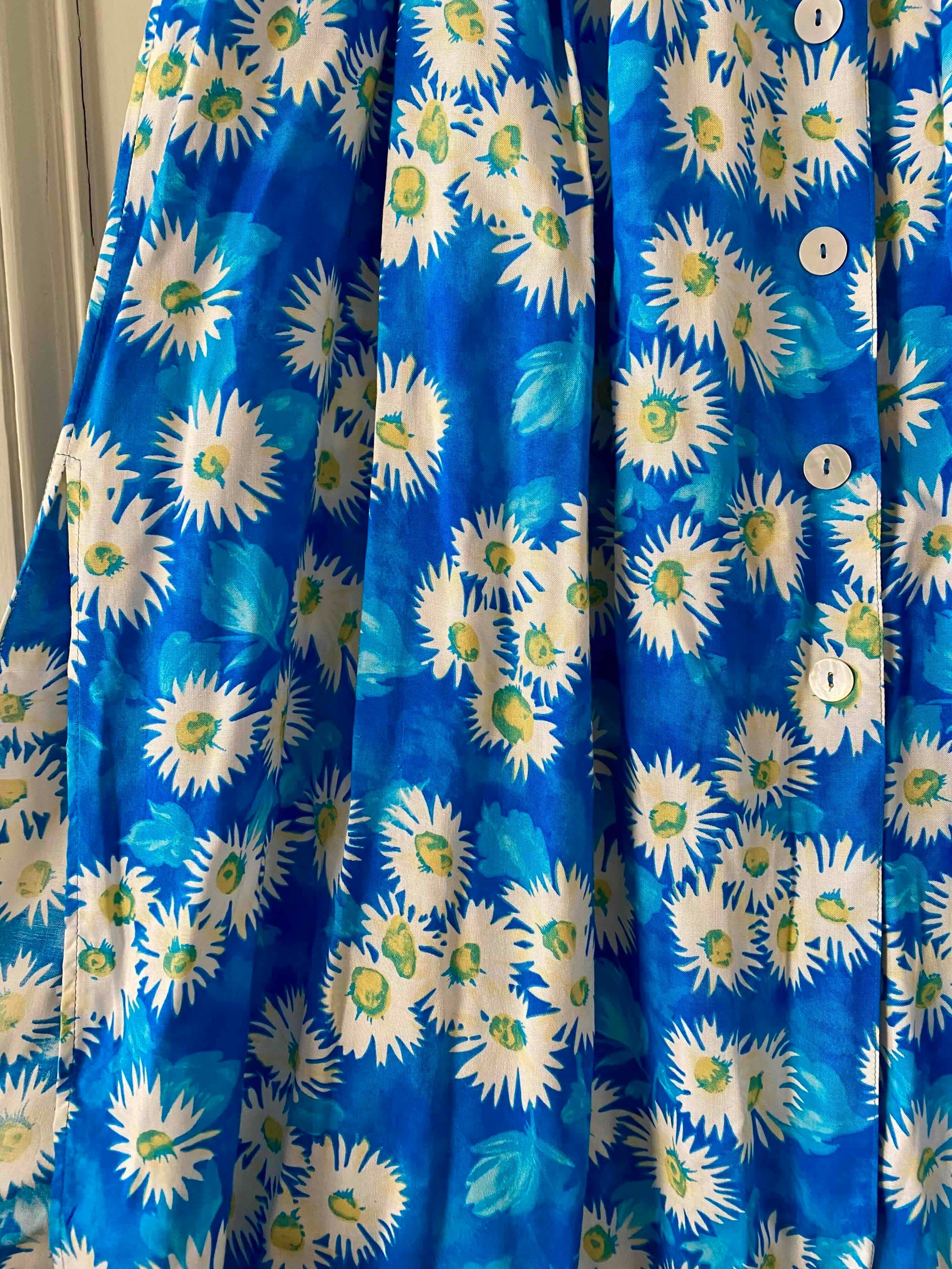 Prix unitaire parJupe longue à fleurs en viscose bleue azur imprimée fleurs de marguerites blanches et vertes, effet boutonné devant, fendue sur les côtés, poches côtés, taille dos légèrement élastique à bouton et fermeture éclaire, taille 40 portée ici sur une personne T40.