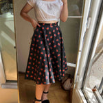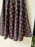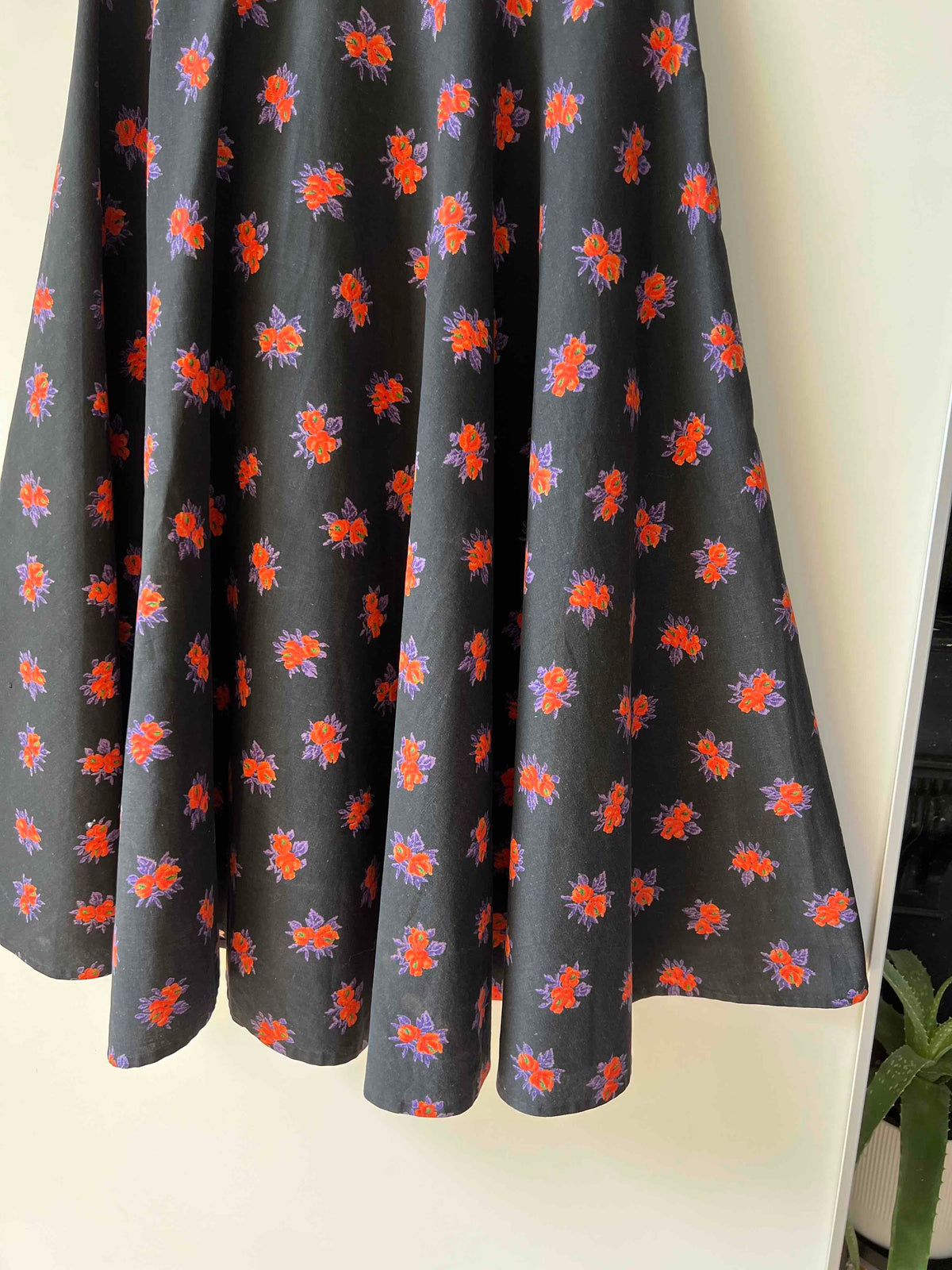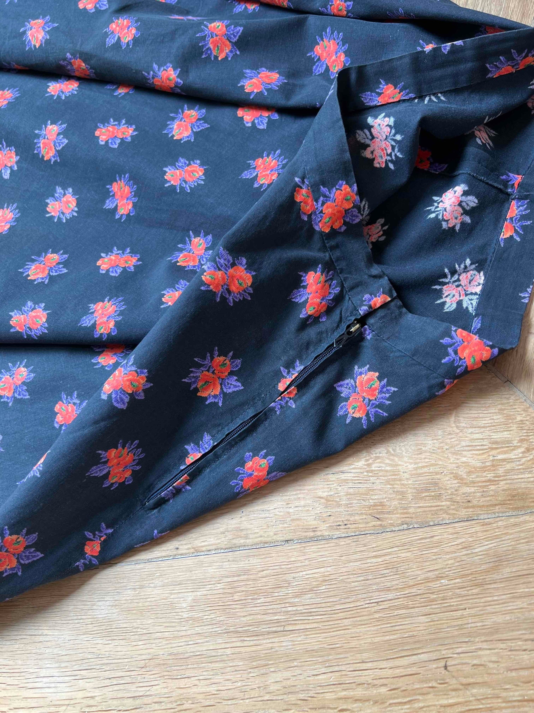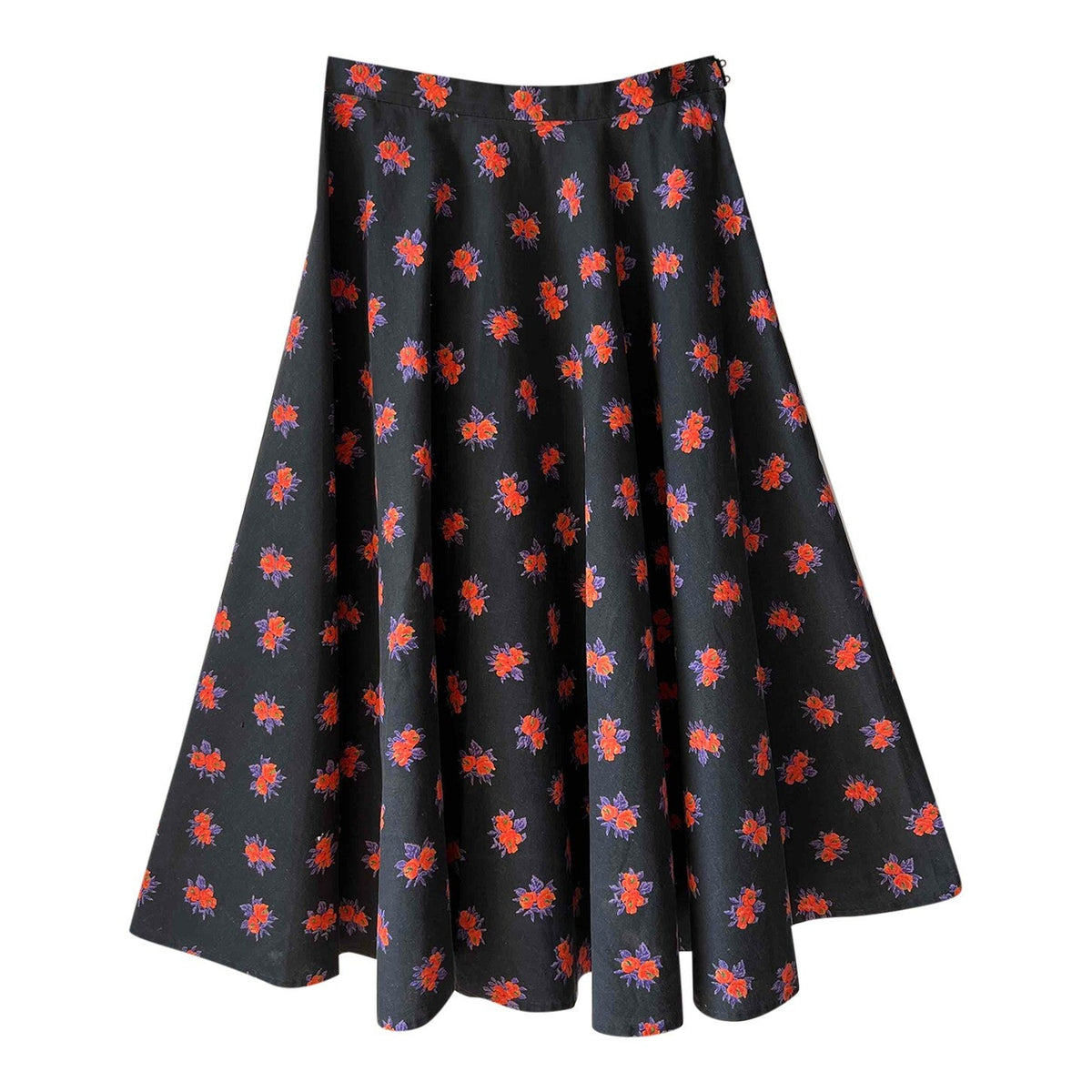 Prix unitaire parJupe midi noire en coton à motifs de fleurs oranges et violettes, création couturière. Années 70. Excellent état. Taille 36/ 38 (avec un petit tour de taille). Belle amplitude de tissu et coton de qualité.