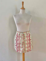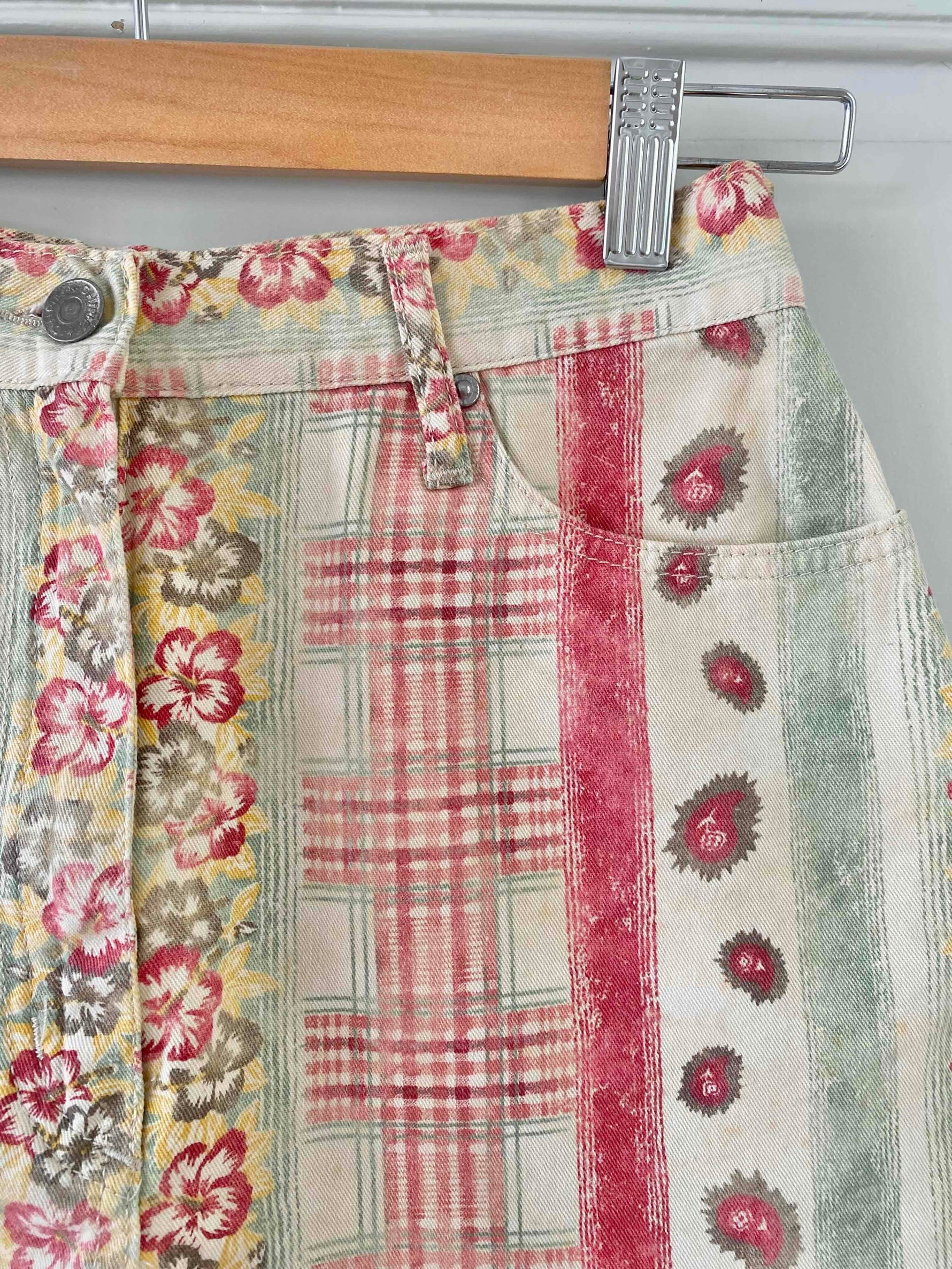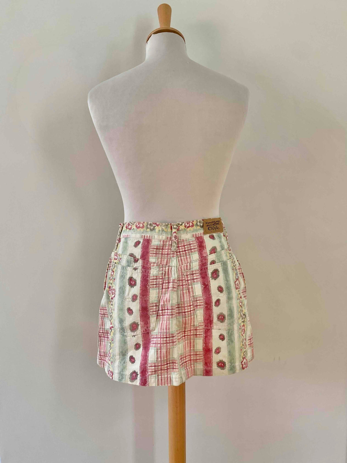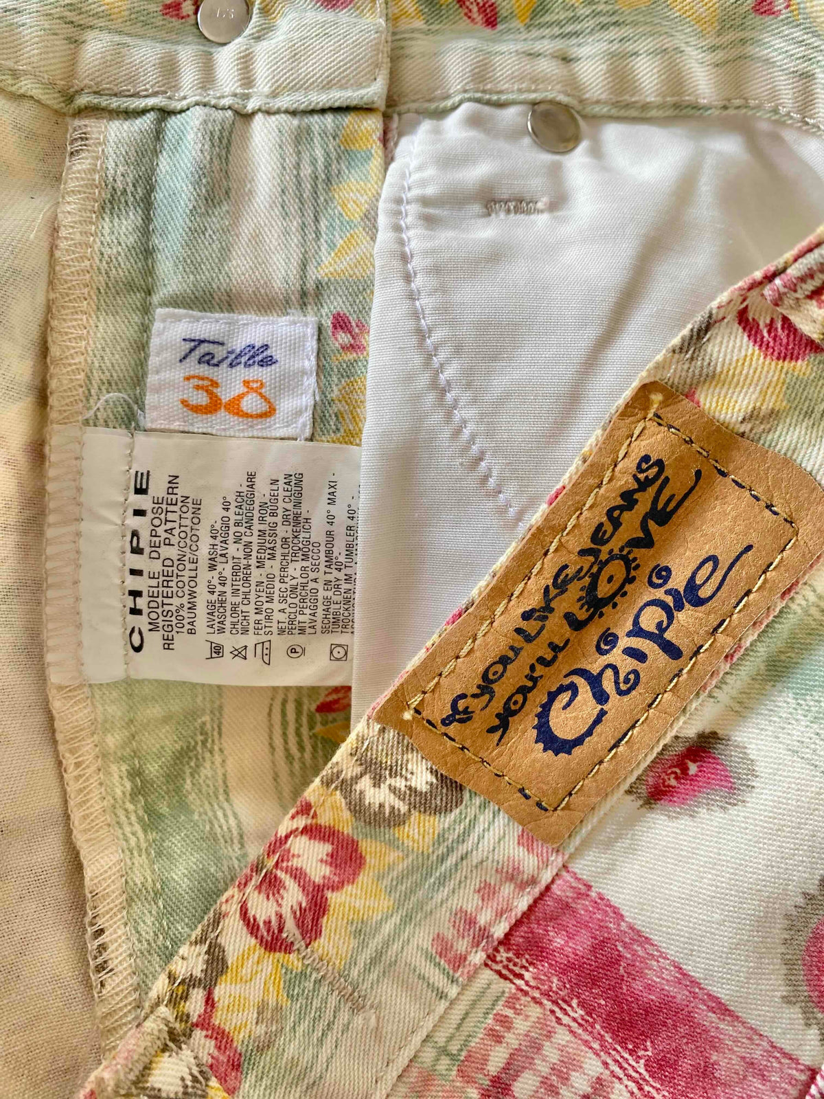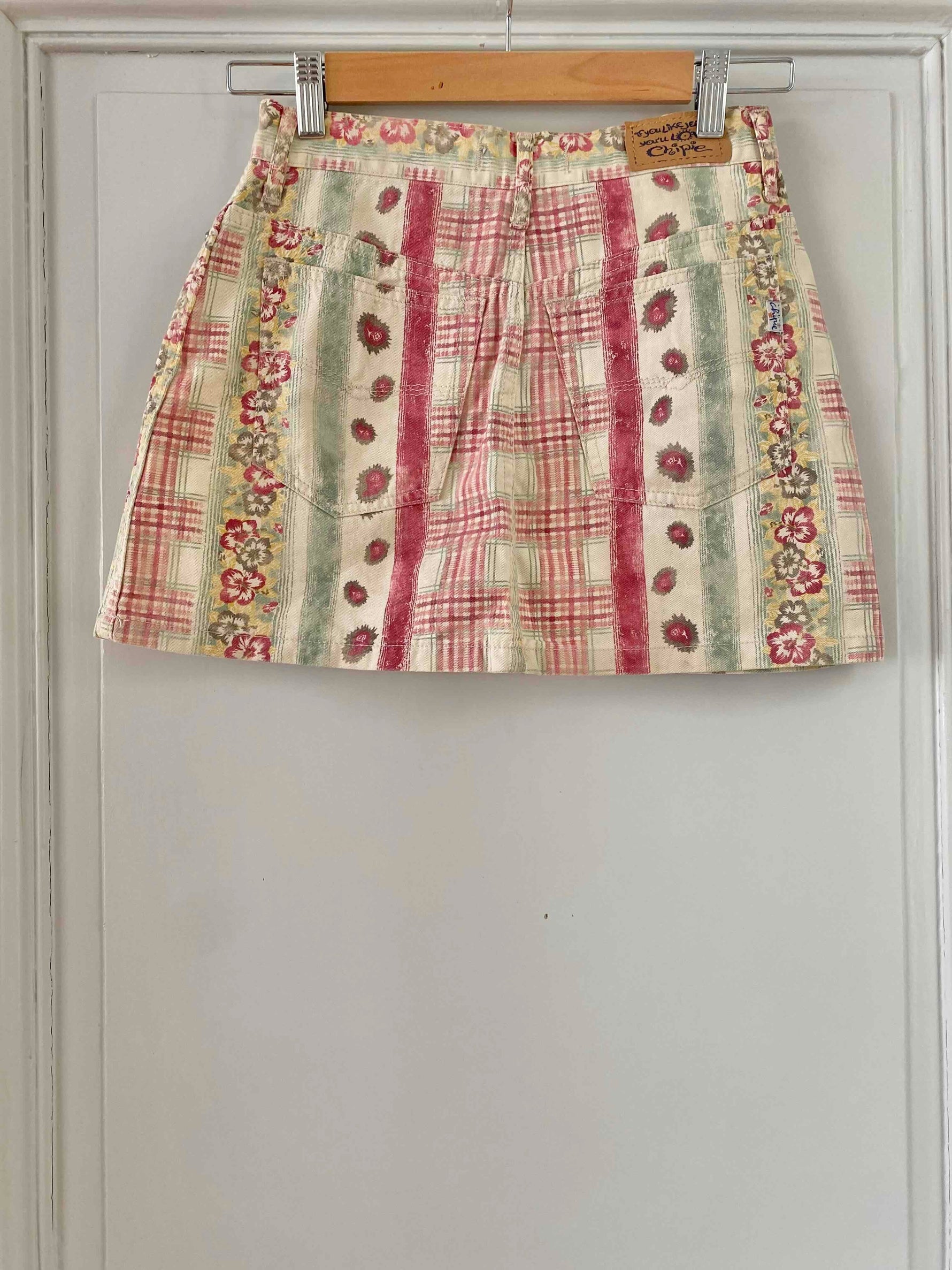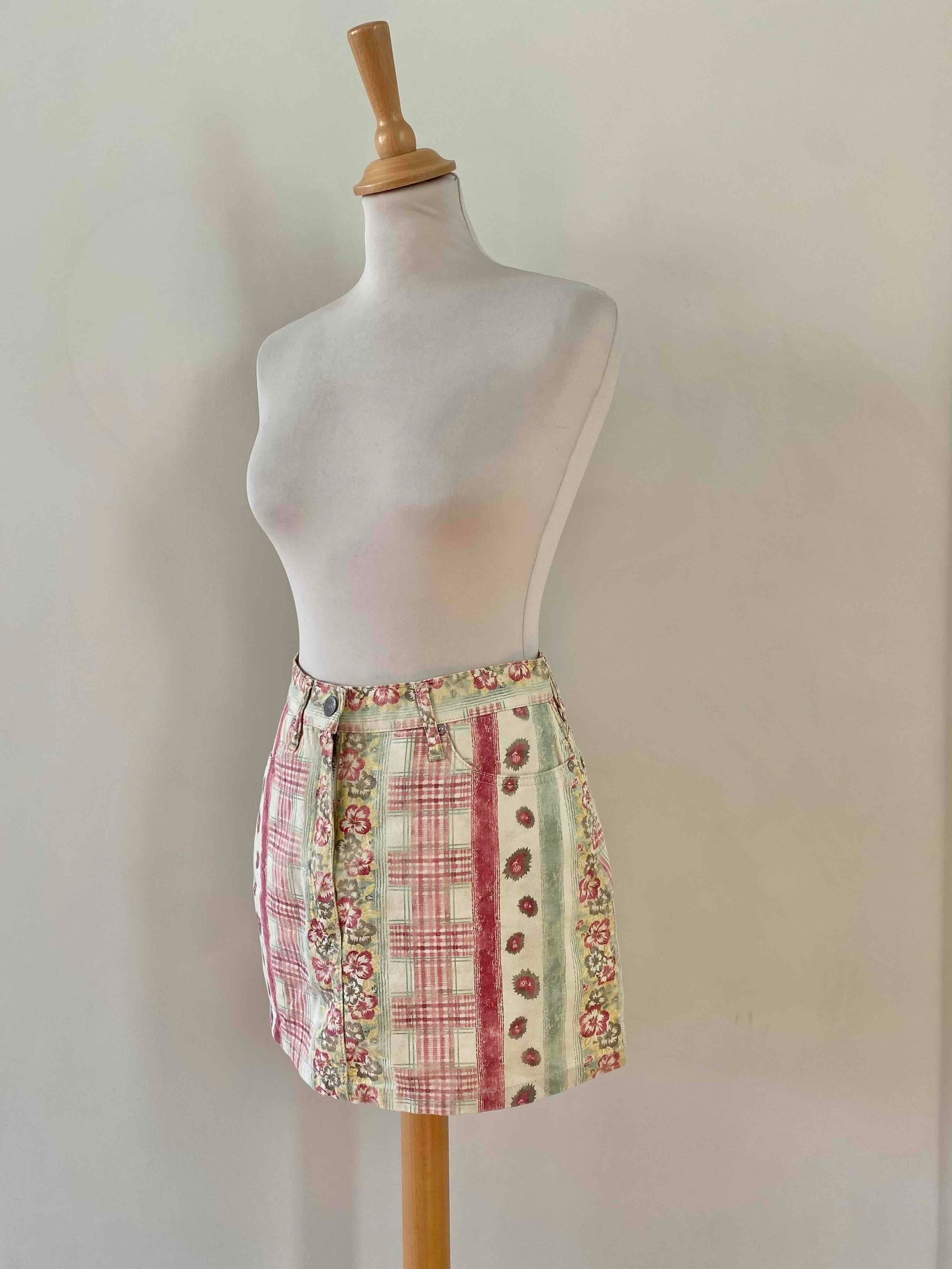 Prix unitaire parMini jupe denim patchwork, en 100% coton jeans imprimée fleurs, carreaux vichy et paisley, fabriquée en France, Chipie 90’s, taille 34 portée ici sur un mannequin T36.