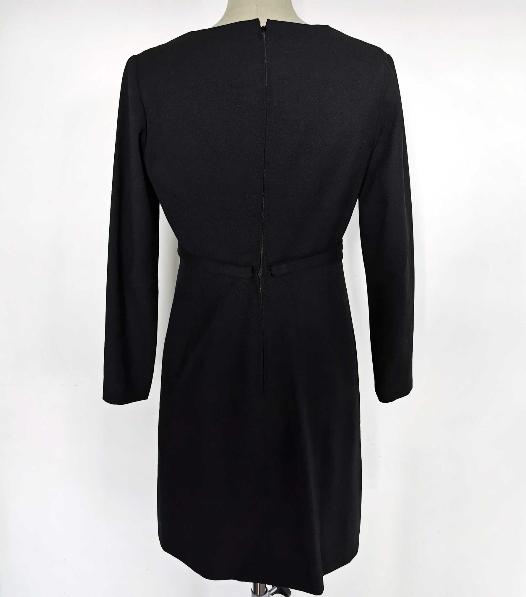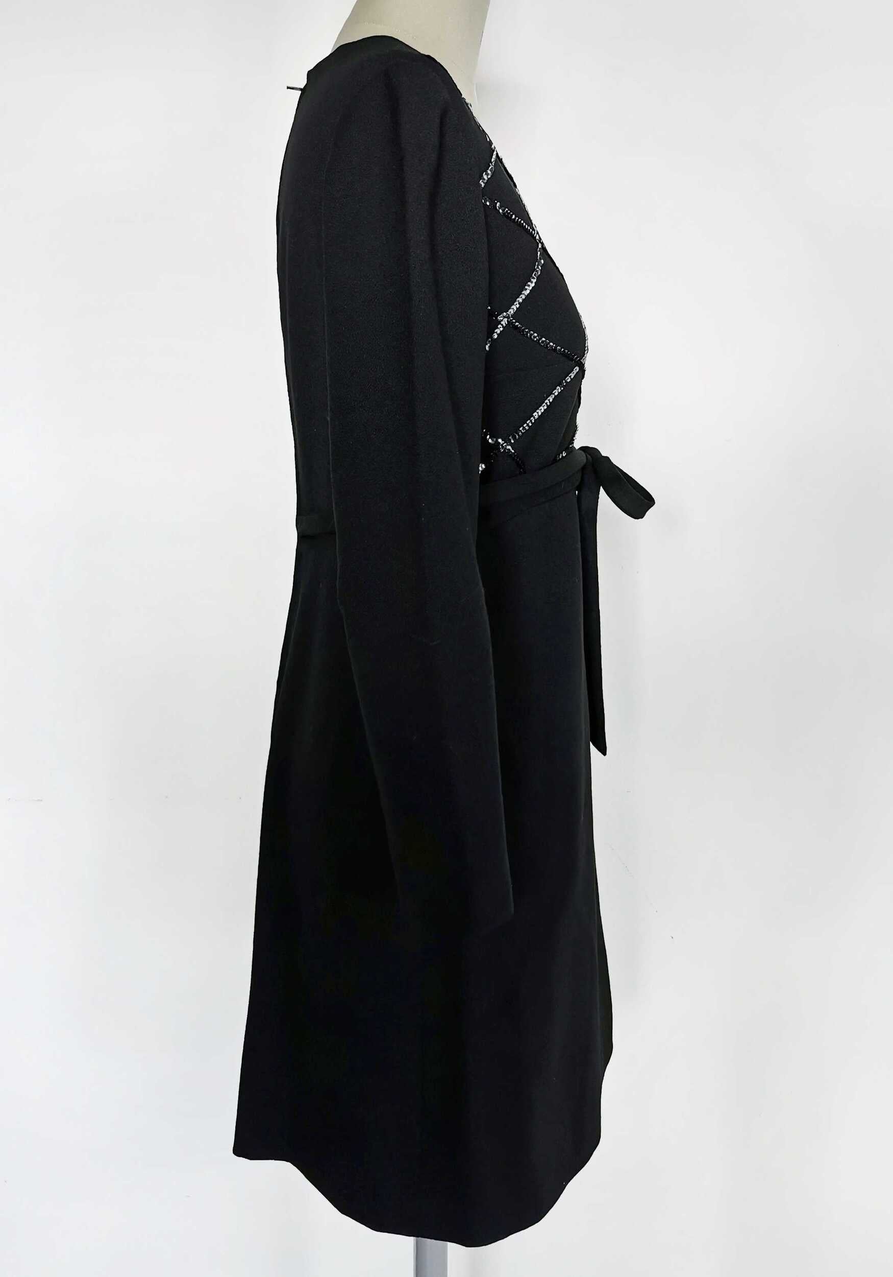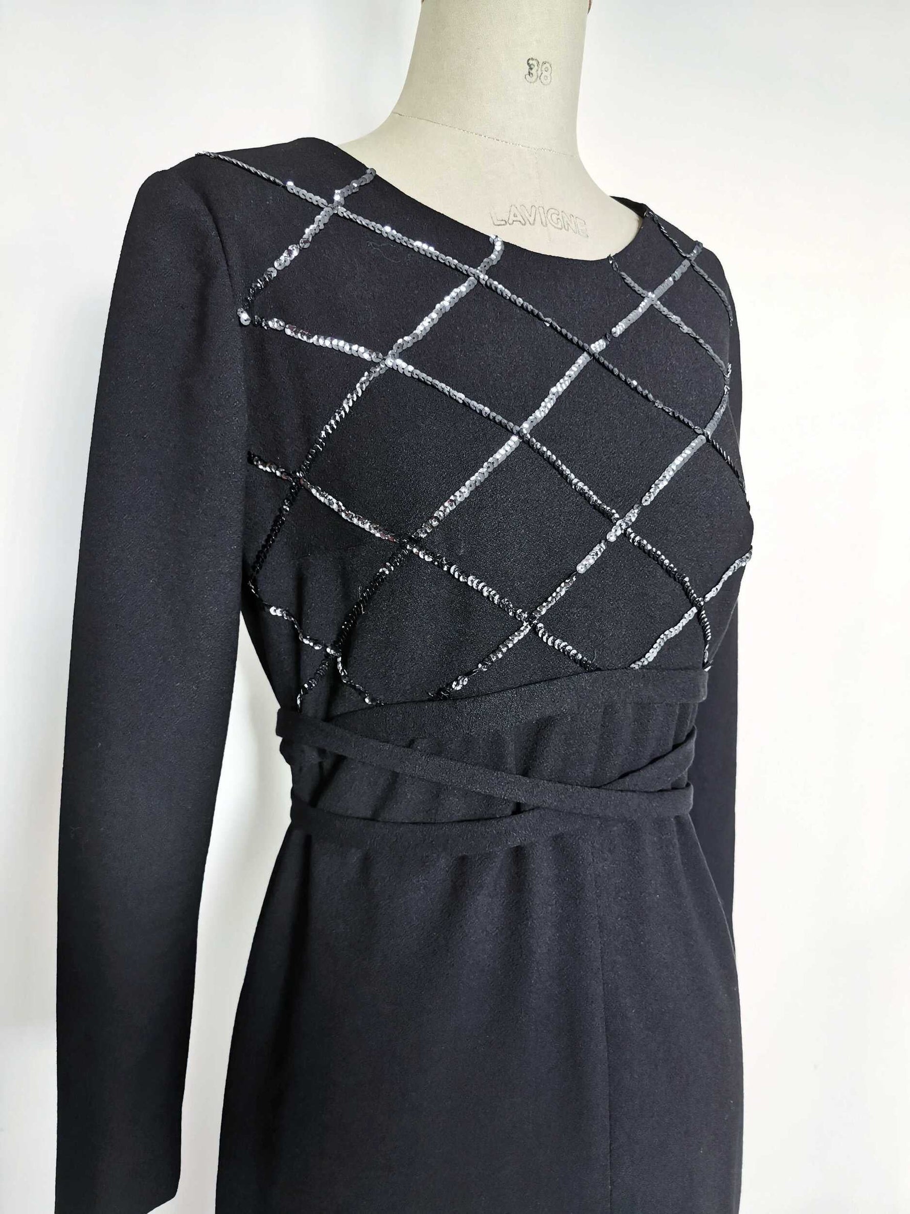 Prix unitaire parRobe en crêpe noire et broderie sequins anthracites. Taille Haute, Zip milieu dos, liens à nouer à la taille, doublure intérieur noire.