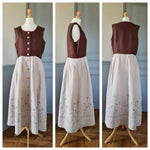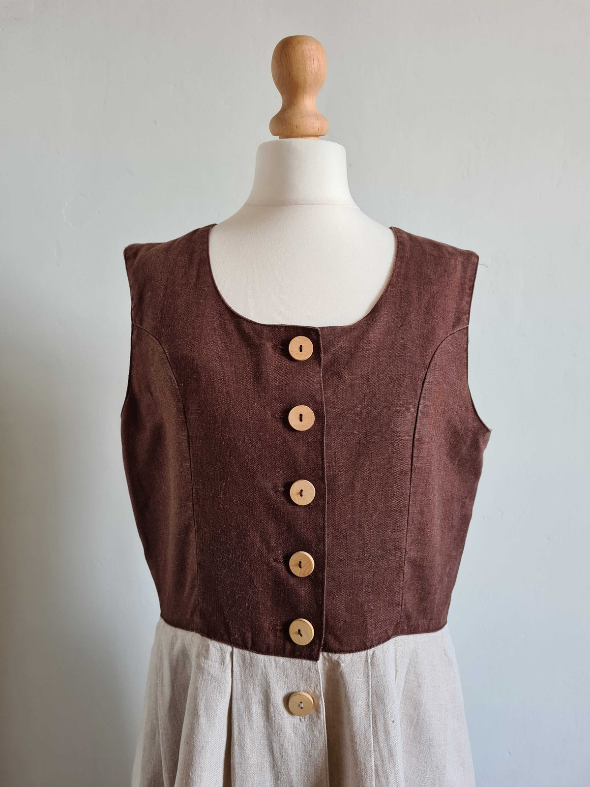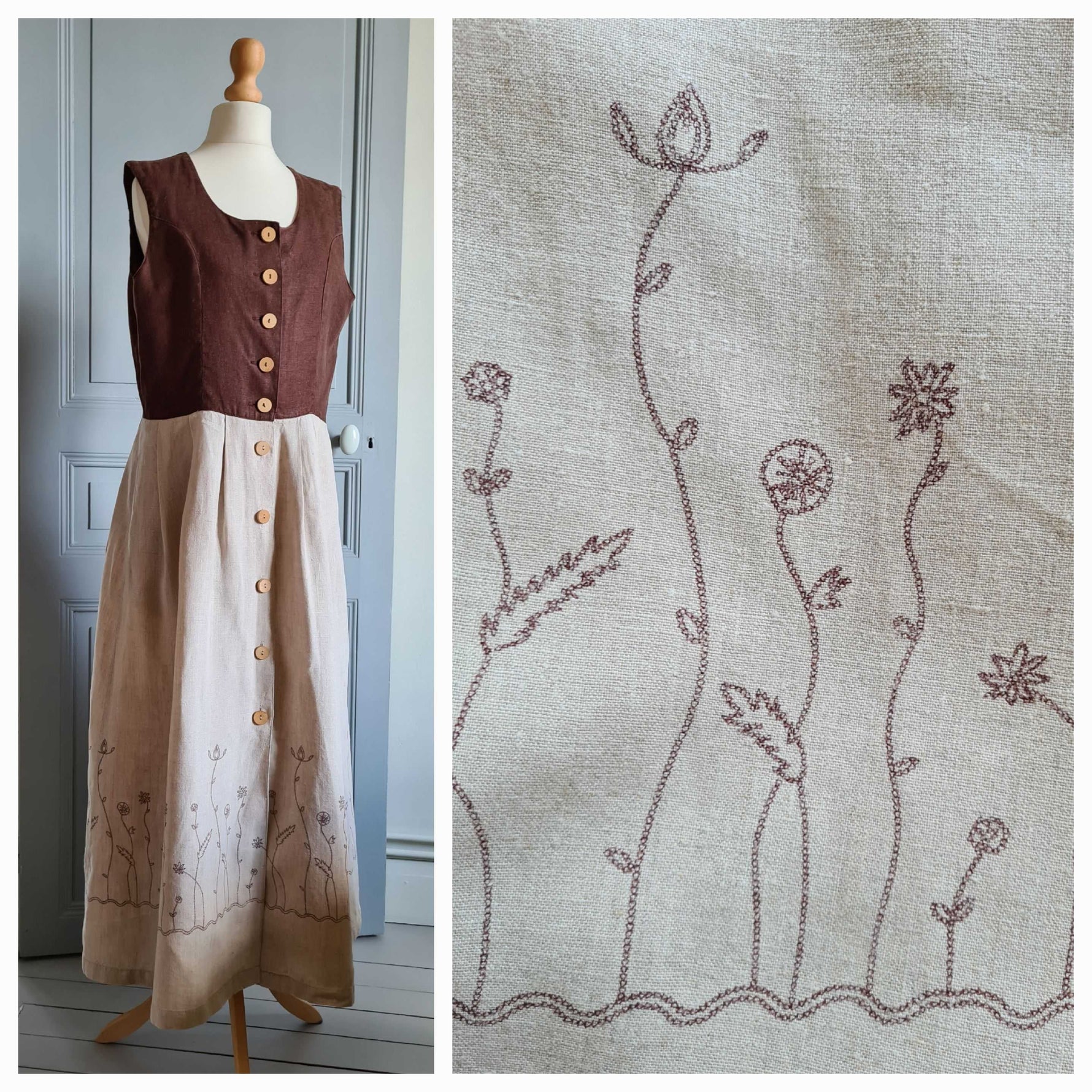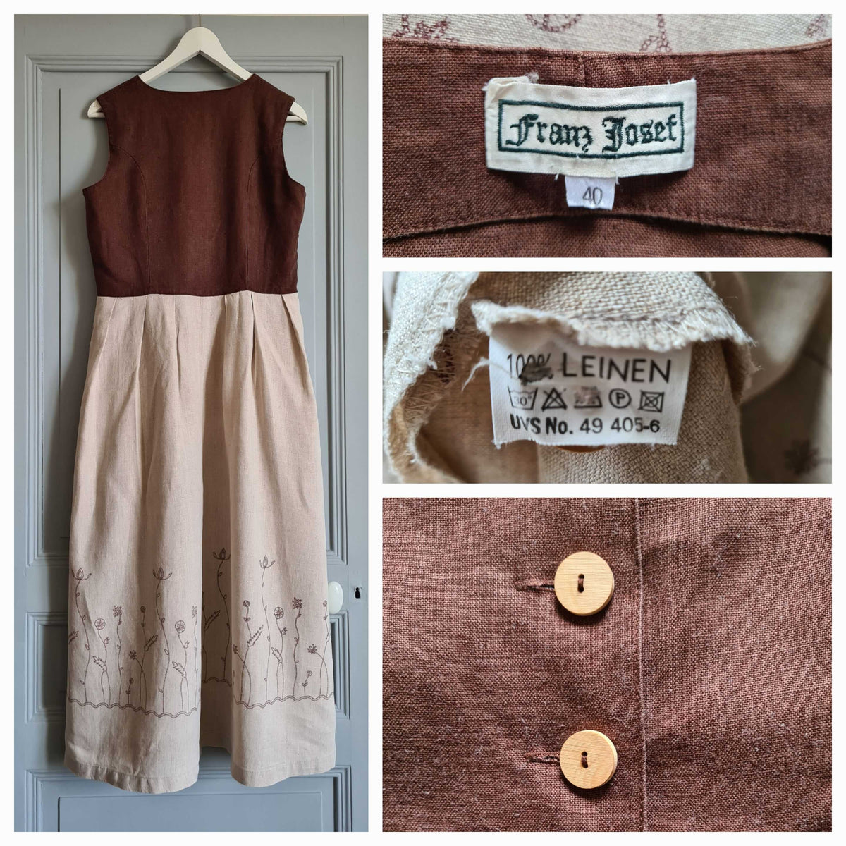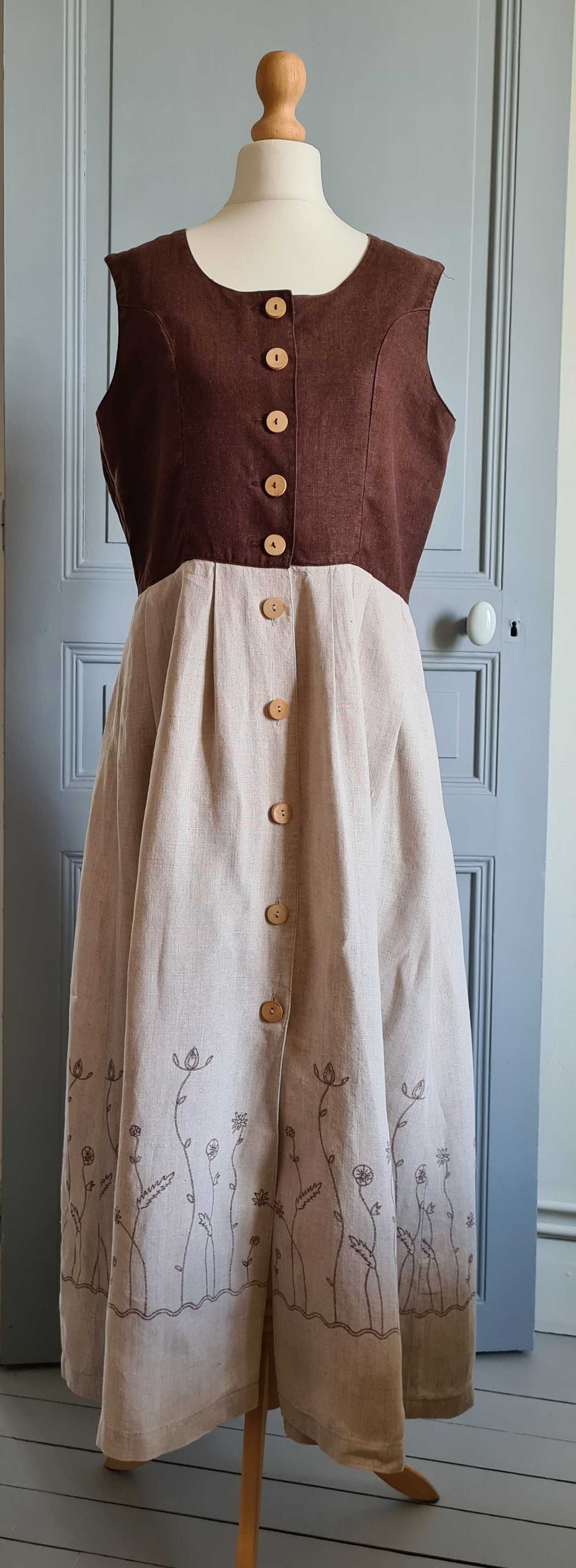 Prix unitaire parRobe autrichienne boutonnée, sans manches, corsage chocolat coupe princesse, jupon naturel à plis et broderie de fleurs imprimée. Taille haute marquée. Deux poches latérales invisibles. Grande boutonnière en bois brut. Pièce 100 % lin. Poitrine 48 cm.