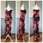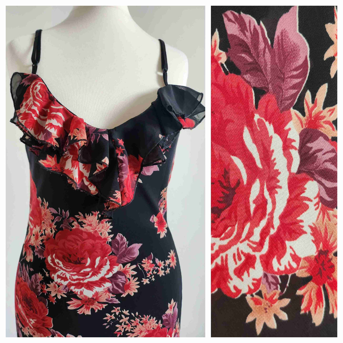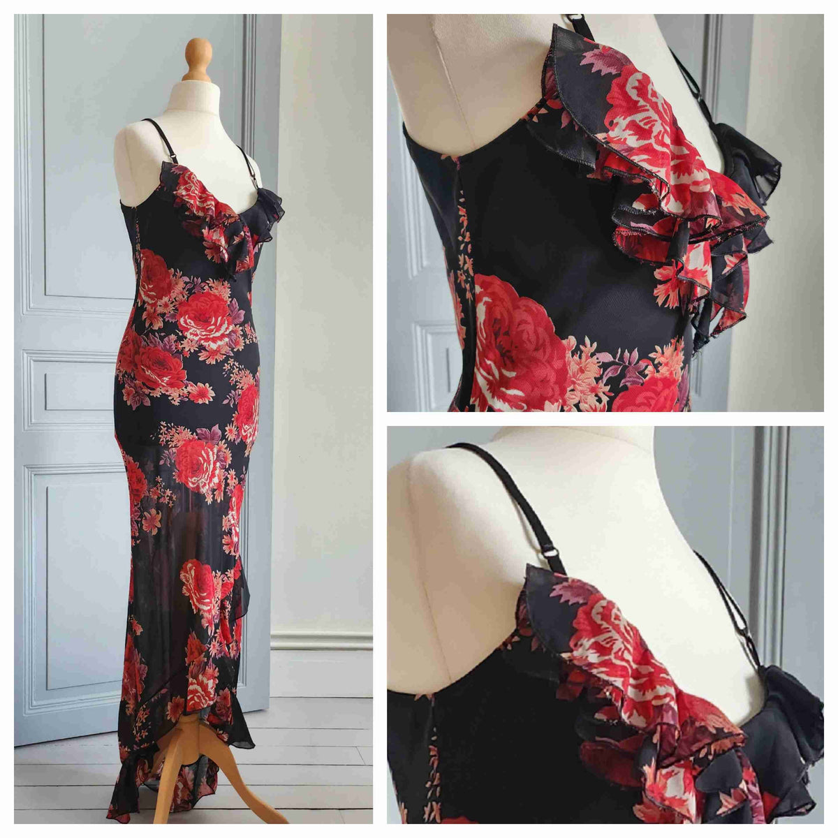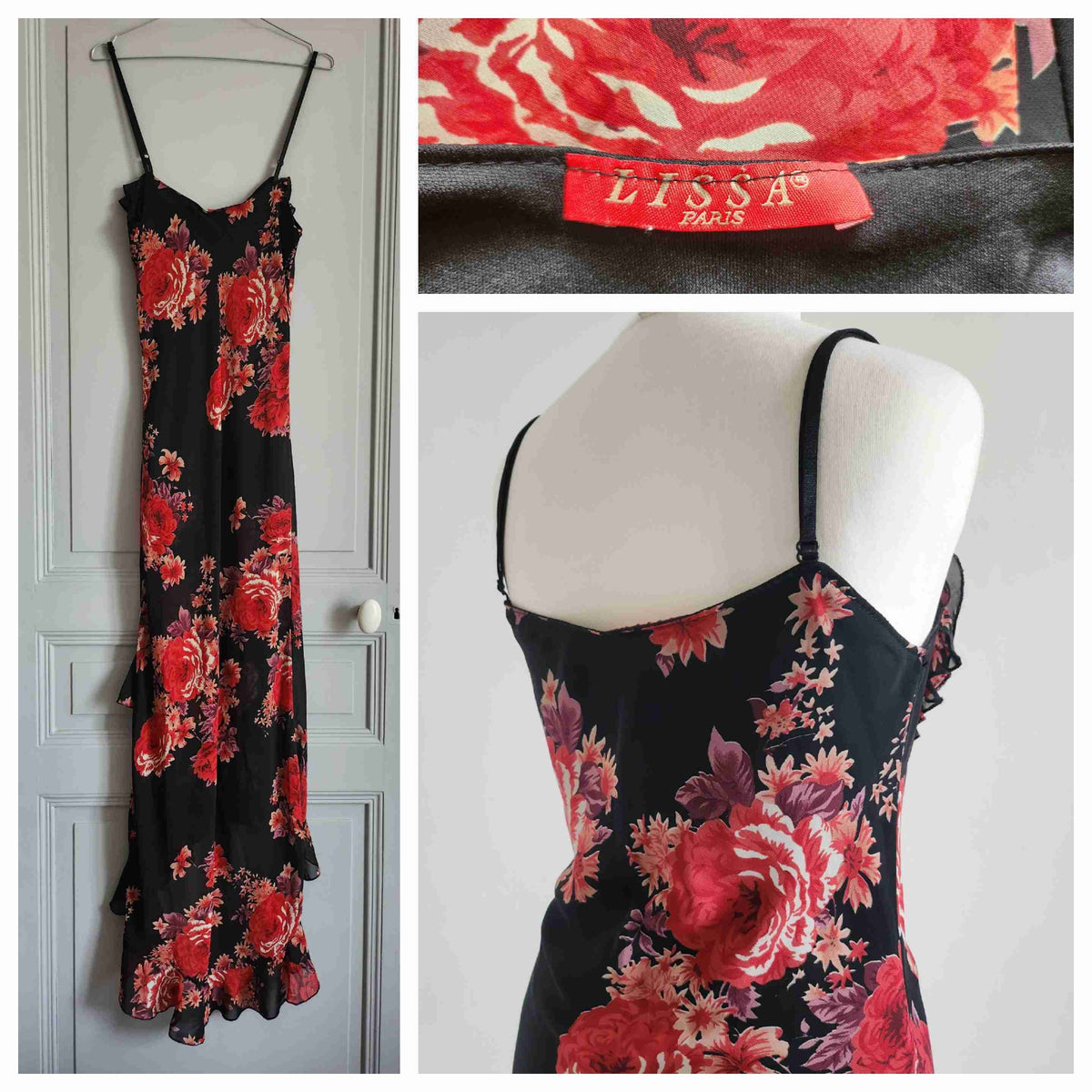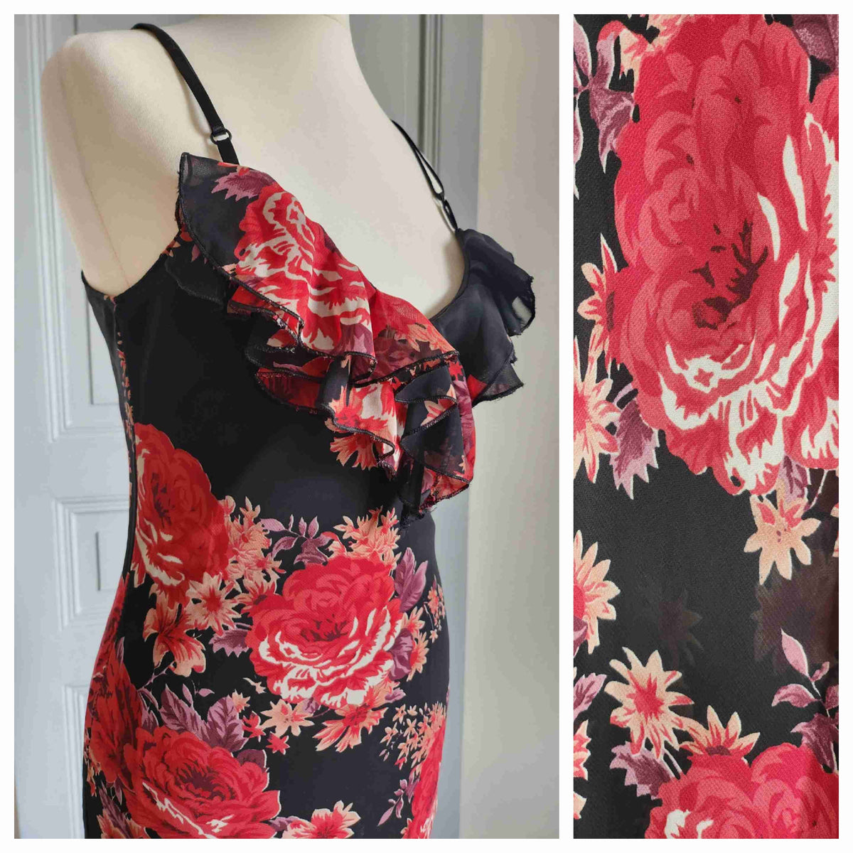 Prix unitaire parRobe longue à volants en voile viscose noir à fleurs rouge, corail et parme, bretelles spaghetti réglables, doublée jusqu aux hanches, coupe fit and flare, décolleté et base asymétrique volantés. Poitrine 40 cm.
