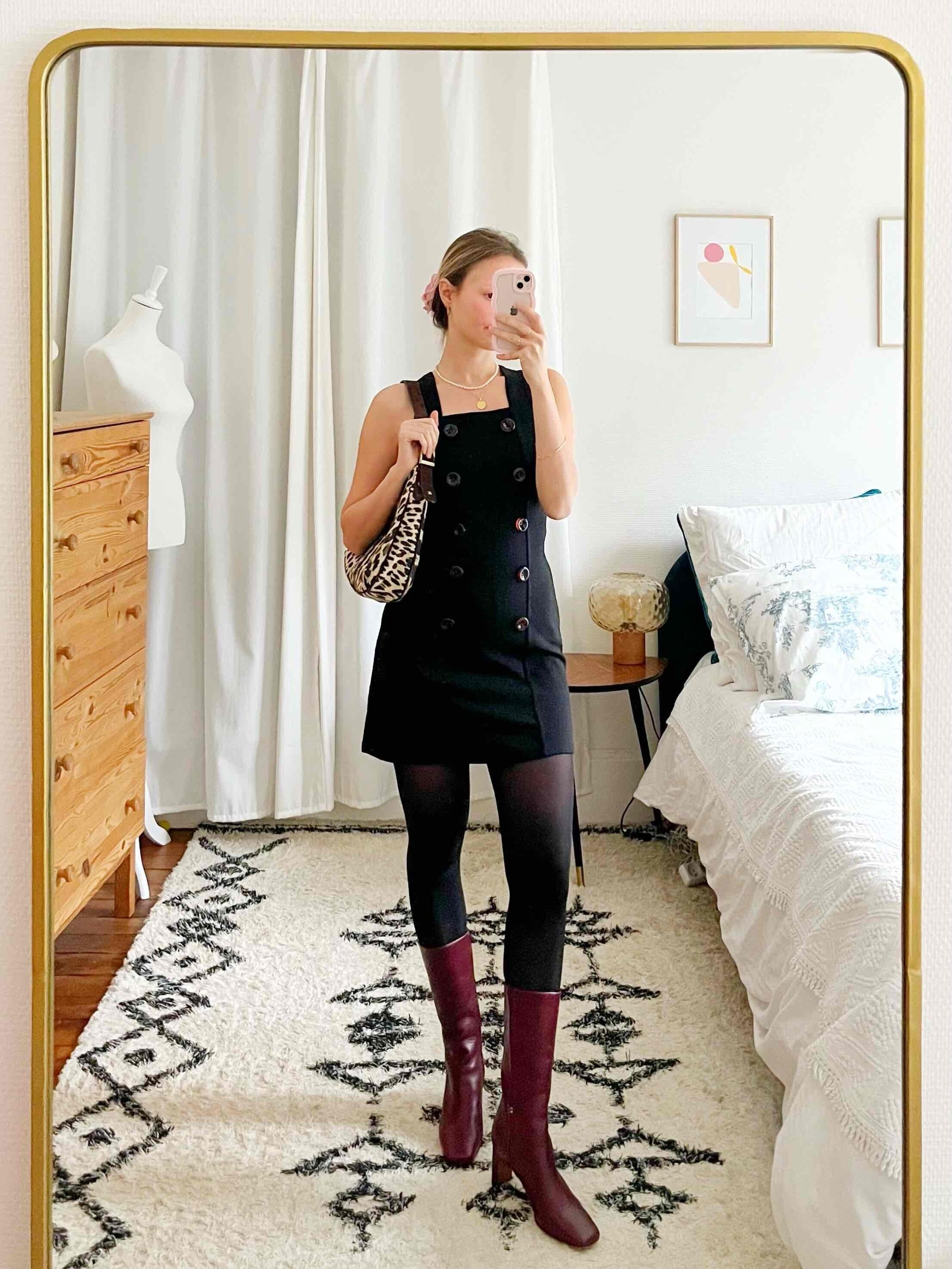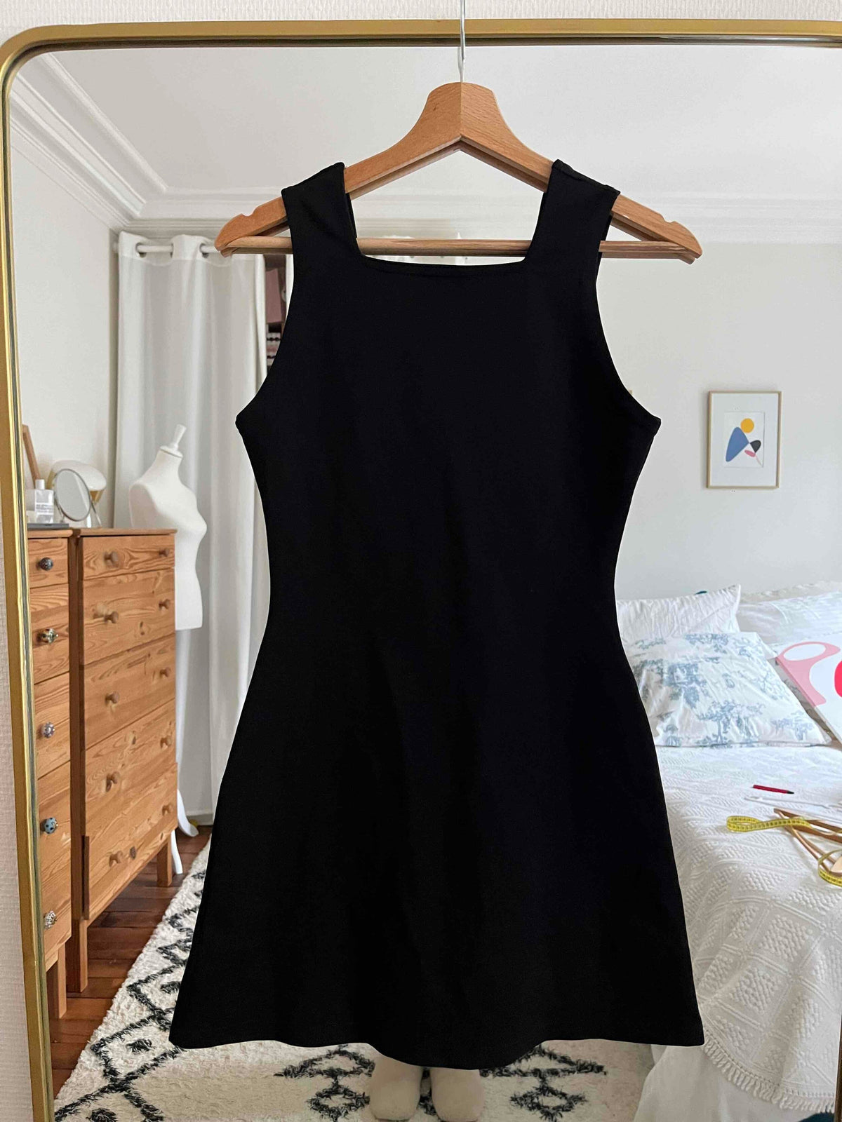 Prix unitaire parRobe mini noire, made in France, tissu stretch non transparent, bouton marrons décoratifs, portée ici sur une T36 pour 1m64
