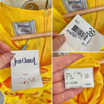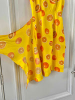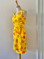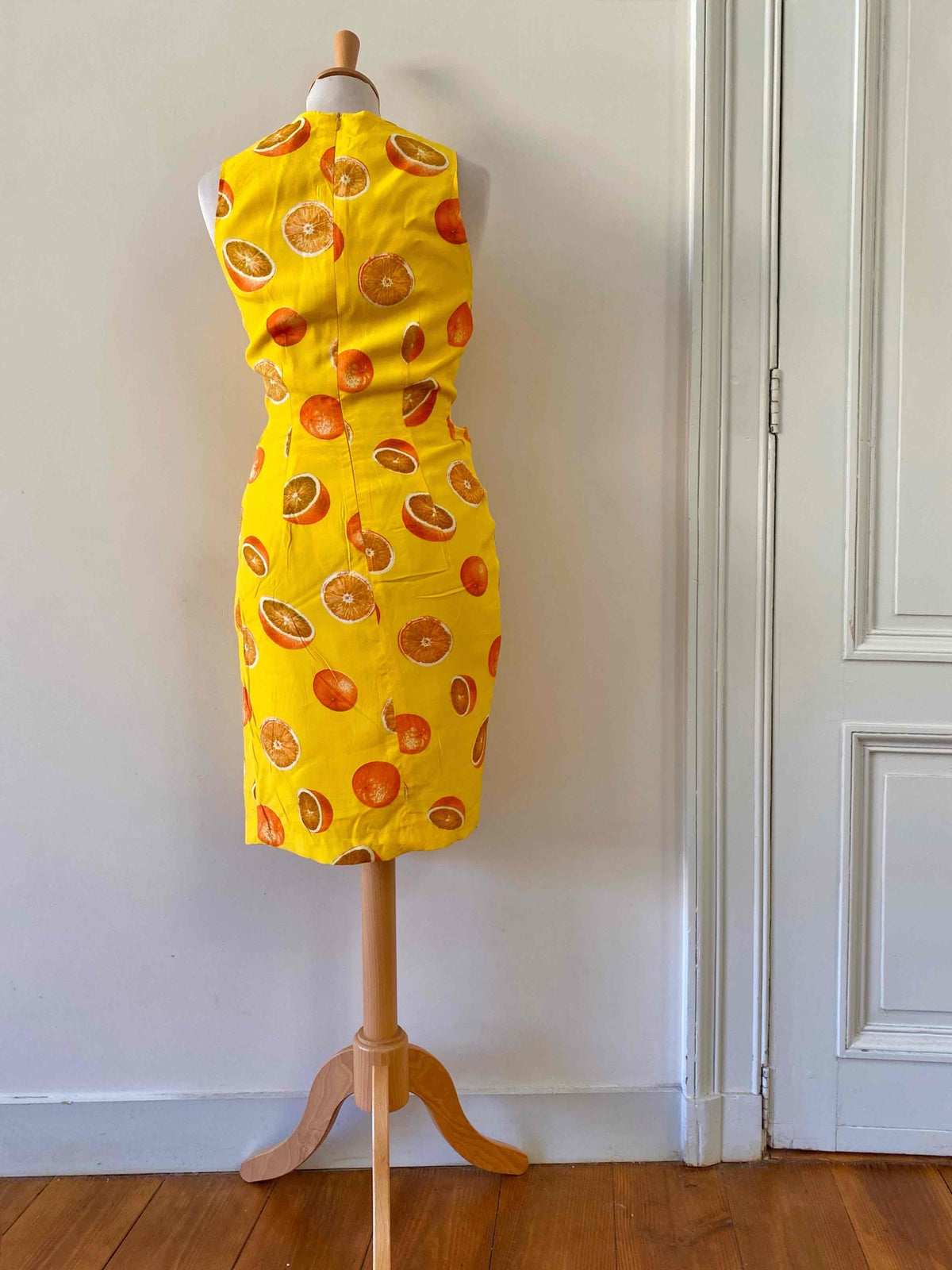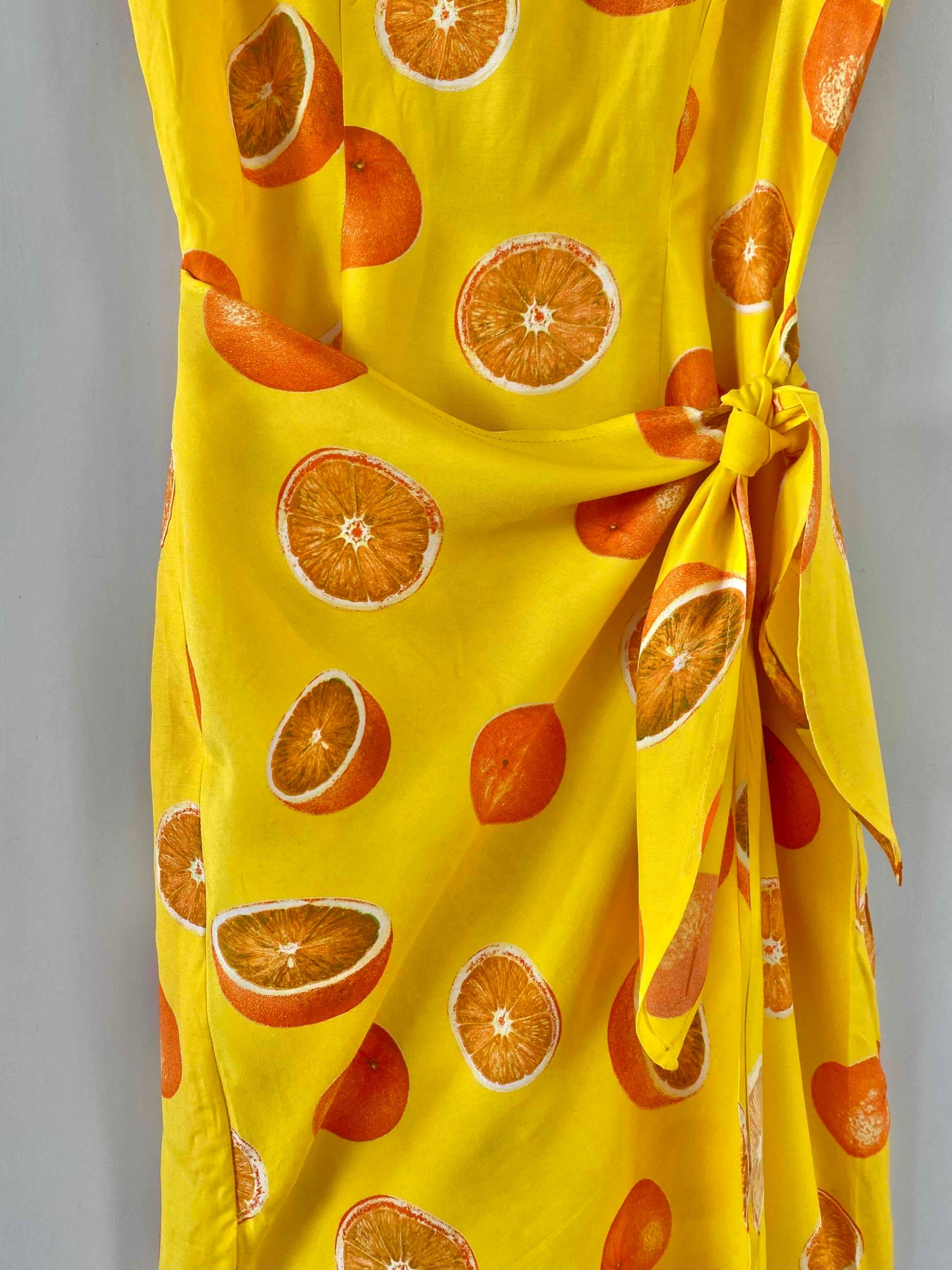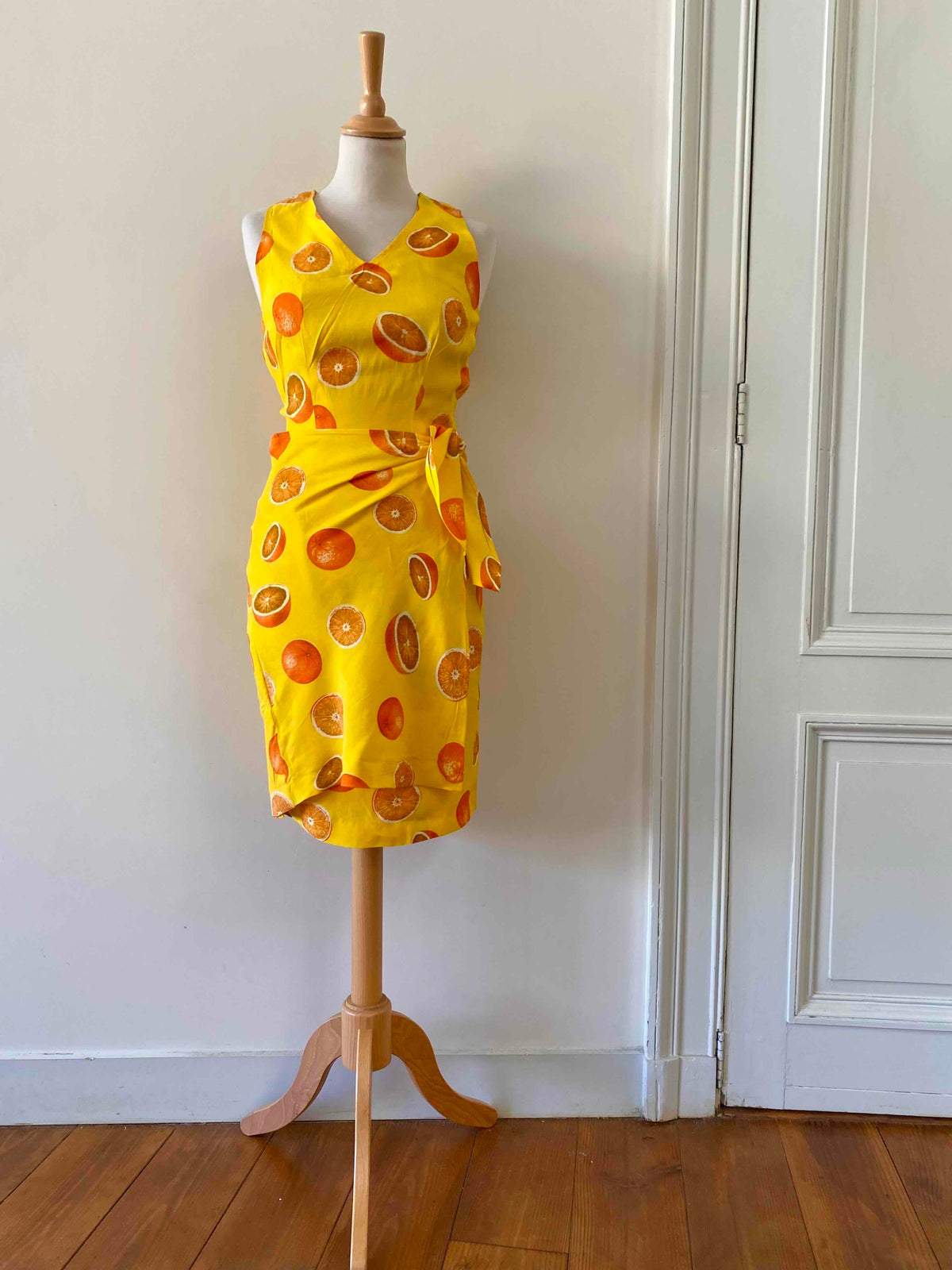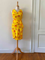 Prix unitaire parRobe portefeuille agrumes, en viscose jaune imprimée oranges, agrumes, pamplemousses, pan à nouer drappé effet paréo, deadstock années 90, fabriquée en France, taille 34 et 36 portée ici sur un mannequin T36.