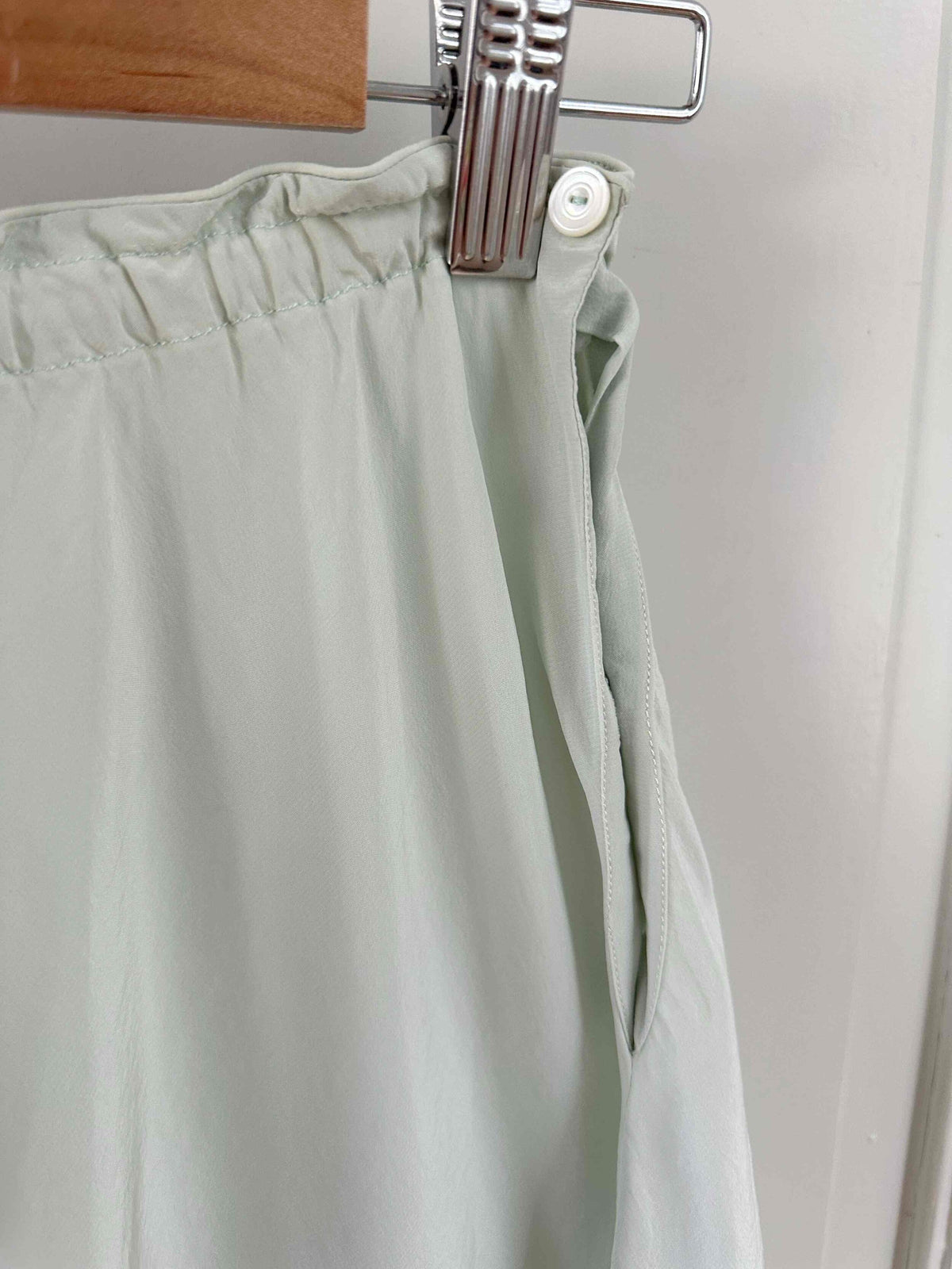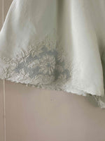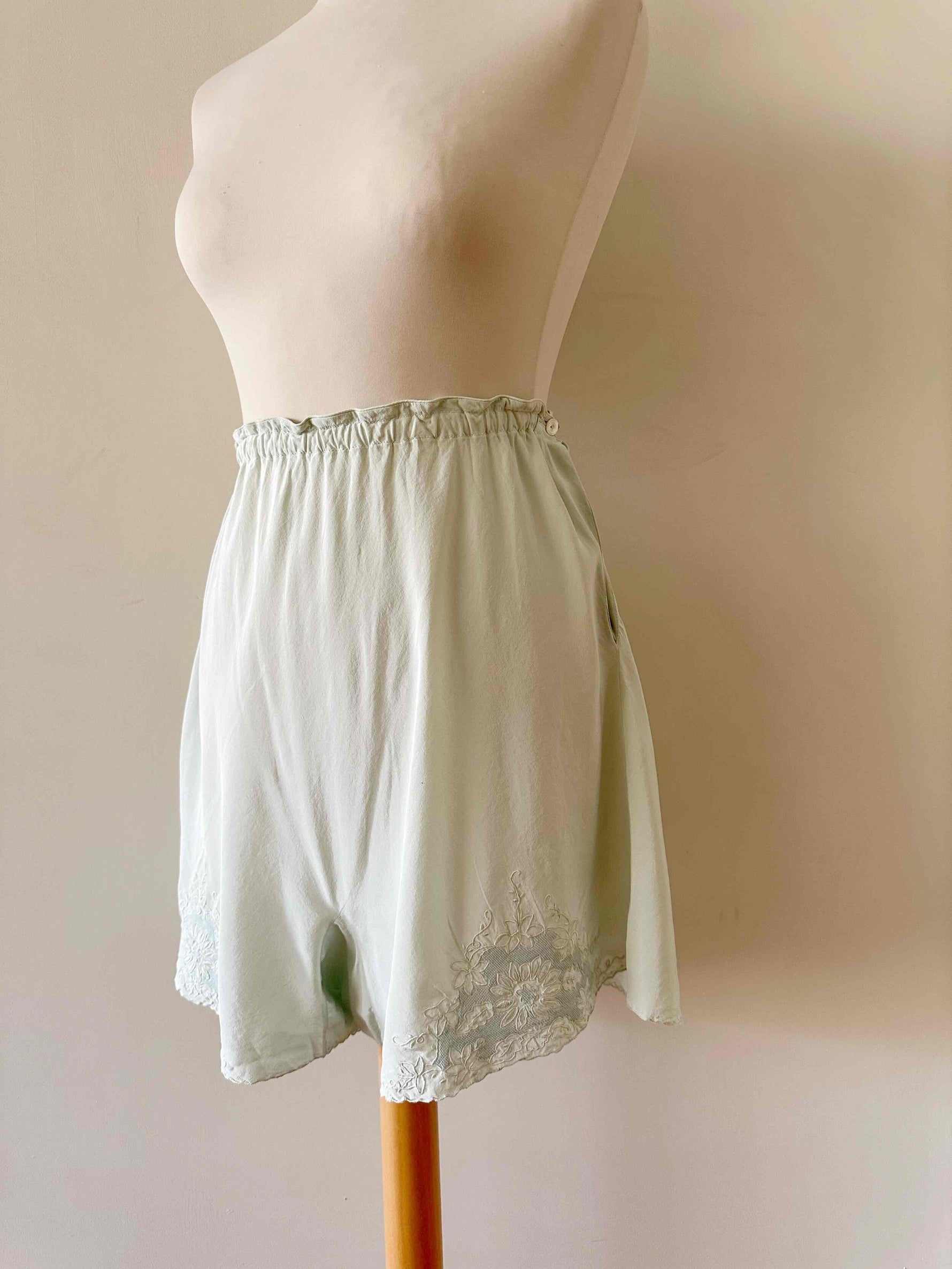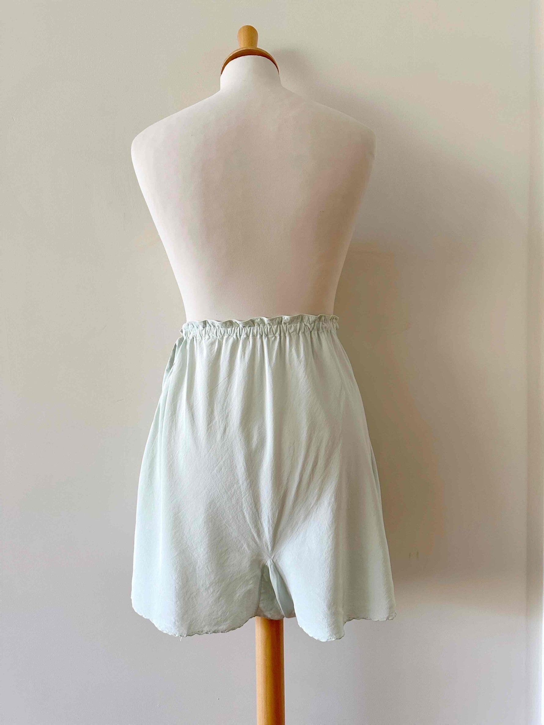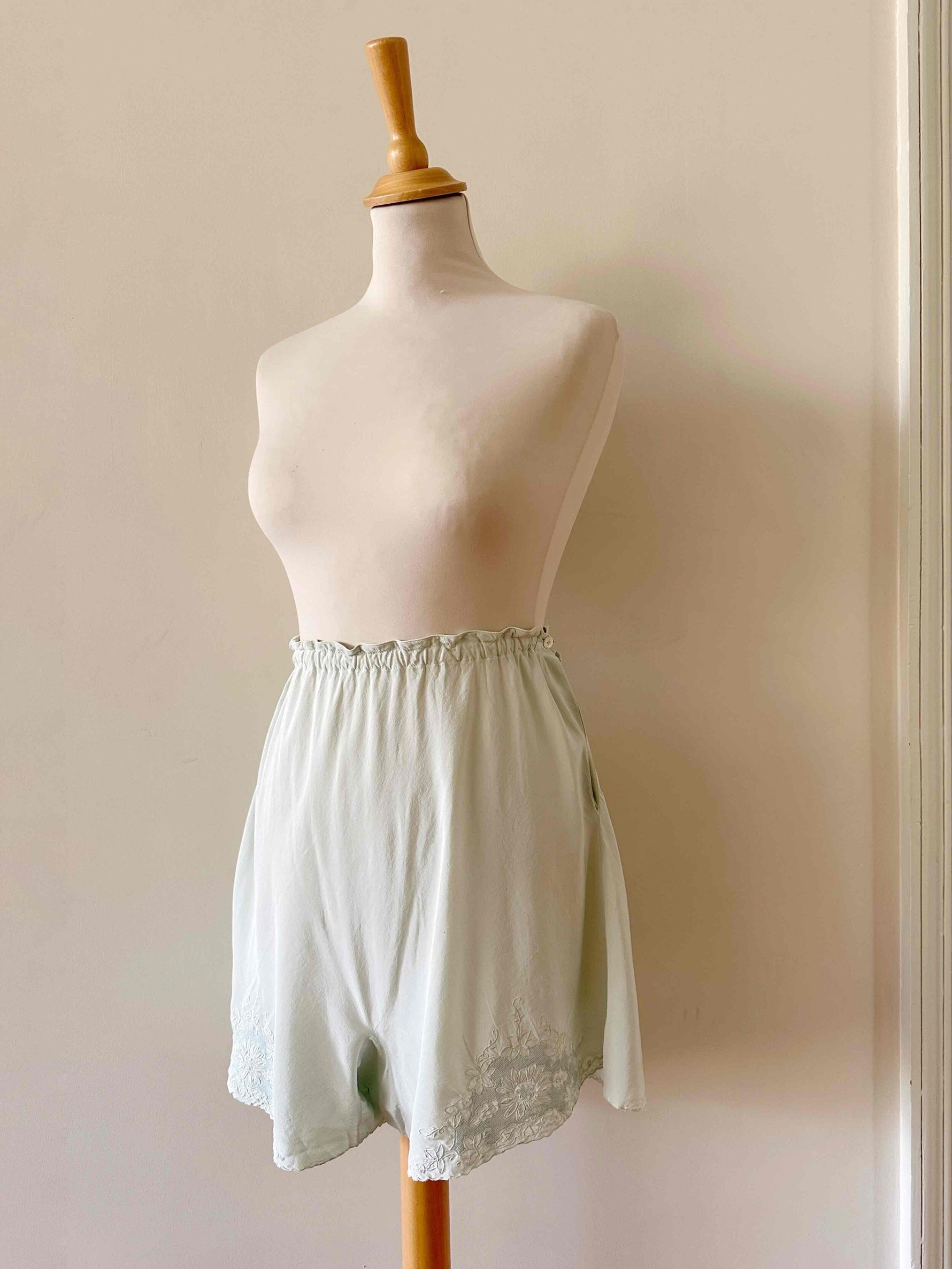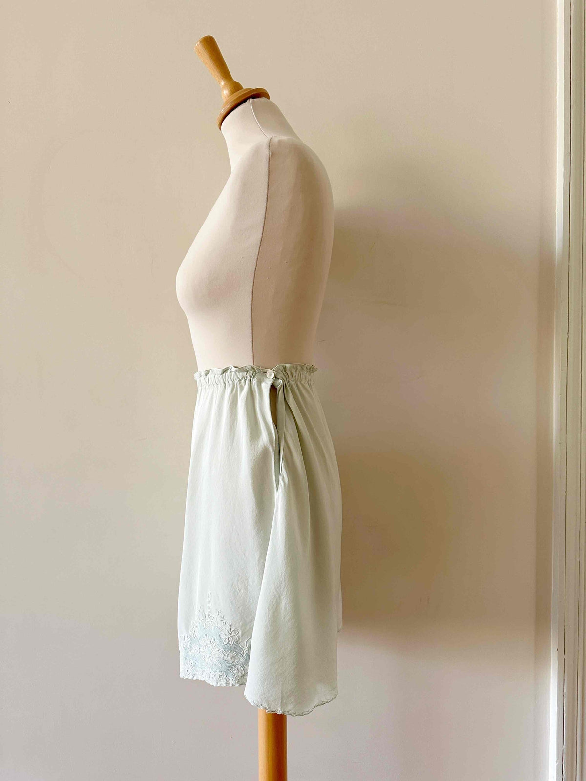 Prix unitaire parShort en soie, 100% soie vert d’eau, bas de jambes brodés de fleurs ajourées, taille élastique et à boutonner sur le côté, forme bloomer, années 80s, taille 36, porté ici sur un mannequin T36.