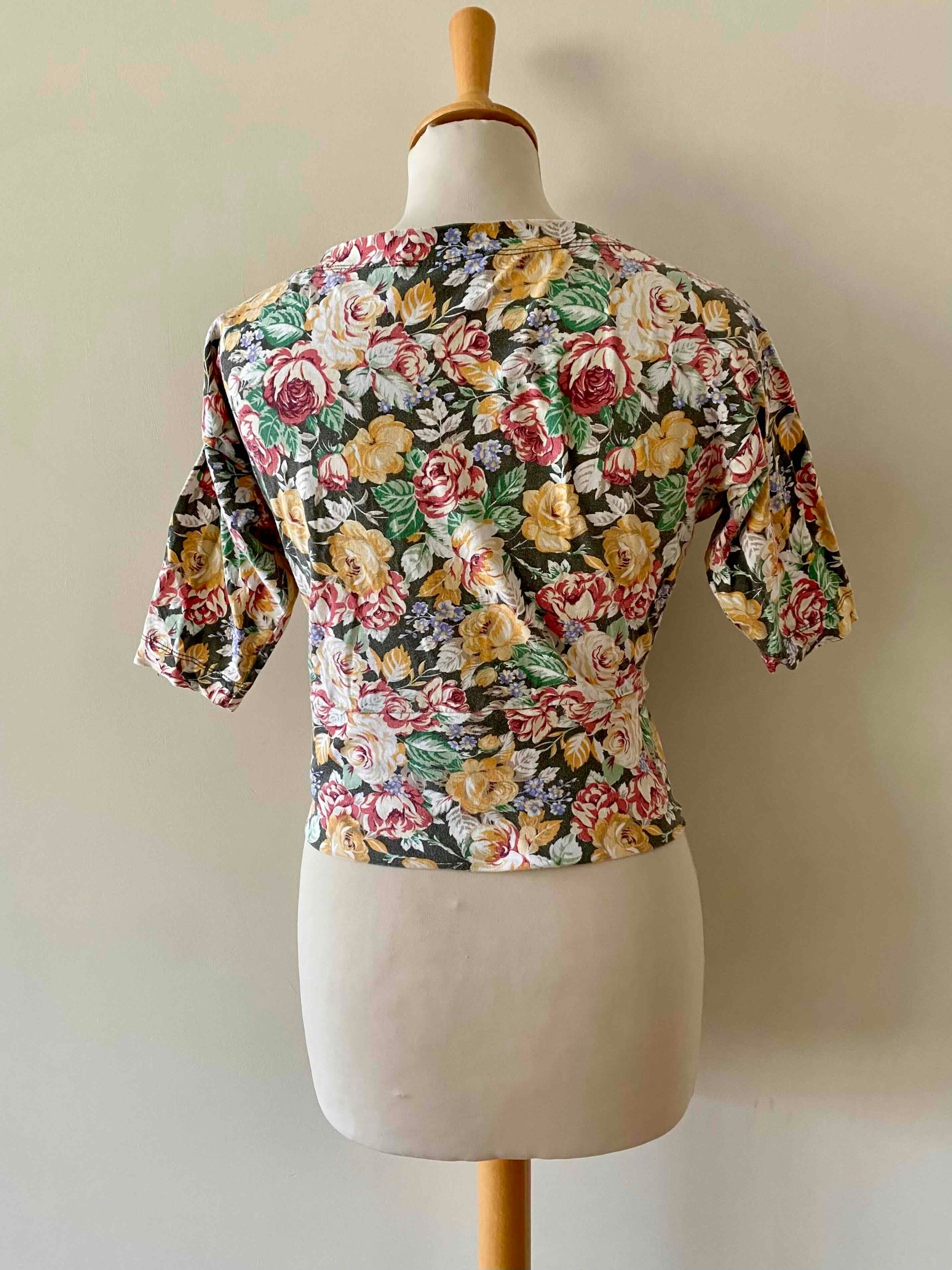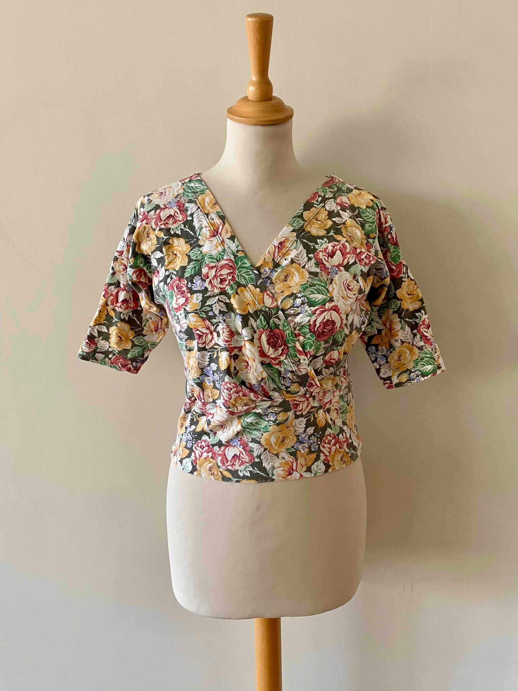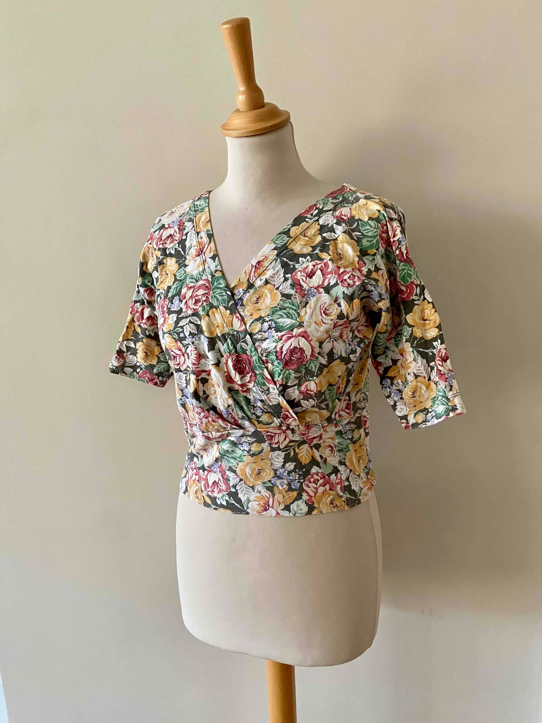 Prix unitaire parT-shirt Cache-coeur fleuri, en coton elasthanne, forme cropped, manches coudes, imprimée fleurs multicolores pastels, fabriqué en France, années 90’s, taille 34 et 36 porté ici sur un mannequin T36.