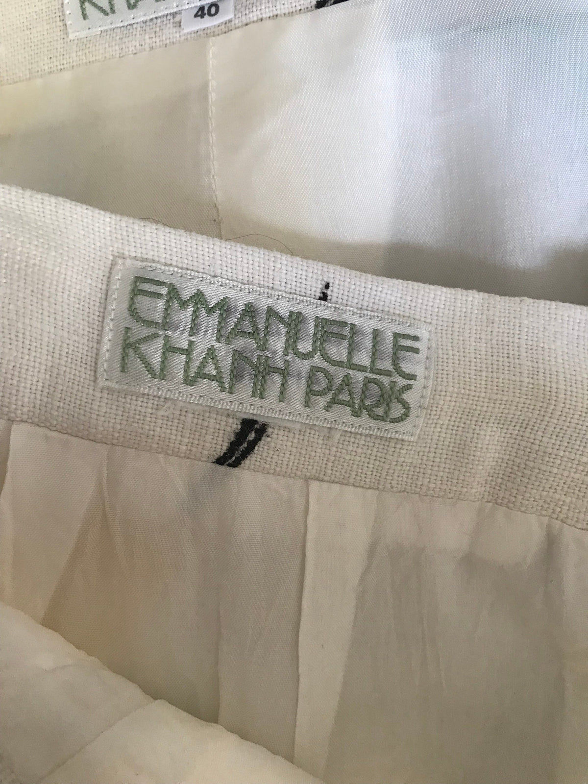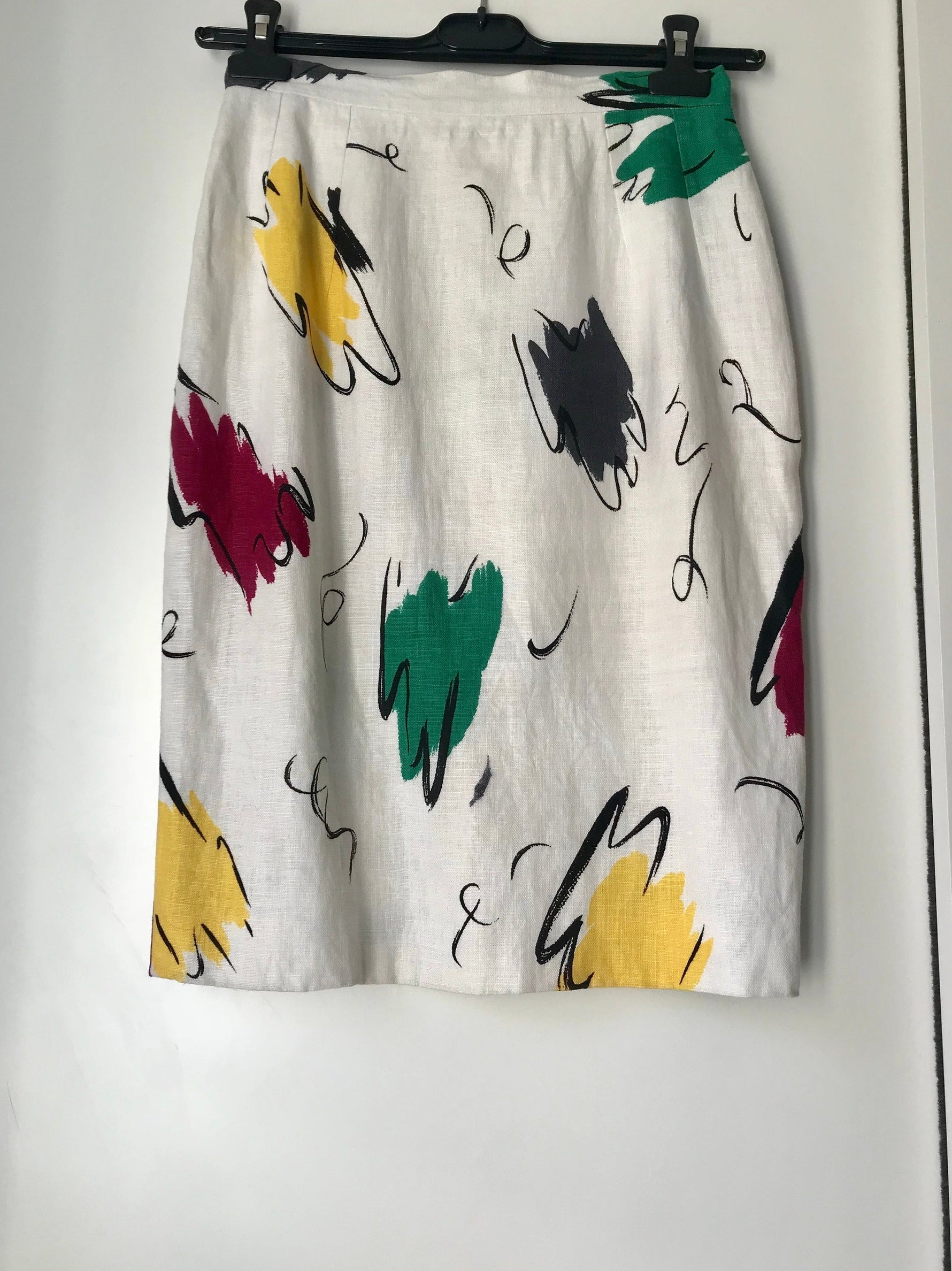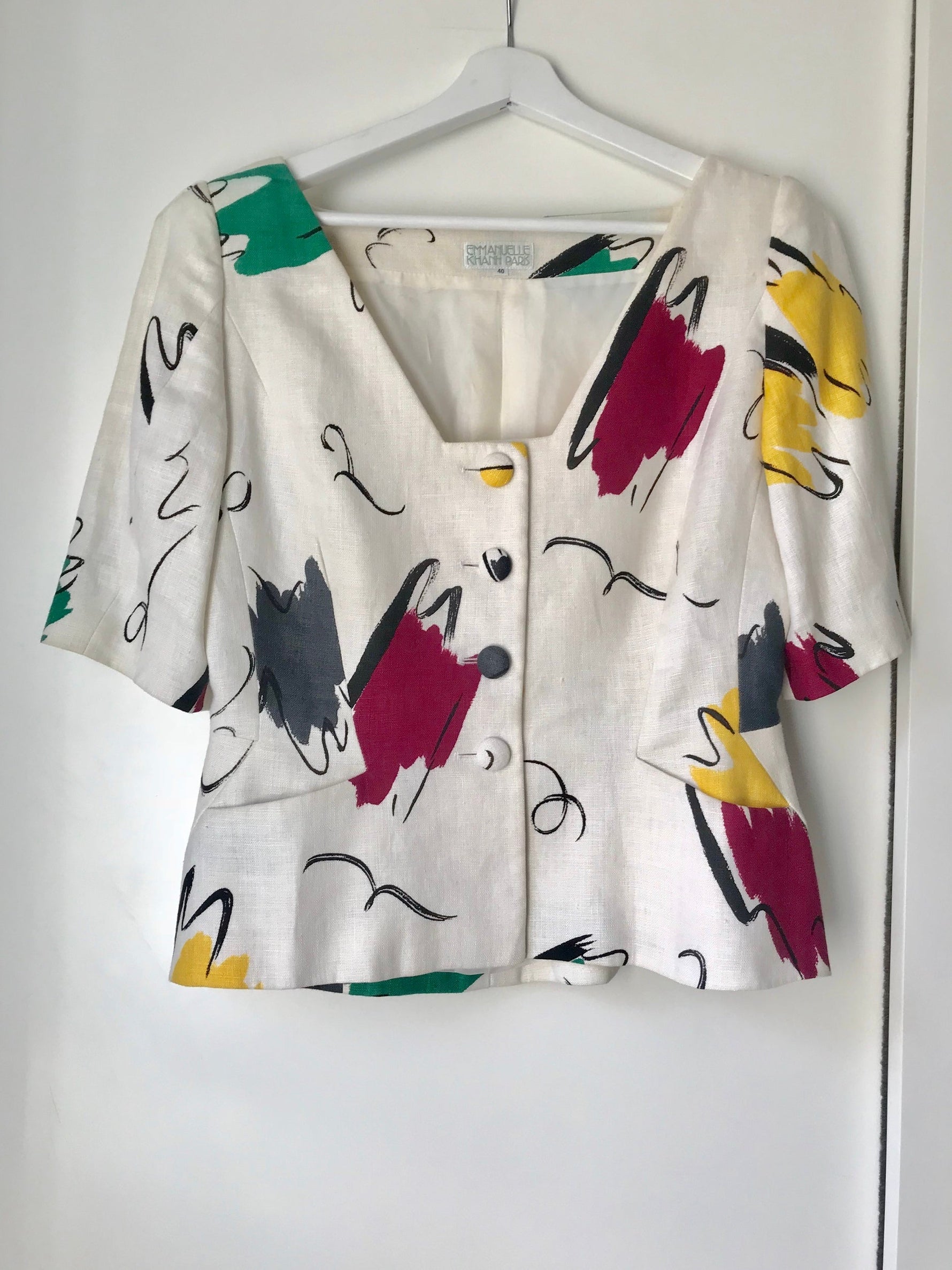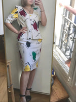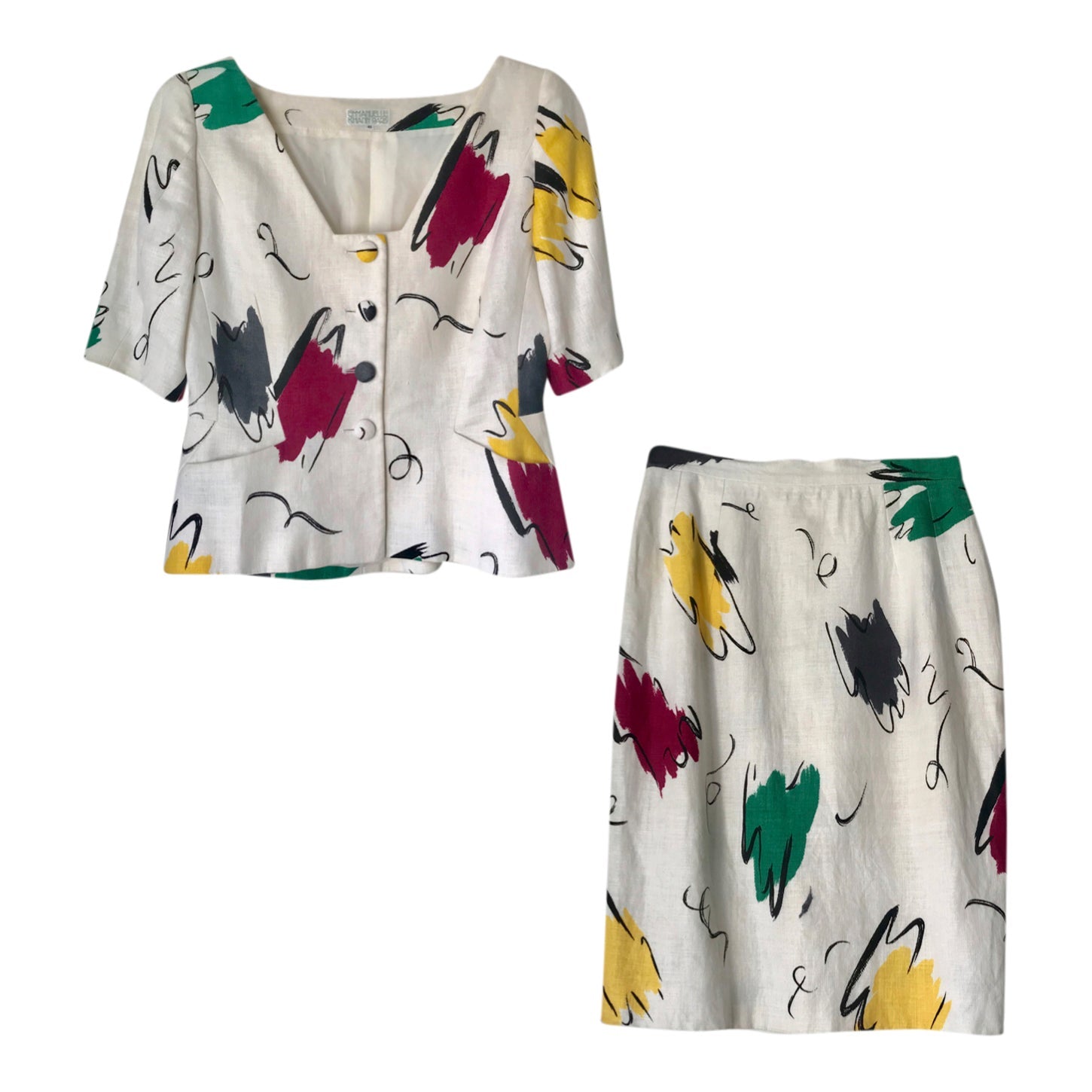 Prix unitaire parEnsemble en lin blanc cassé avec des motif coloré années 80s. Composé d'une jupe tailleur et une blouse à manches courtes / Veste.